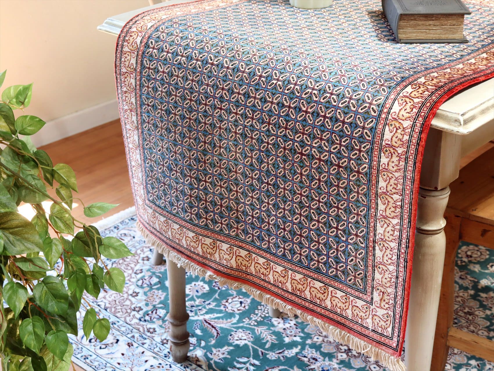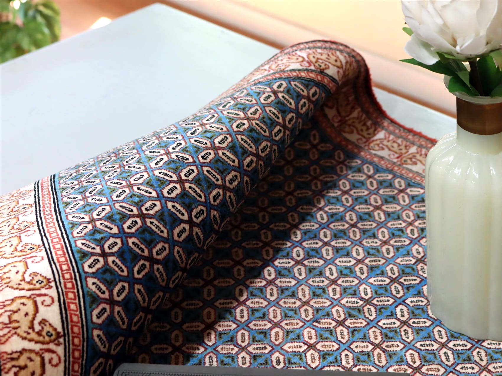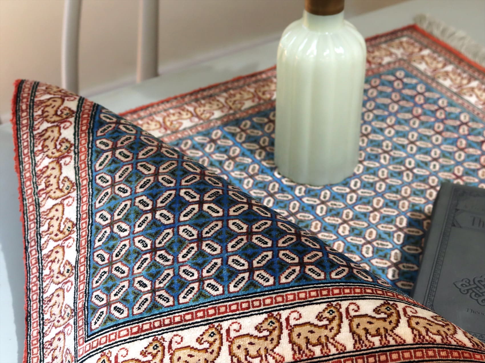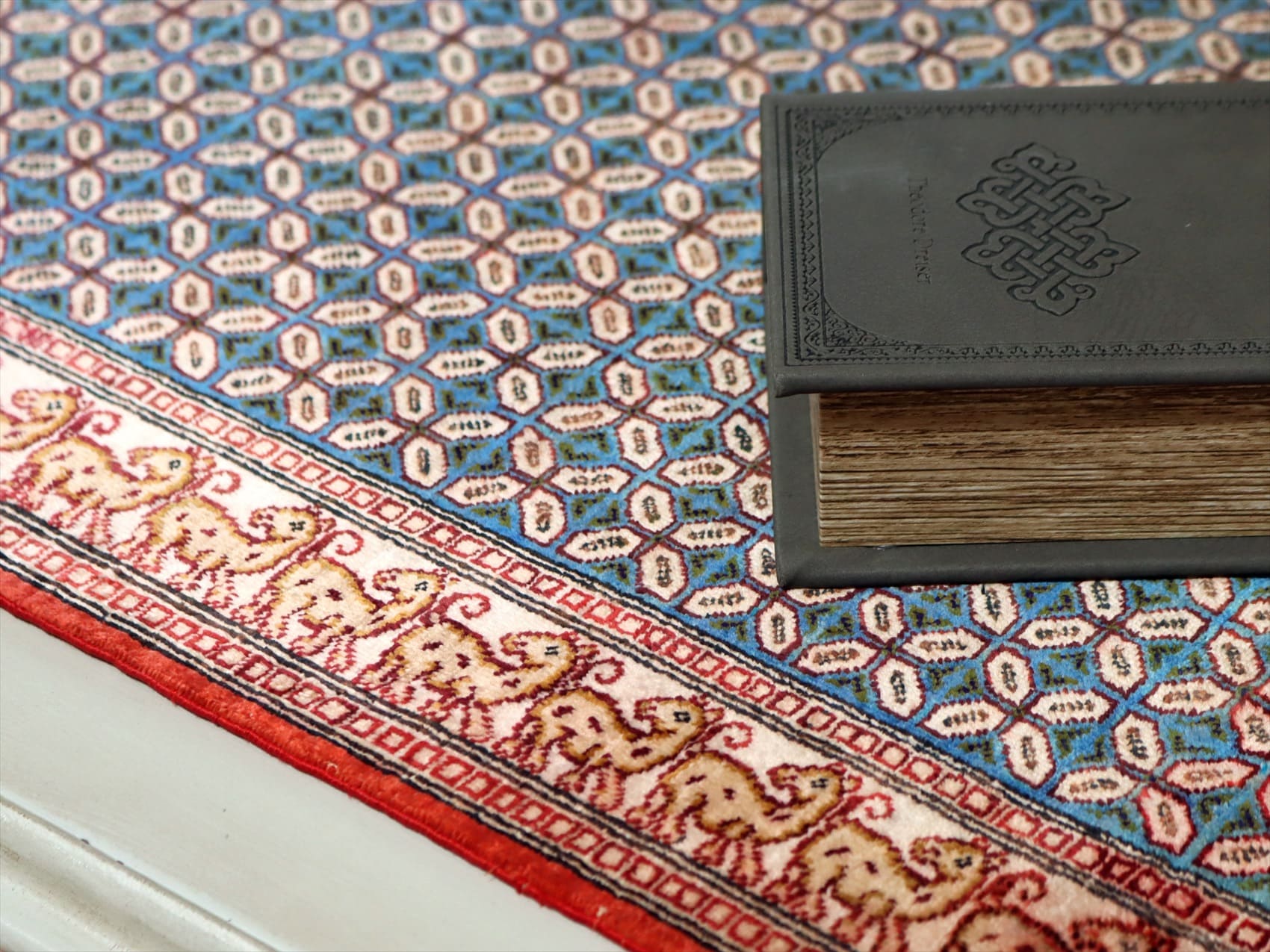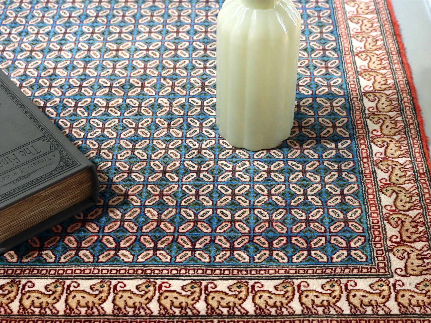 | 全面シルクの光沢が美しいコム産の絨毯です。息をのむような美しさのターコイズブルーの地には幾何学模様、アイボリーの額縁には動物が織られています。 |