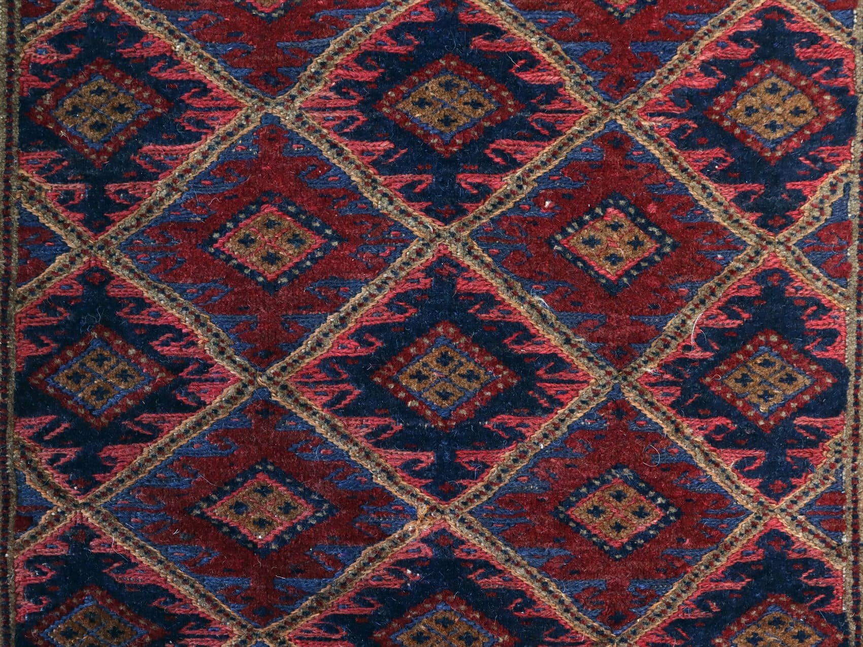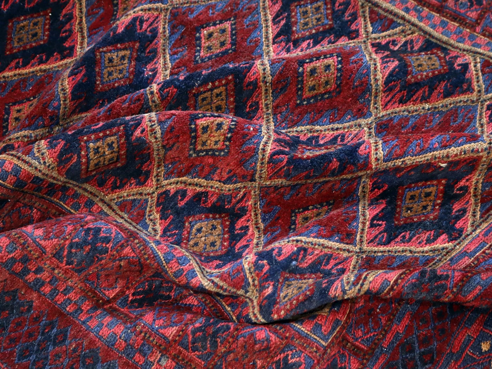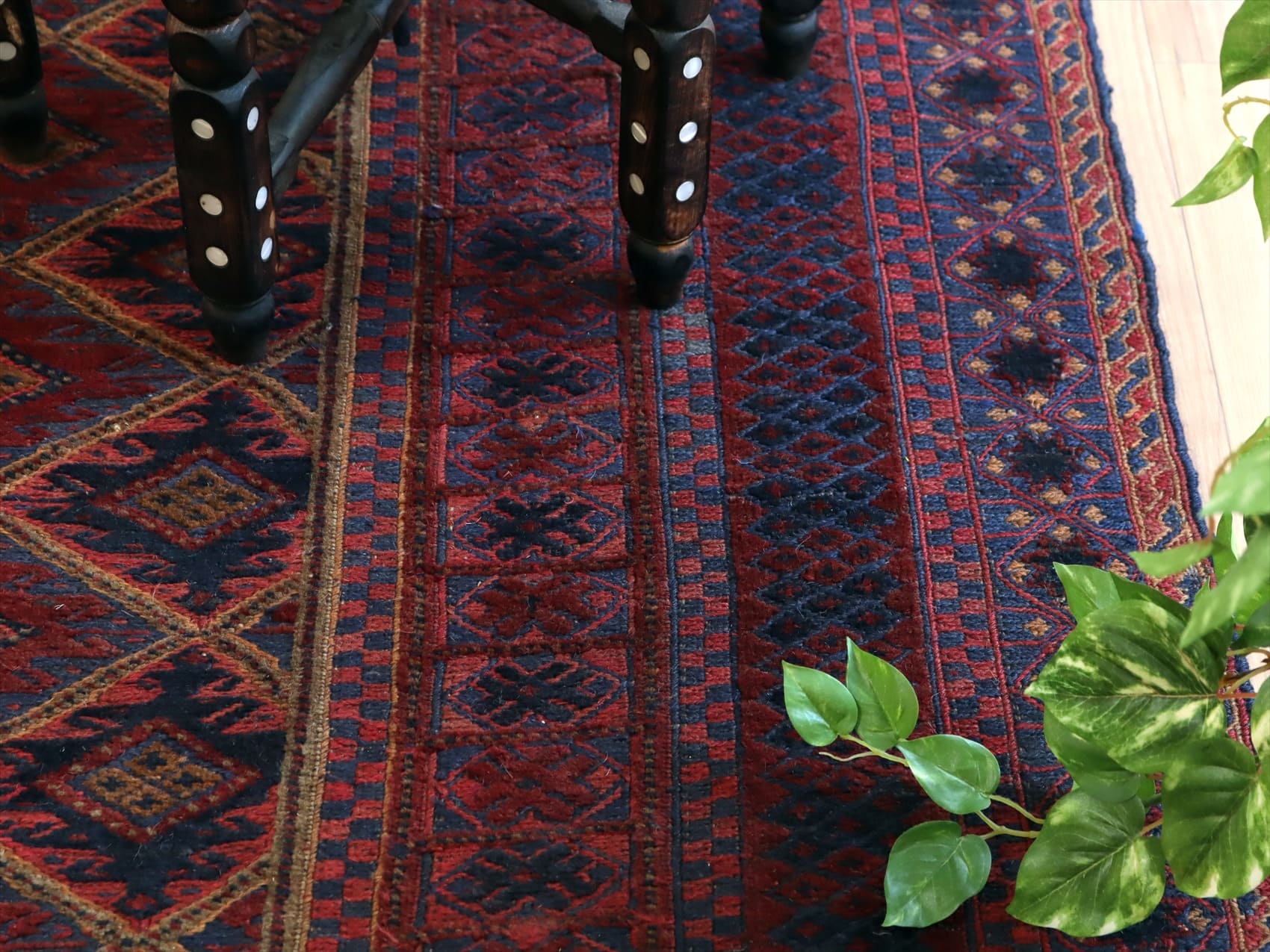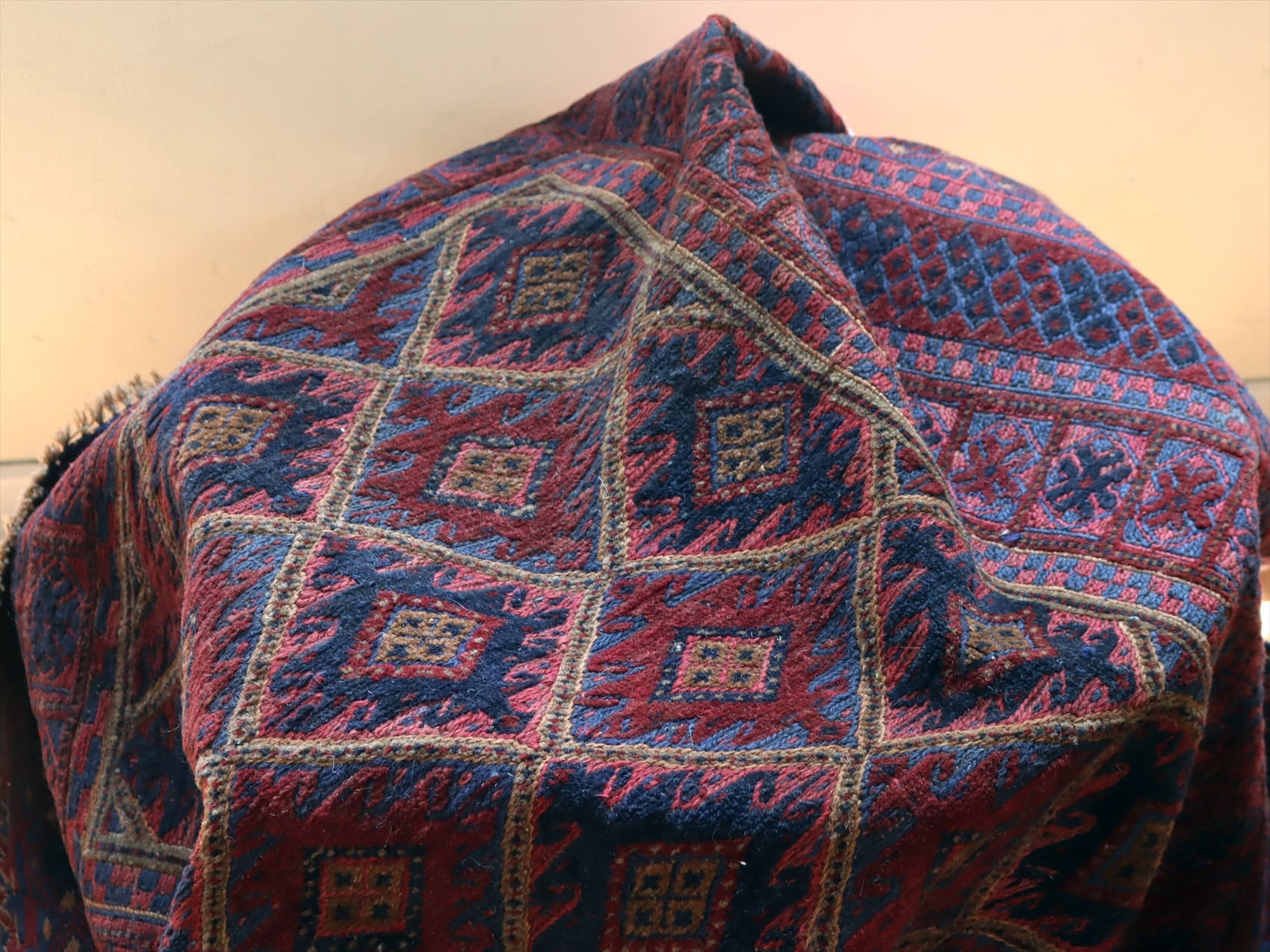 | アフガニスタン東部、イランと国境を接するエリアの緻密な織りのキリムです。細かい織り目のスマック織りをベースに、立体感のあるカーペット織りでモチーフをレリーフのように織り込んだ1枚。 |
