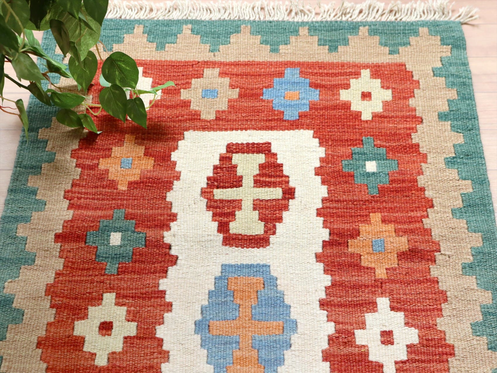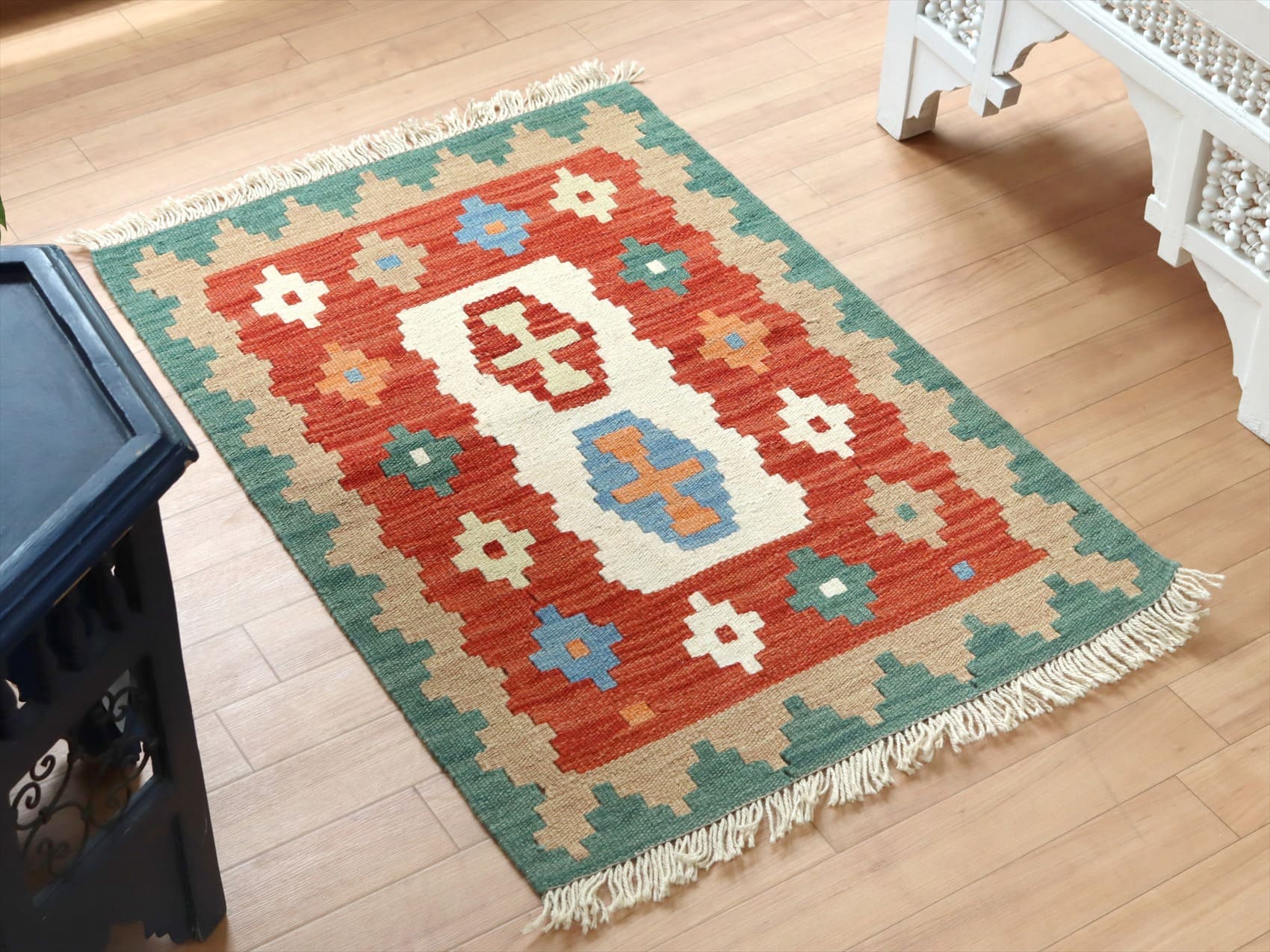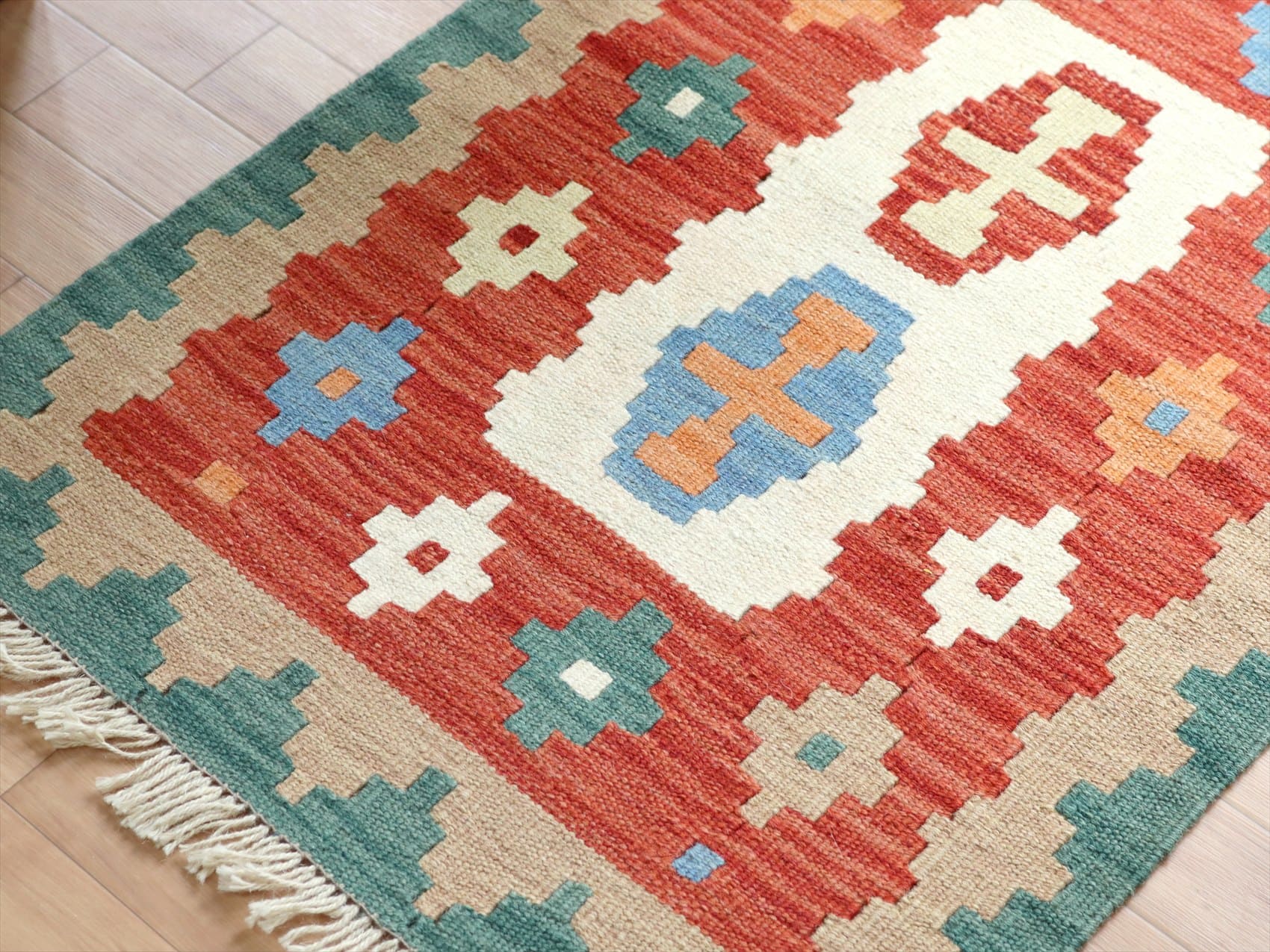 - イラン手織りキリム カシュカイキリム 91×63cm カラフルな幾何学モチーフ