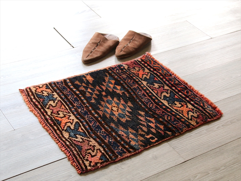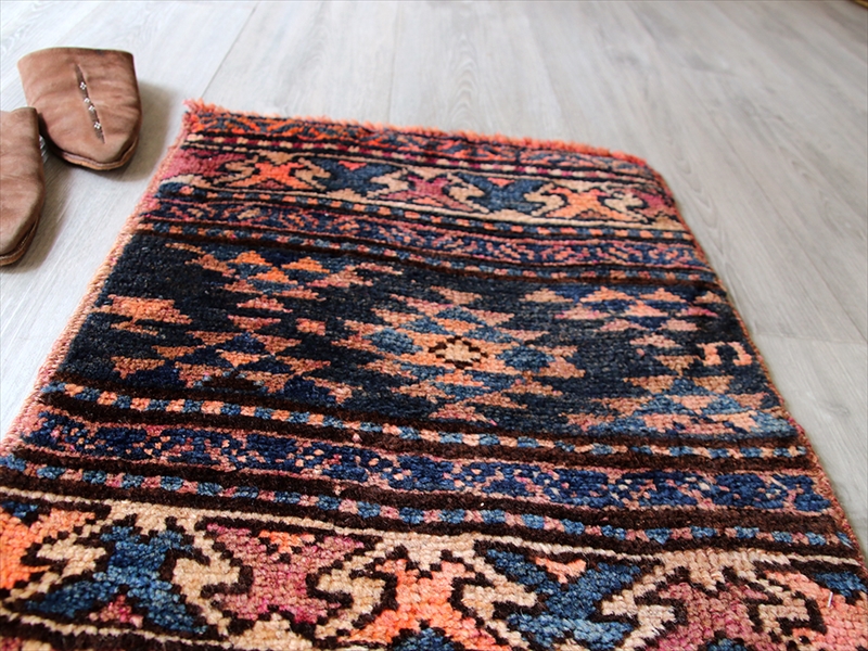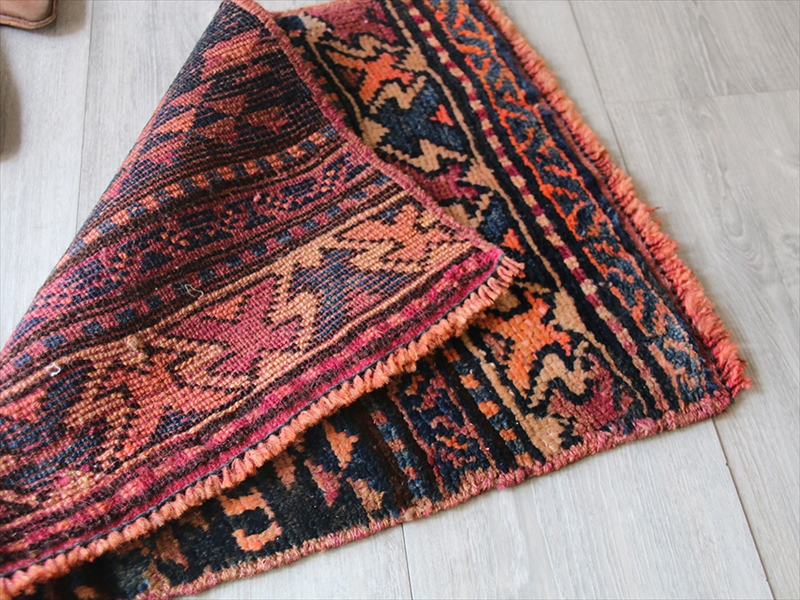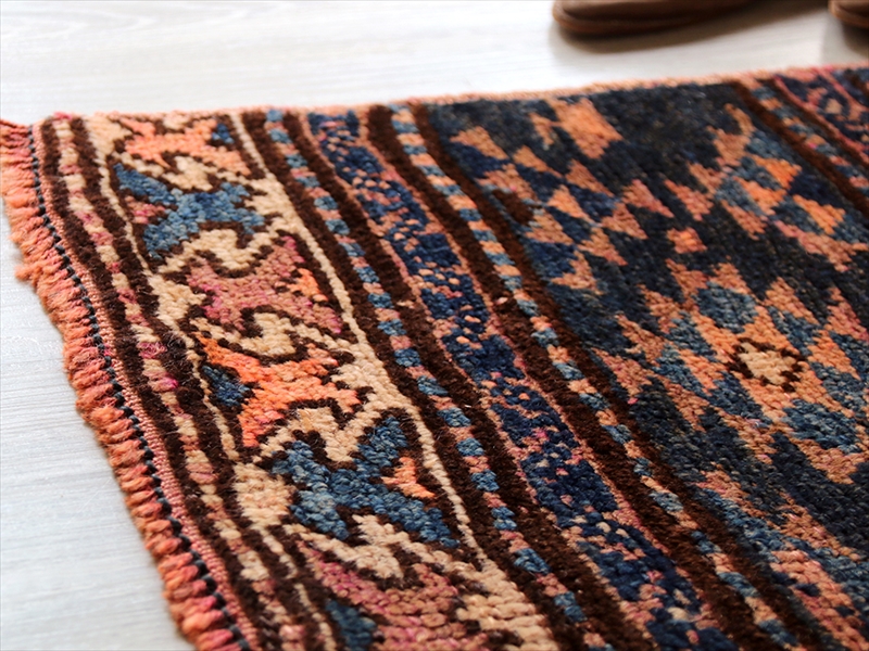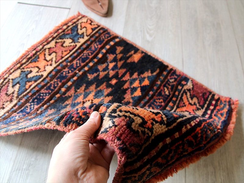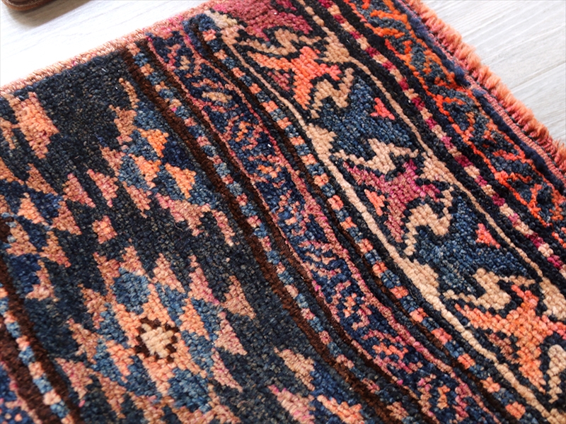 | パイル(毛足)は短めで5-7mm、全体の厚みは7-8mm程度のやわらかな織り。赤やオレンジはかなり褪色しています。 マフラッシュの写真 |