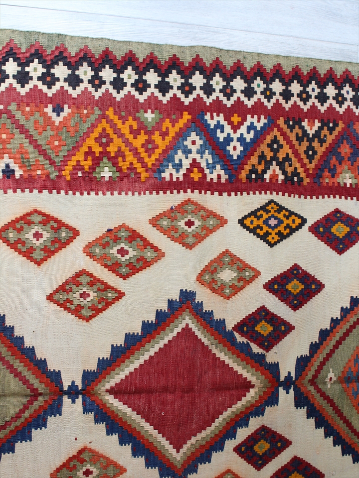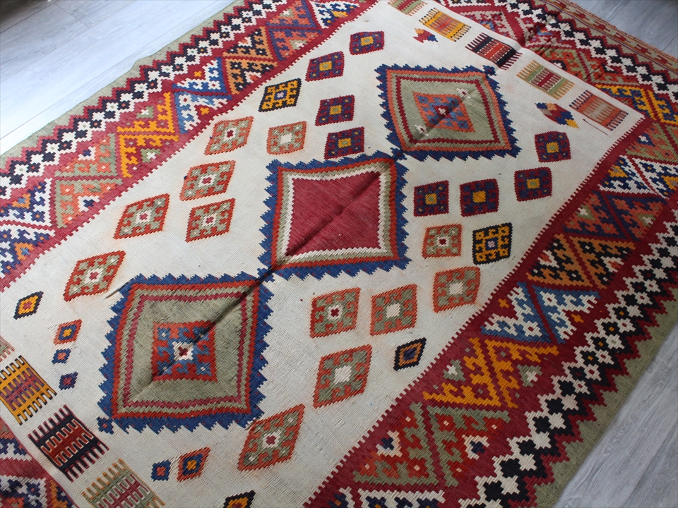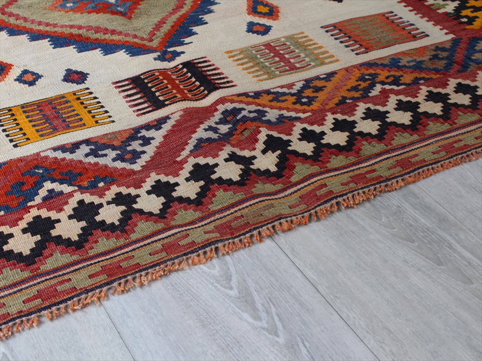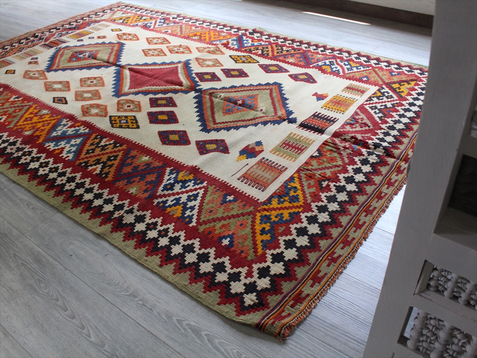 | 織り地は厚みがあって、ハリがあり、がっちりしています。上にテーブルやイスを乗せて使うのにも向いていますし、キリム自体に重みがあるので滑り止めなしでも床に沿う感じです。年代なりの古びたイメージ、使用感などありますので、ご了承ください。 イラン東南部のシーラーズを中心として、ザクロス山脈の麓に住むカシュカイ族は、トルコ語系の言葉を話す遊牧民で、イランの中では最もトルコに近いキリム文化を持っています。 |