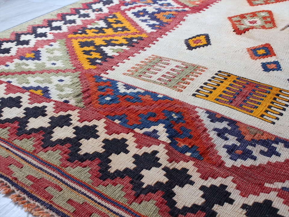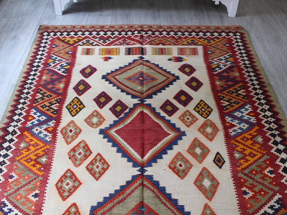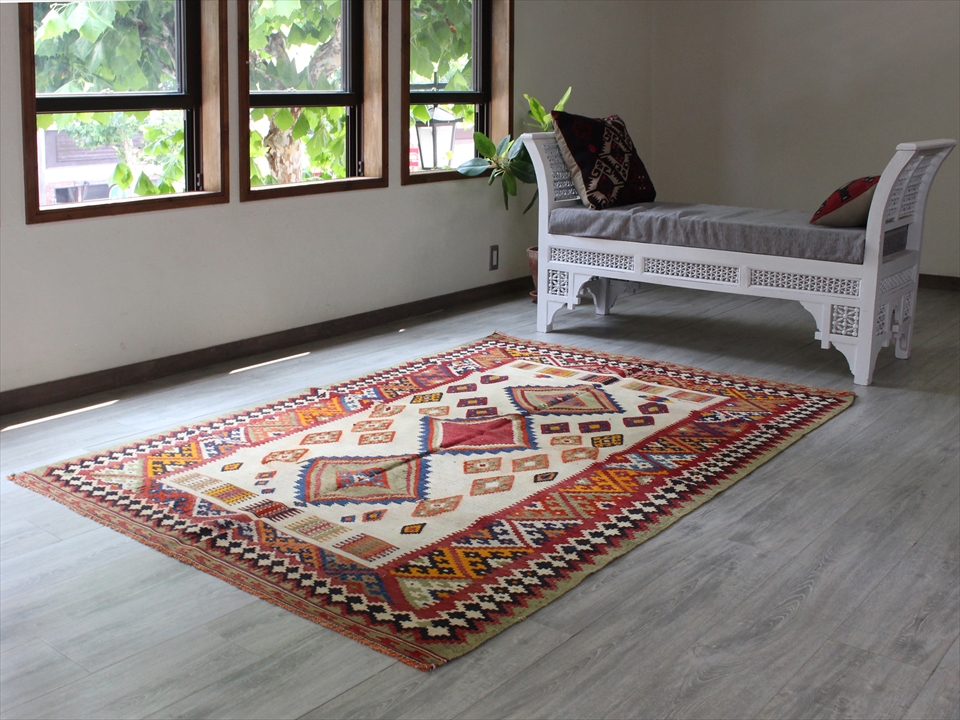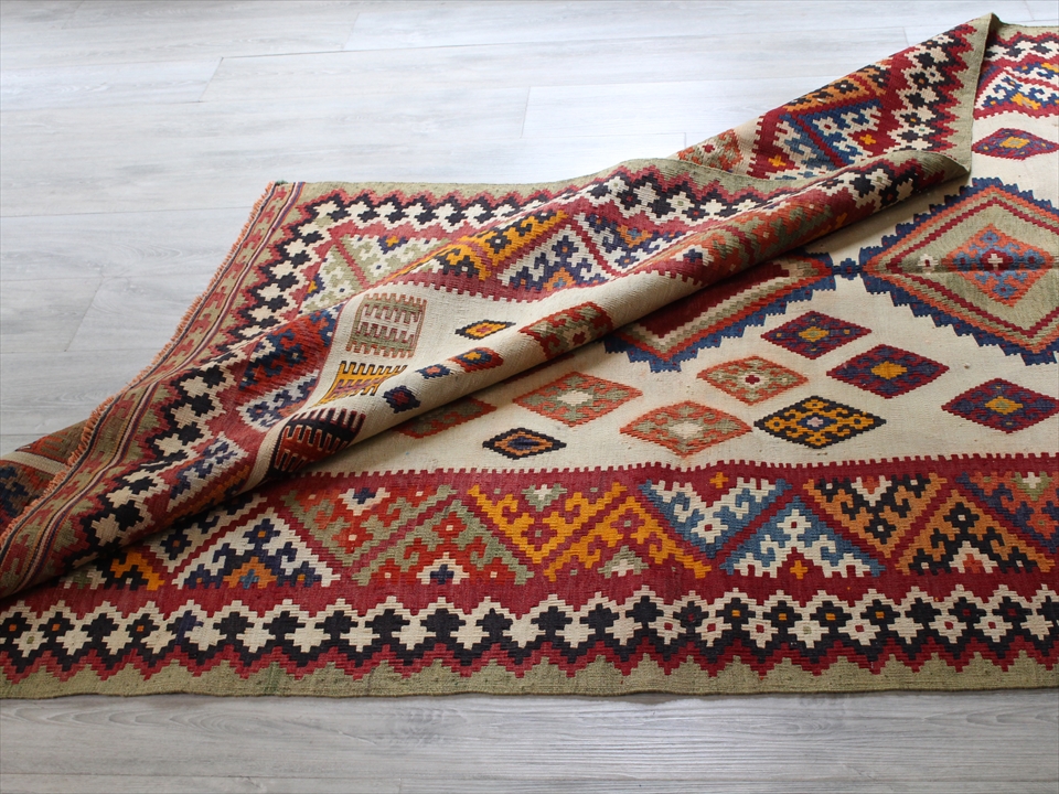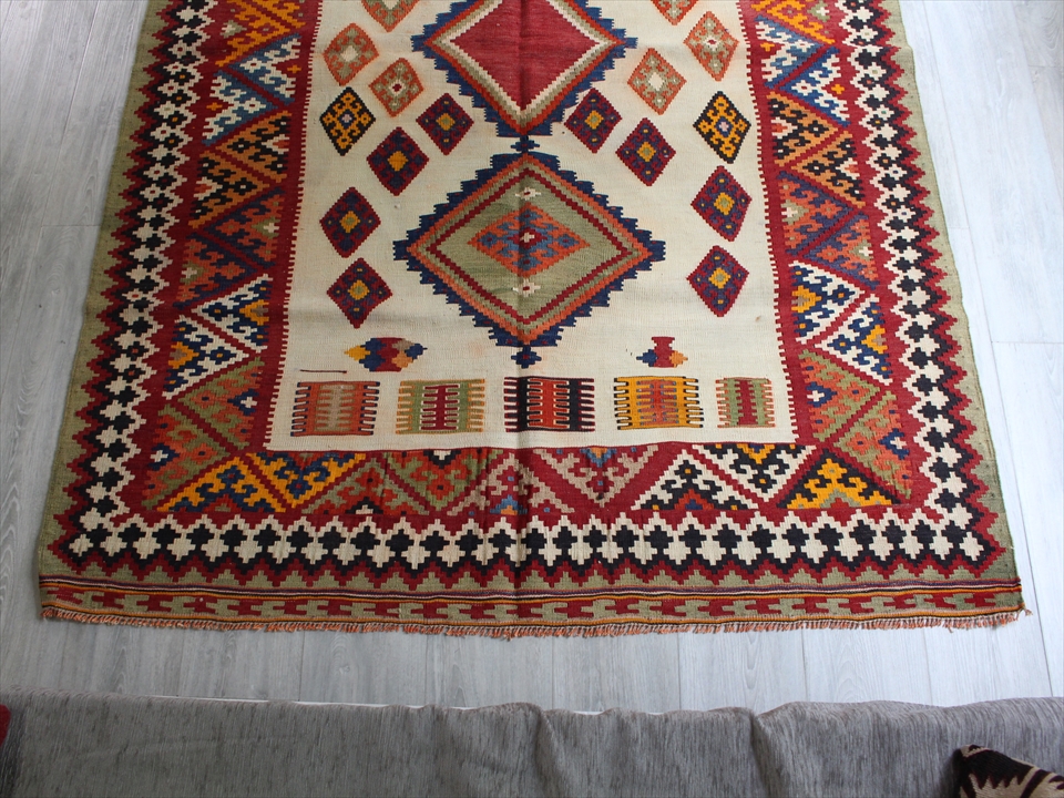 | 織り地は厚みがあって、ハリがあり、がっちりしています。上にテーブルやイスを乗せて使うのにも向いていますし、キリム自体に重みがあるので滑り止めなしでも床に沿う感じです。年代なりの古びたイメージ、使用感などありますので、ご了承ください。 イラン東南部のシーラーズを中心として、ザクロス山脈の麓に住むカシュカイ族は、トルコ語系の言葉を話す遊牧民で、イランの中では最もトルコに近いキリム文化を持っています。 |