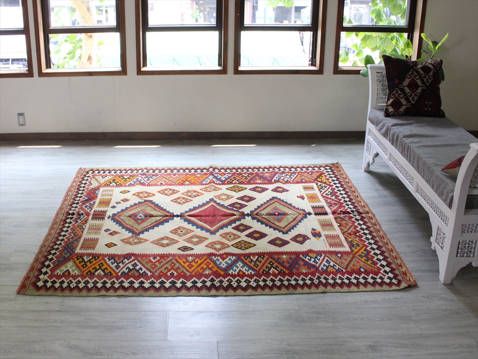| ギャッベを織る遊牧民として知られるカシュカイ族の織ったキリム。大家族が暮らす大きな黒いテントの中で、家財道具をカバーしたり、日除けにしたり、もちろん敷物にしたりと、生活道具としてなくてはならないのが遊牧民にとってのキリムです。 カシュカイキリムは、ポップで明るい色使いと、クレヨンで手描きしたような表情のあるモチーフで現代のお部屋にも合わせやすく人気が高いのですが、近年マーケットに出てくる数が減っていて、サイズや色のバランスの取れたピースは手に入れるのが難しくなってきているのです。 |