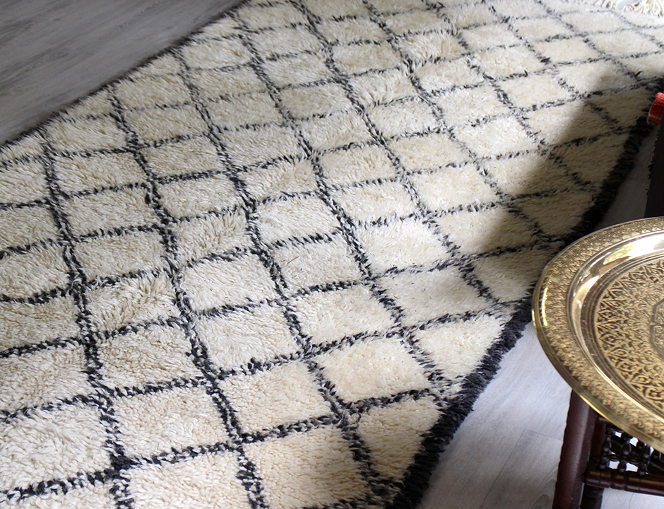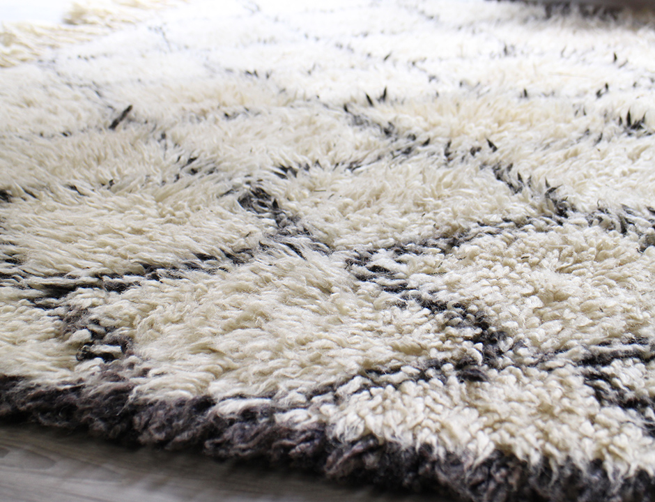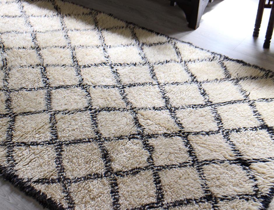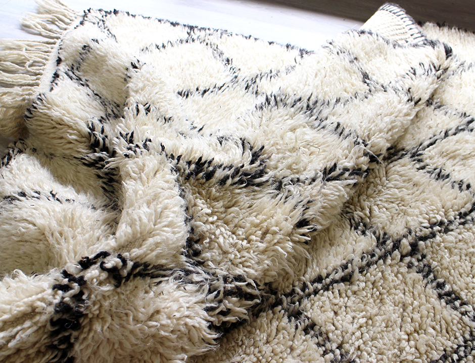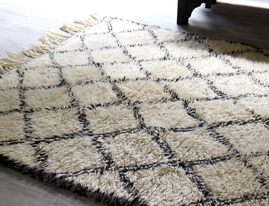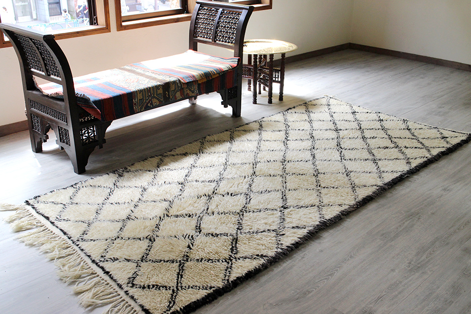| ベースは染めていない羊毛のナチュラルアイボリー。全体にこげ茶色の毛糸で、幾何学模様が織り込まれ、プリミティブなイメージの一枚。カーペットというより、分厚いブランケットやムートンのイメージに近い、やわらかなラグで、テント内で寝具として使われていました。 モロッコの先住部族と言われるベルベル族の中で、ベニ・ワレン族は、北アフリカ・中部アトラス山脈一体に住み、都市文化から孤立して近年まで独自の文化を持っていたといいます。 21世紀に入ってから、シンプルでプリミティブなラグに人気が集まり、注目されるようになっています。コーディネートの幅は広く、ウッディなフローリングだけでなく、大理石やタイルの床、色の強い敷きこみカーペットの上でも活躍してくれます。 |