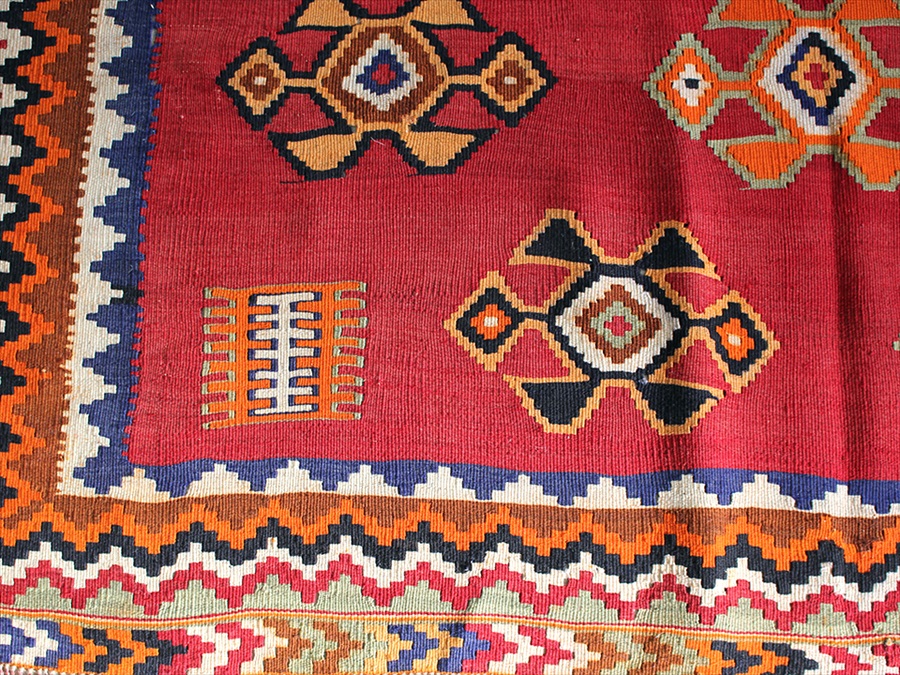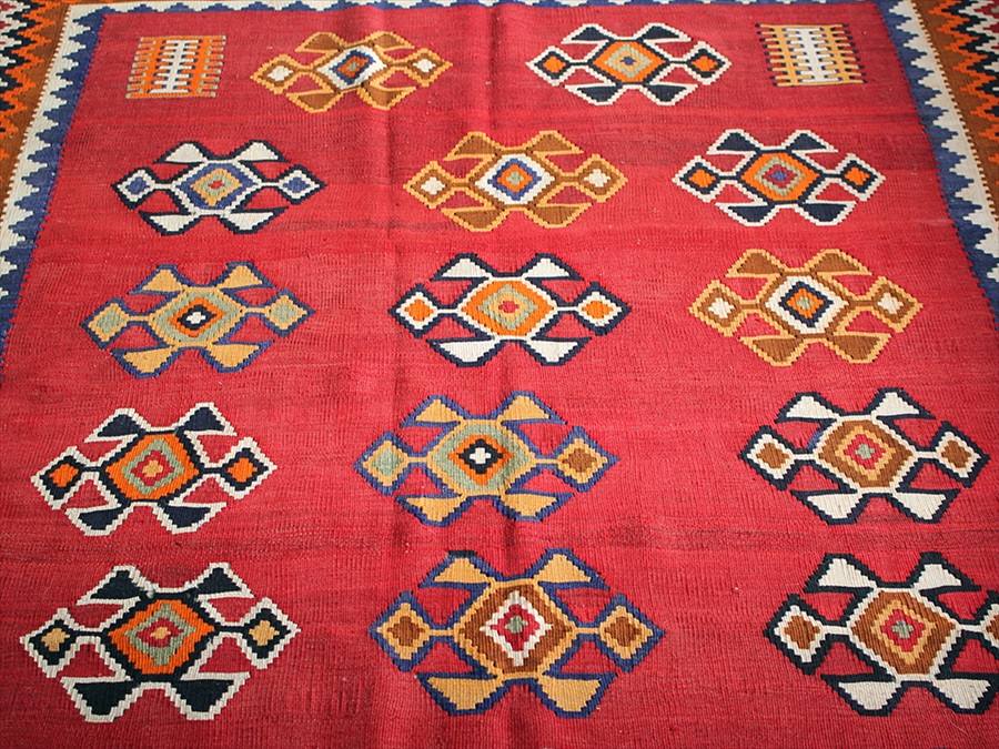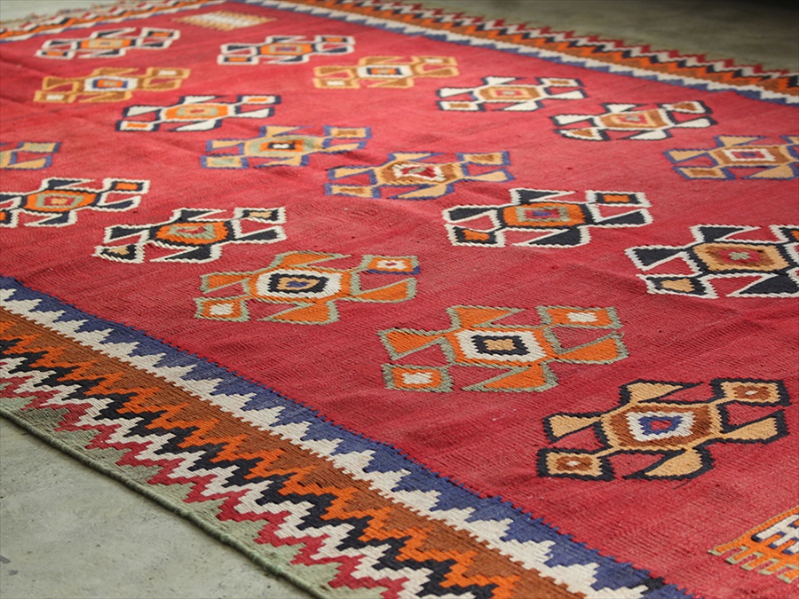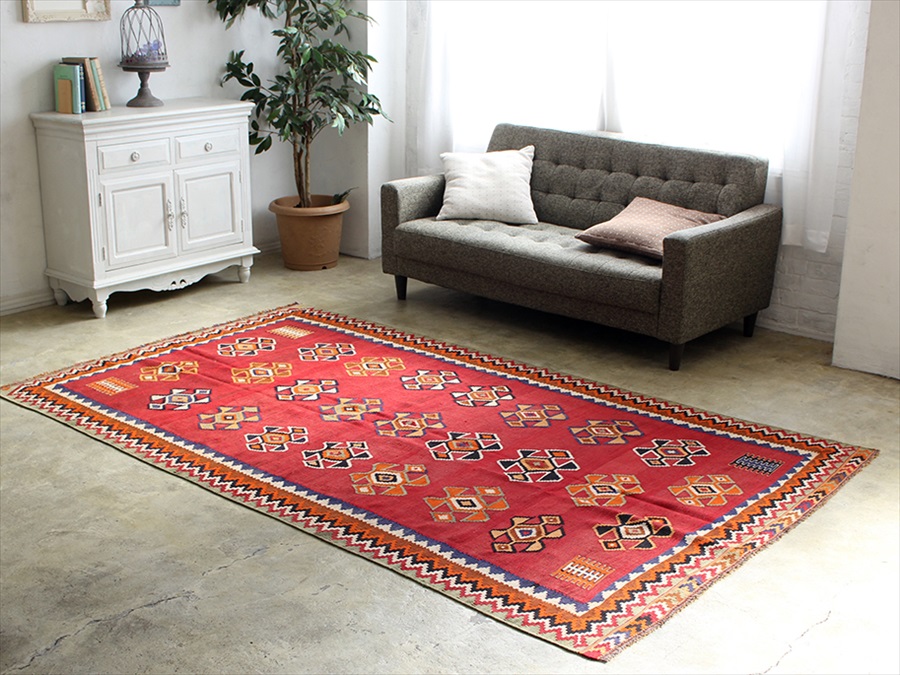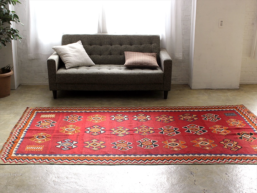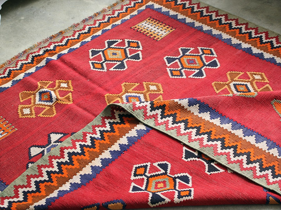 | ギャッベを織る遊牧民として知られるカシュカイ族の織ったキリム。大家族が暮らす大きな黒いテントの中で、家財道具をカバーしたり、日除けにしたり、もちろん敷物にしたりと、生活道具としてなくてはならないのが遊牧民にとってのキリムです。カシュカイキリムは、ポップで明るい色使いと、クレヨンで手描きしたような表情のあるモチーフで現代のお部屋にも合わせやすく人気が高いのですが、近年マーケットに出てくる数が減っていて、サイズや色のバランスの取れたピースは手に入れるのが難しくなってきているのです。織り地は厚みがあって、ハリがあり、がっちりしています。上にテーブルやイスを乗せて使うのにも向いていますし、キリム自体に重みがあるので滑り止めなしでも床に沿う感じです。年代なりの古びたイメージ、使用感などありますので、ご了承ください。イラン東南部のシーラーズを中心として、ザクロス山脈の麓に住むカシュカイ族は、トルコ語系の言葉を話す遊牧民で、イランの中では最もトルコに近いキリム文化を持っています。 |