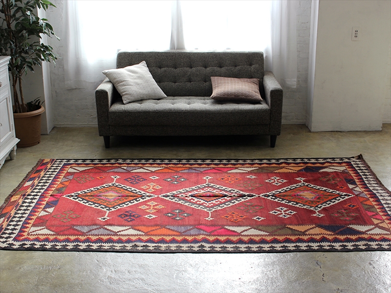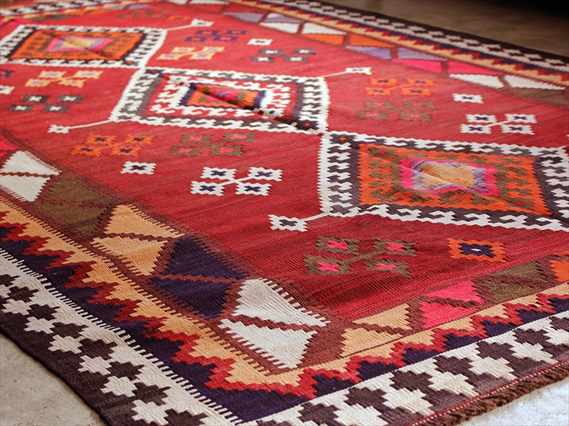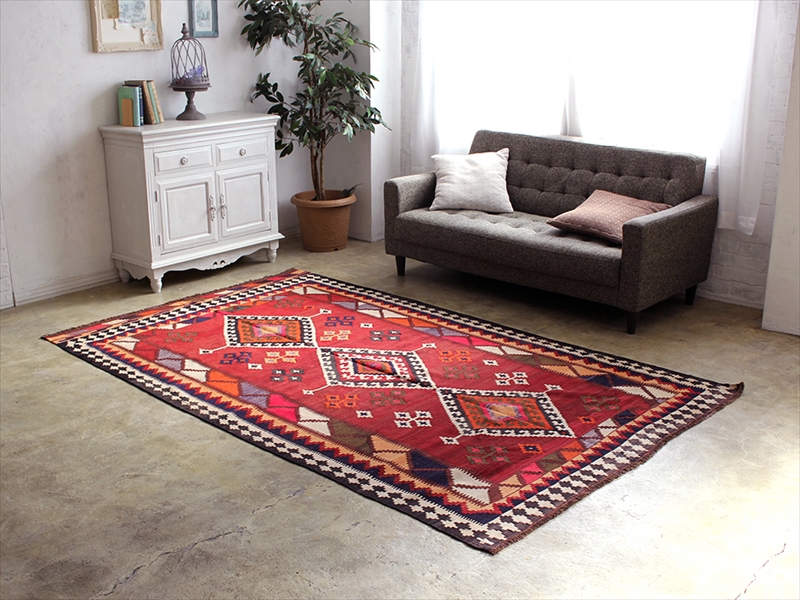 | ギャッベを織る遊牧民として知られるカシュカイ族の織ったキリム。大家族が暮らす大きな黒いテントの中で、家財道具をカバーしたり、日除けにしたり、もちろん敷物にしたりと、生活道具としてなくてはならないのが遊牧民にとってのキリムです。イラン東南部のシーラーズを中心として、ザクロス山脈の麓に住むカシュカイ族は、トルコ語系の言葉を話す遊牧民で、イランの中では最もトルコに近いキリム文化を持っています。カシュカイキリムは、ポップで明るい色使いと、クレヨンで手描きしたような表情のあるモチーフで現代のお部屋にも合わせやすく人気が高いのですが、近年マーケットに出てくる数が減っていて、サイズや色のバランスの取れたピースは手に入れるのが難しくなってきているのです。織り地は厚みがあって、ハリがあり、がっちりしています。上にテーブルやイスを乗せて使うのにも向いていますし、キリム自体に重みがあるので滑り止めなしでも床に沿う感じです。年代なりの古びたイメージ、使用感などありますので、ご了承ください。 |