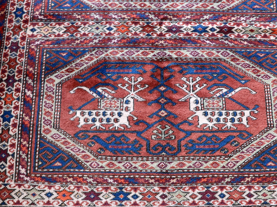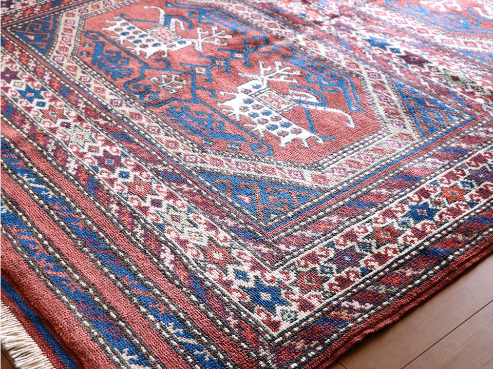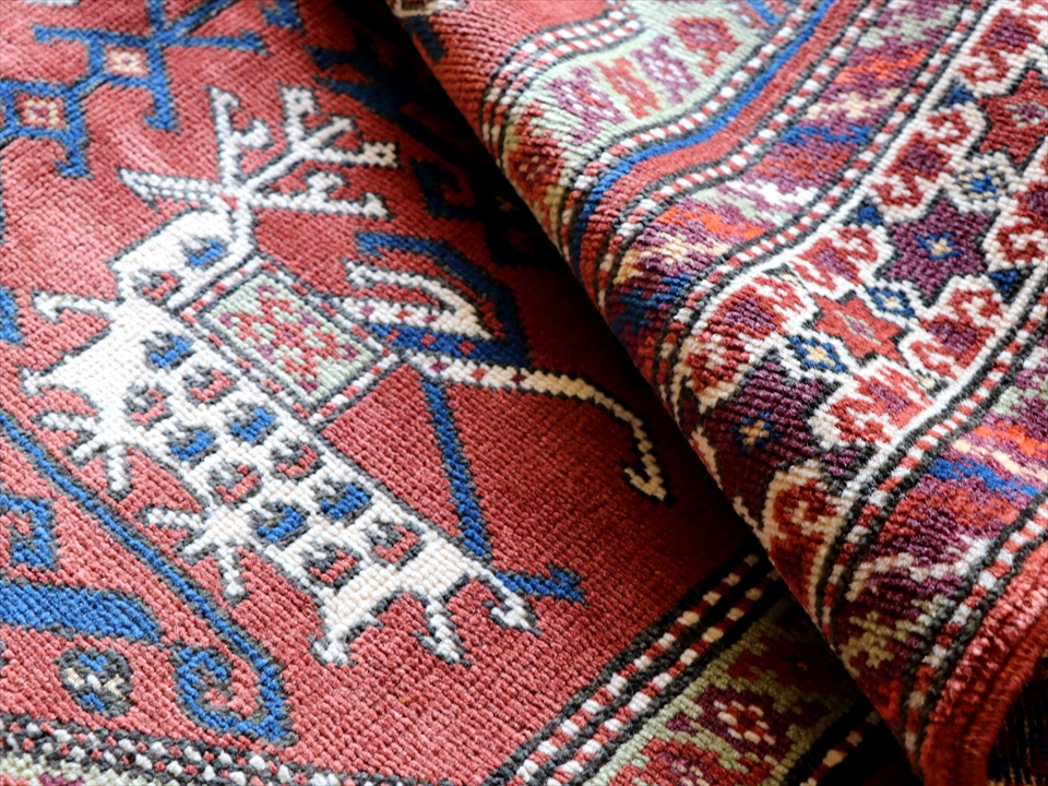| 博物館に所蔵されている15世紀の西アナトリア地方のアンティーク・カーペットを再現して織られた、リプロダクション・カーペットです。オリジナルは現在イスタンブールにある、トルコ・イスラム美術博物館に所蔵されています。 中央にいる向き合った角のある動物がドラゴン、その下にはフェニックス。ドラゴンとフェニックスの戦いの構図です。ドラゴンとフェニックスの戦いは、豊かな実りをもたらす春の雨を象徴するモチーフで、豊穣をテーマに構成されています。ボーダー(額縁)にあるフックのモチーフは悪いものから身を守るお守りの意味を持つもので、多用されるモチーフのひとつです。 左下の端にナザルボンジュウのビーズが付いています。ナザルボンジュウはトルコのお守りで、邪視や嫉妬の目からくる災いをはねのけてくれると信じられています。 |