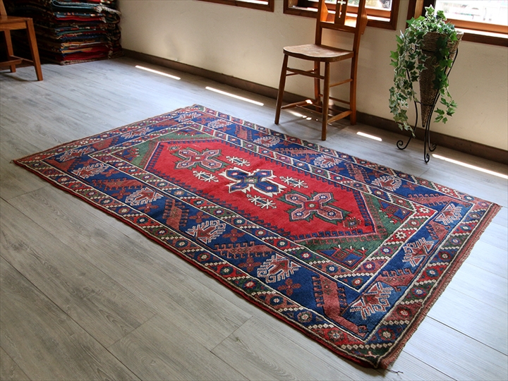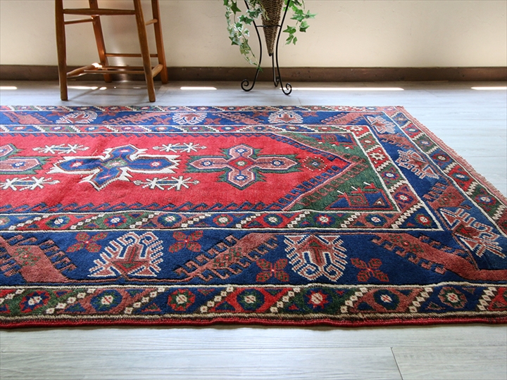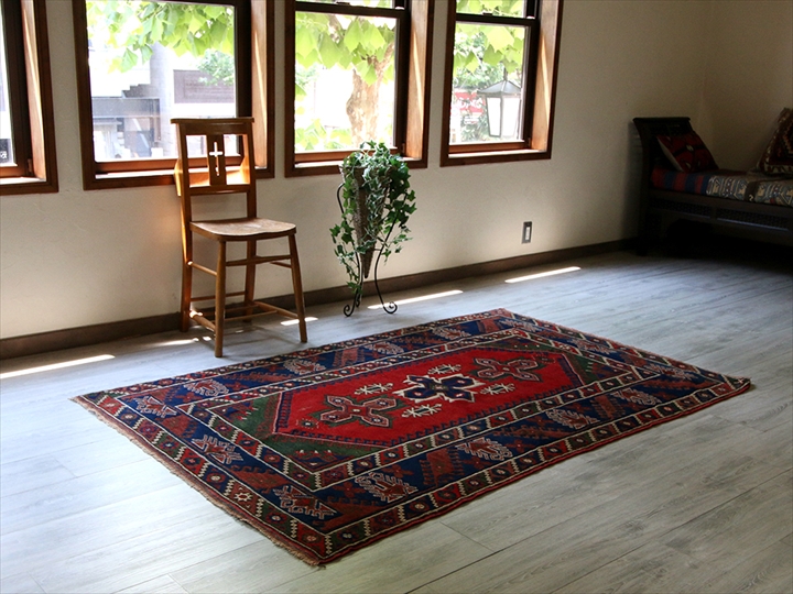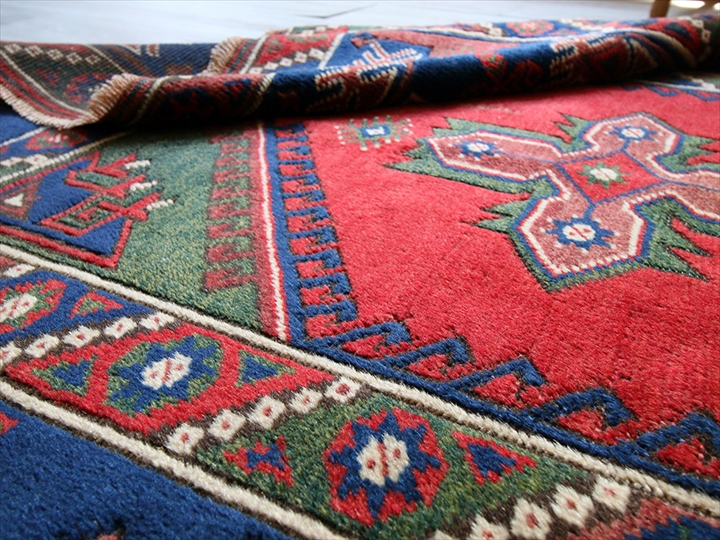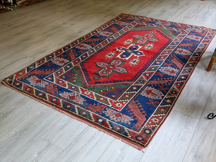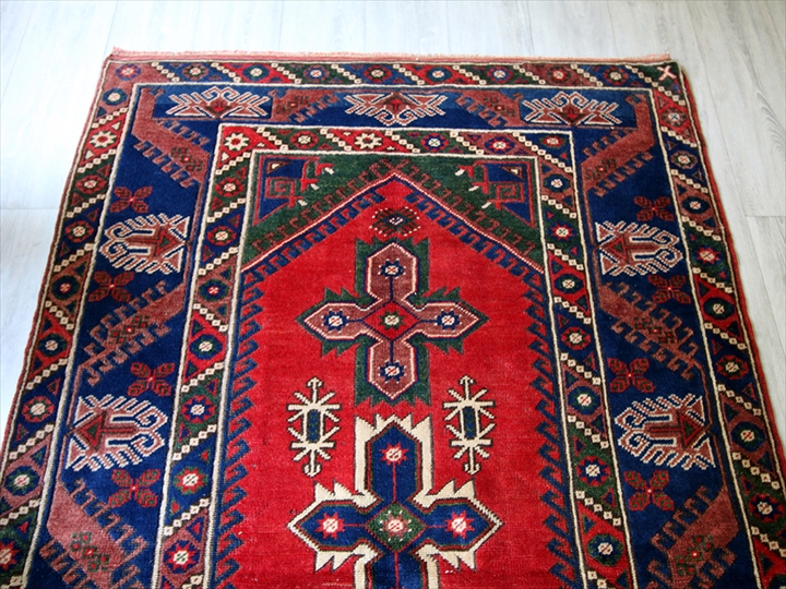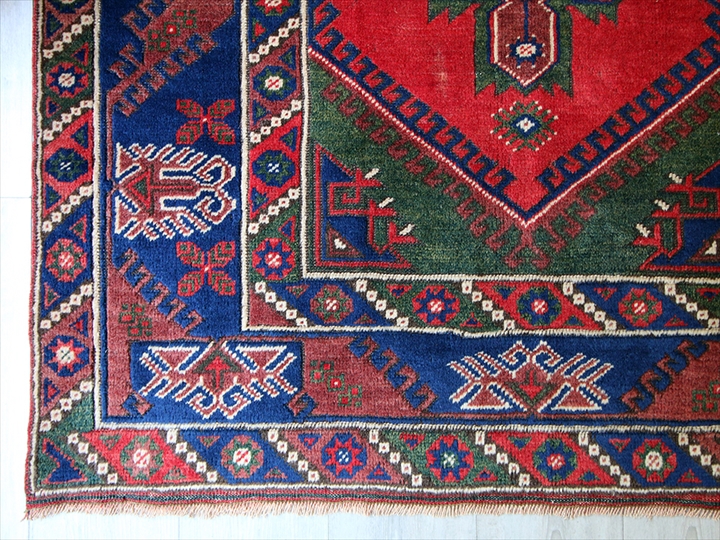 | 幾何学模様とシンプルな配色の伝統的なトルコ絨毯。産地のドゥシュメアルトゥは南部地中海地方のアンタルヤに近いエリアで、アナトリアの先住民族が住み着いた村と言われ、彼らの織るじゅうたんは最も古いタイプのオリジナルのトルコデザインといえます。 |