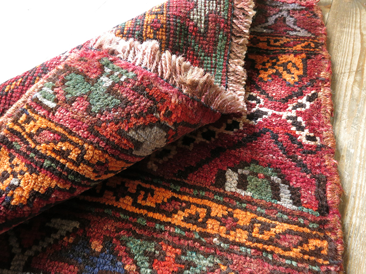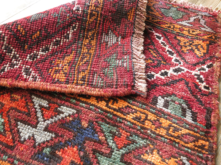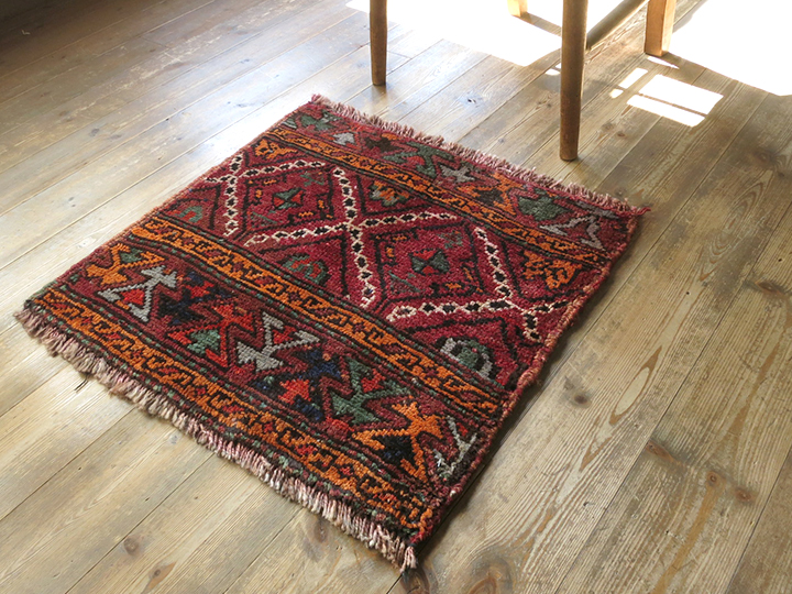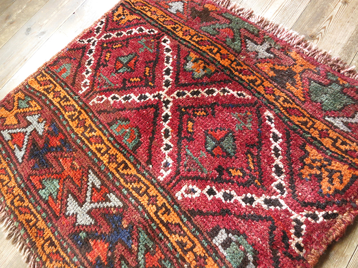 | カスピ海南岸のアゼリー地方からテヘラン近郊に暮らしていたシャーサバン族の織ったカーペットです。もとは、直方体の家財道具などを収納する袋(マフラシュ)として使われるためのもので、この小さなパネルは立方体の側面用です。収納袋としてのカーペットやキリムは、テント室内の装飾も兼ねていたため、とても手の込んだ装飾性の高いデザインが多く、小さなサイズながら整ったピースがそろっているため、コレクションとしても人気があります。 |