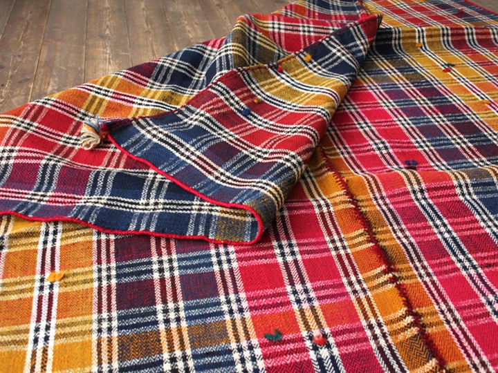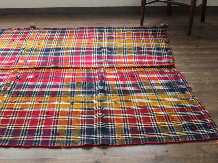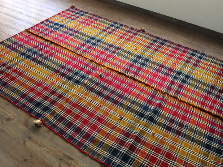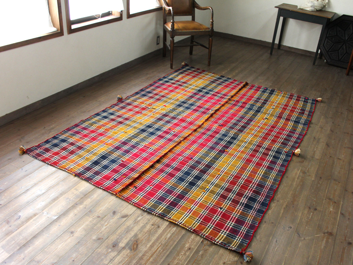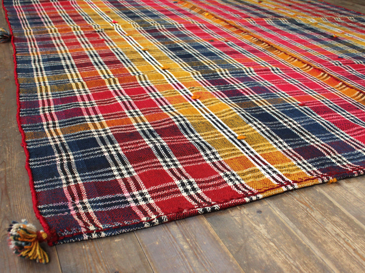 | イラン南西部、シラーズ近郊で暮らす遊牧民「カシュカイ族」がテント内でカバーリングのために織った装飾的なキリムです。通常のキリムが、縦糸を芯にして横糸を絡めて織り進むのに対して、ジャジム織りと呼ばれるこのピースは、縦糸のほうがカラフルな糸で、横糸が芯になっていて、ジャガード織り(両面の糸を入れ替えて柄を出す)のようなテクニックです。 色使いがとても洗練されていて、スコットランドの民族衣装にも近いようなイメージです。アンティーク家具などを置いたクラシックなインテリアにもぴったりです。 |