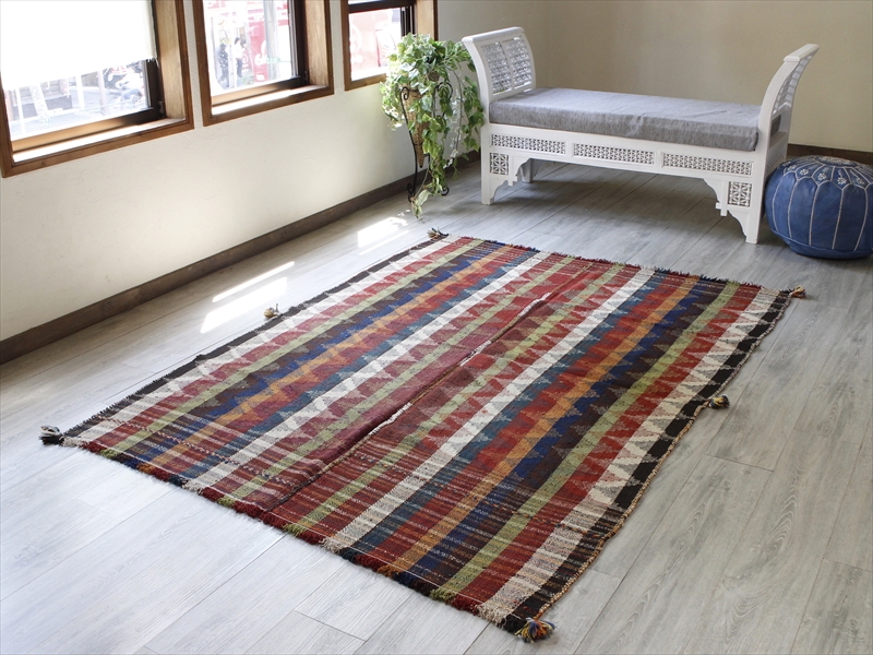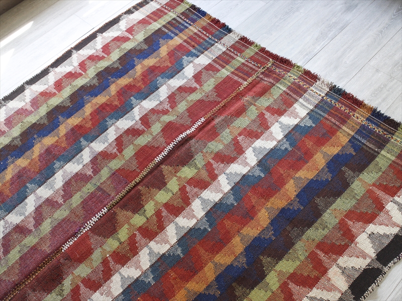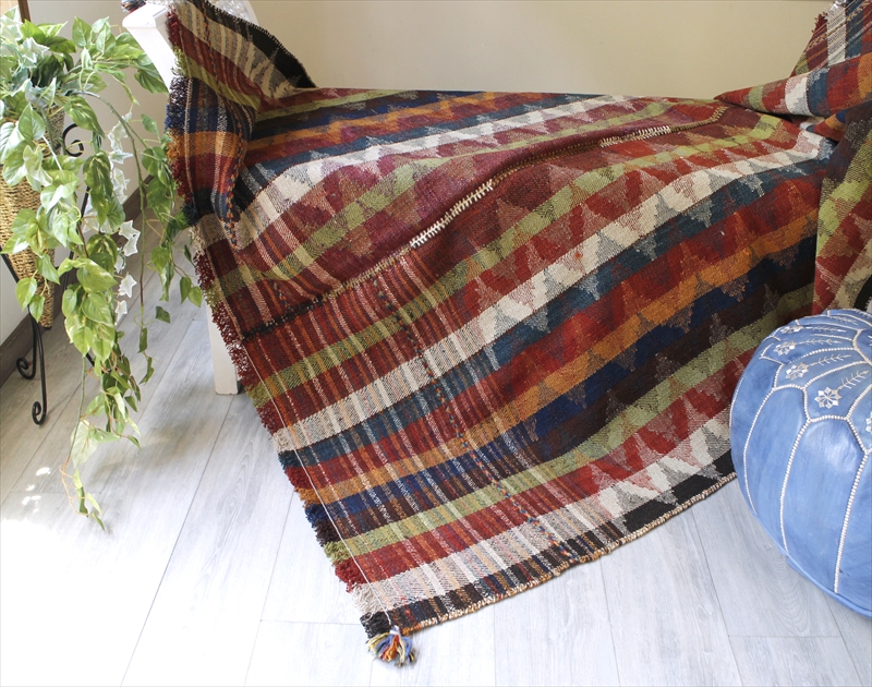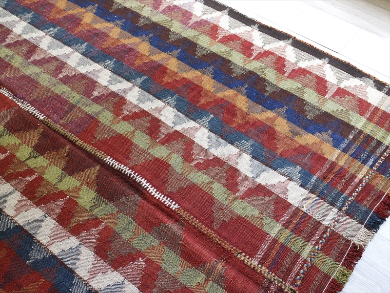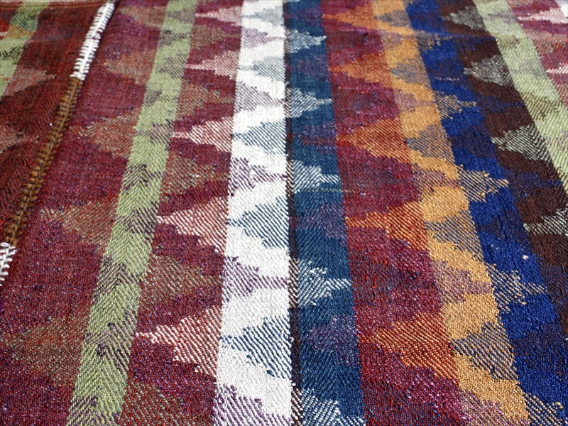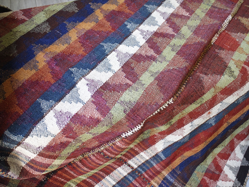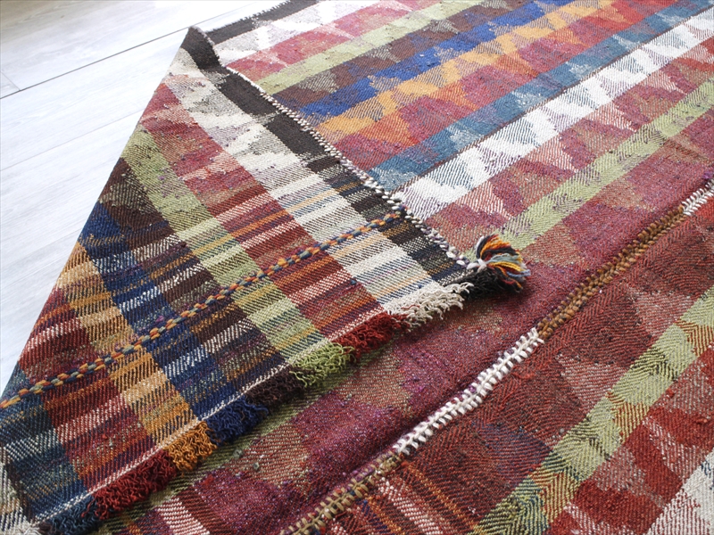 | イラン南西部、シラーズ近郊で暮らす遊牧民「カシュカイ族」がテント内でカバーリングのために織った装飾的なキリムです。通常のキリムが、縦糸を芯にして横糸を絡めて織り進むのに対して、ジャジム織りと呼ばれるこのピースは、縦糸のほうがカラフルな糸で、横糸が芯になっていて、ジャガード織り(両面の糸を入れ替えて柄を出す)のようなテクニックです。 色使いがとても洗練されていて、スコットランドの民族衣装にも近いようなイメージです。アンティーク家具などを置いたクラシックなインテリアにもぴったりです。 |