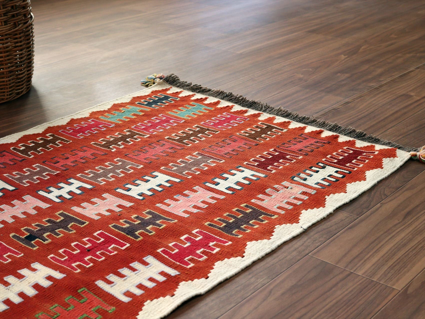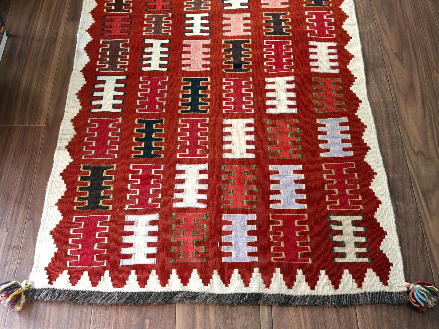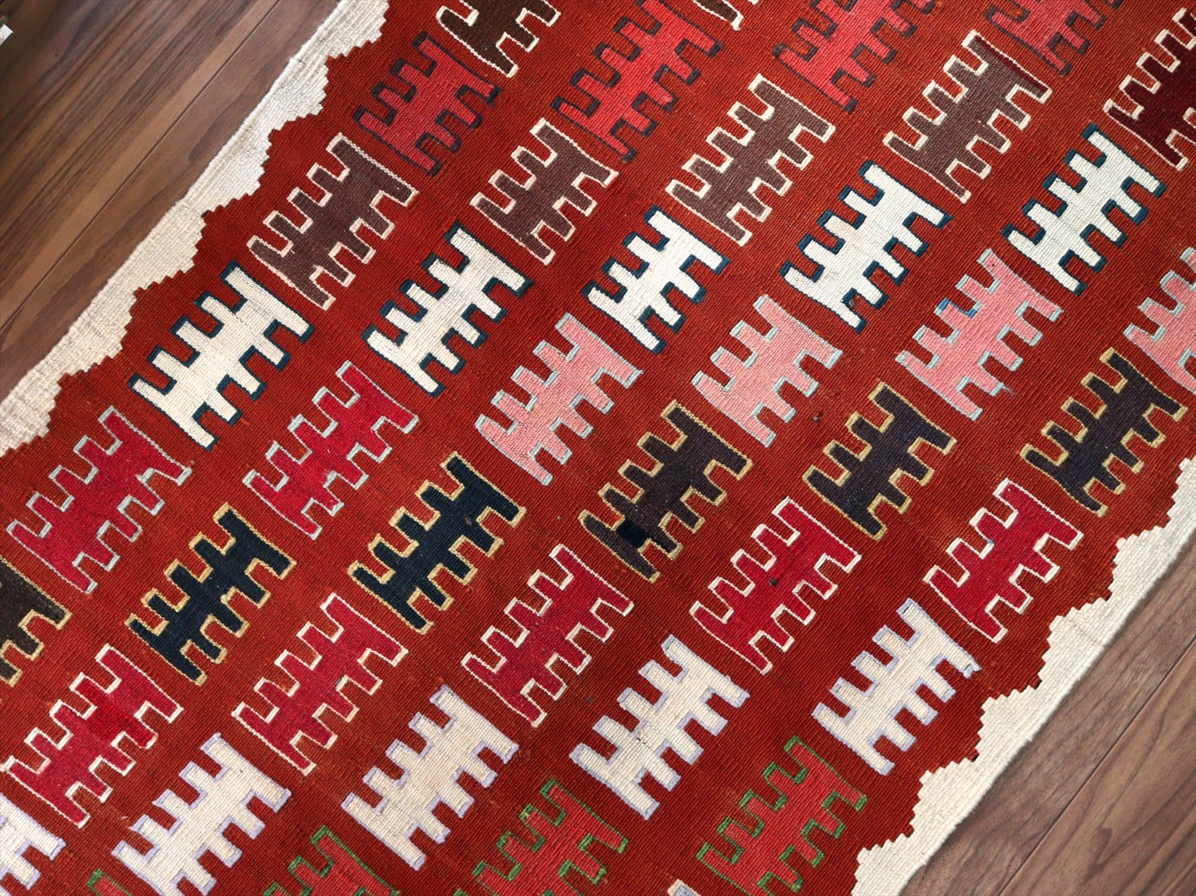- オールドキリム・チェイレキサイズ127×70cm レンガ色にたくさんの櫛のモチーフ