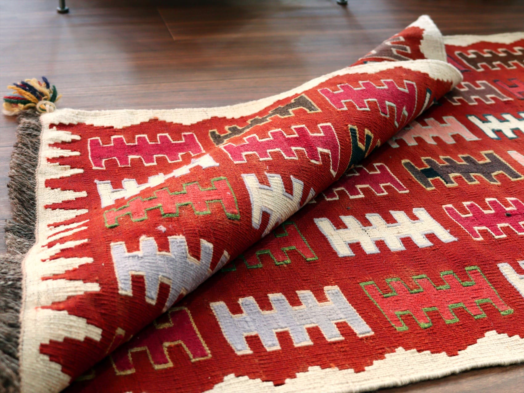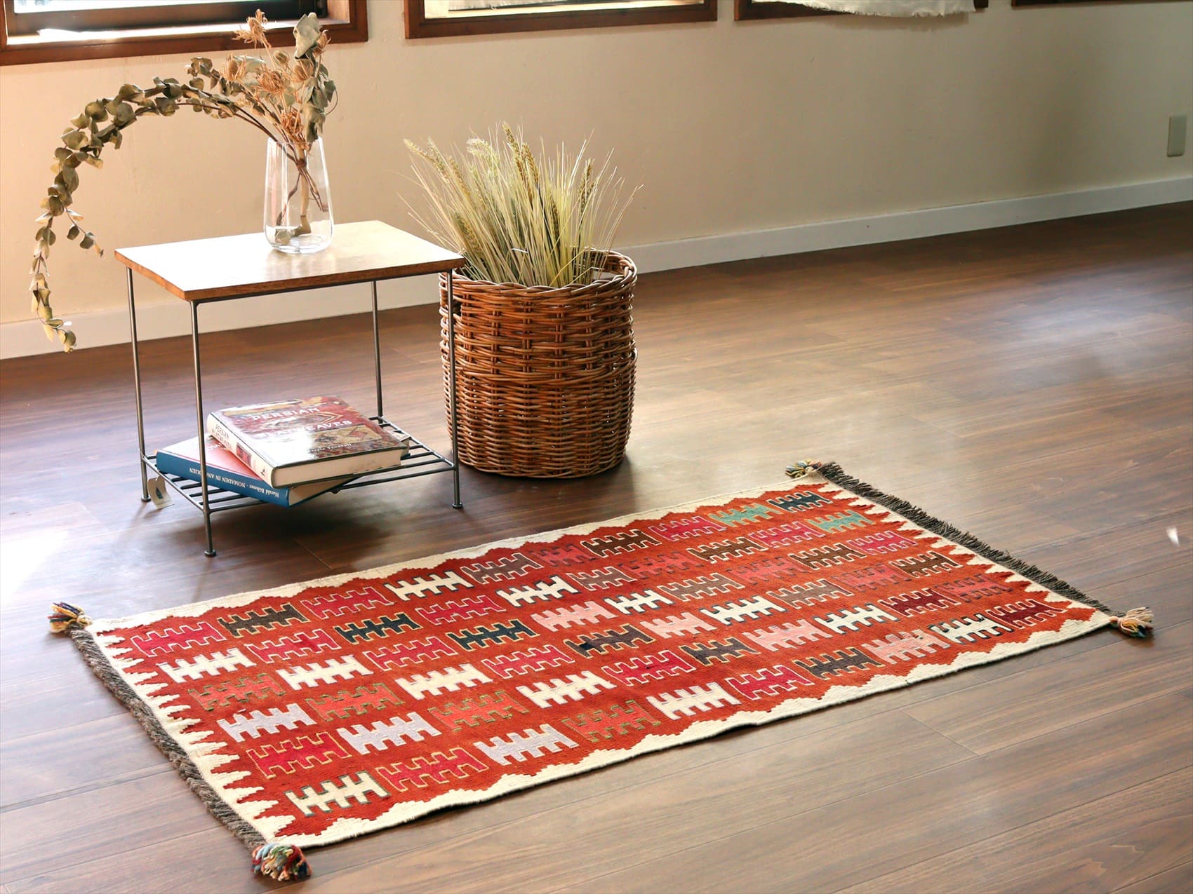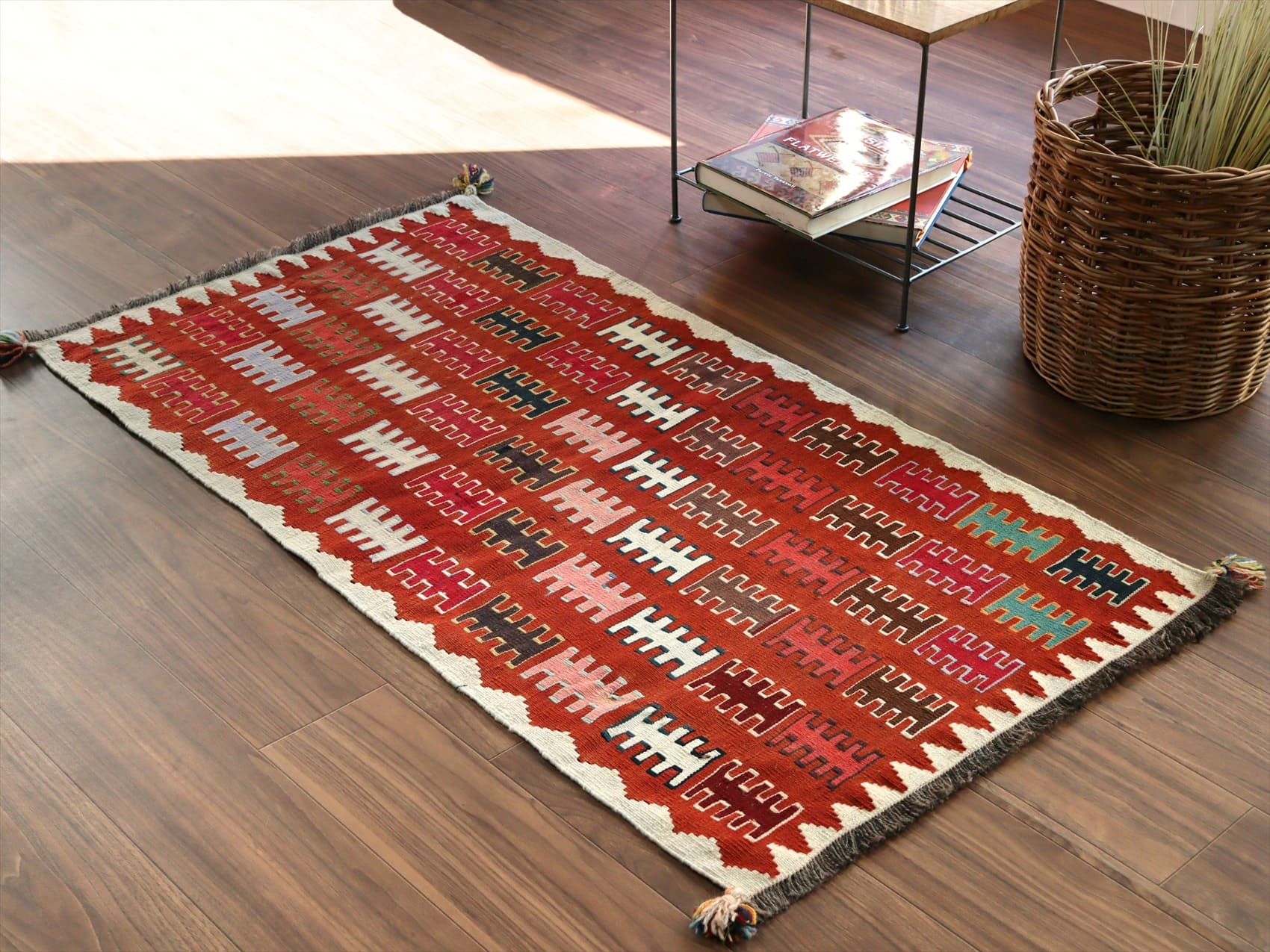 - オールドキリム・チェイレキサイズ127×70cm レンガ色にたくさんの櫛のモチーフ