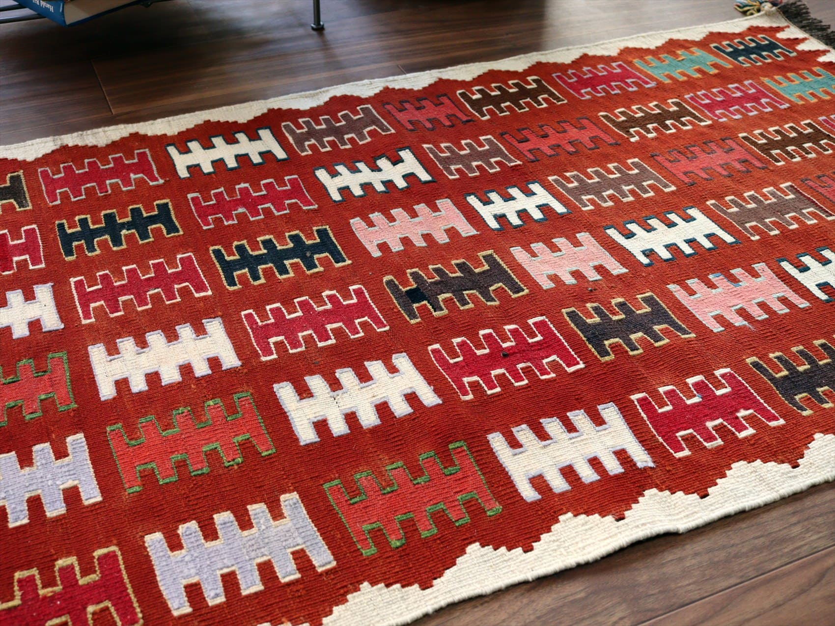 オールドキリム・チェイレキサイズ127×70cm レンガ色にたくさんの櫛のモチーフ