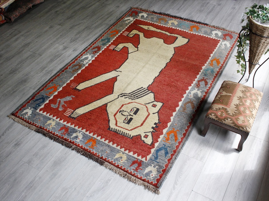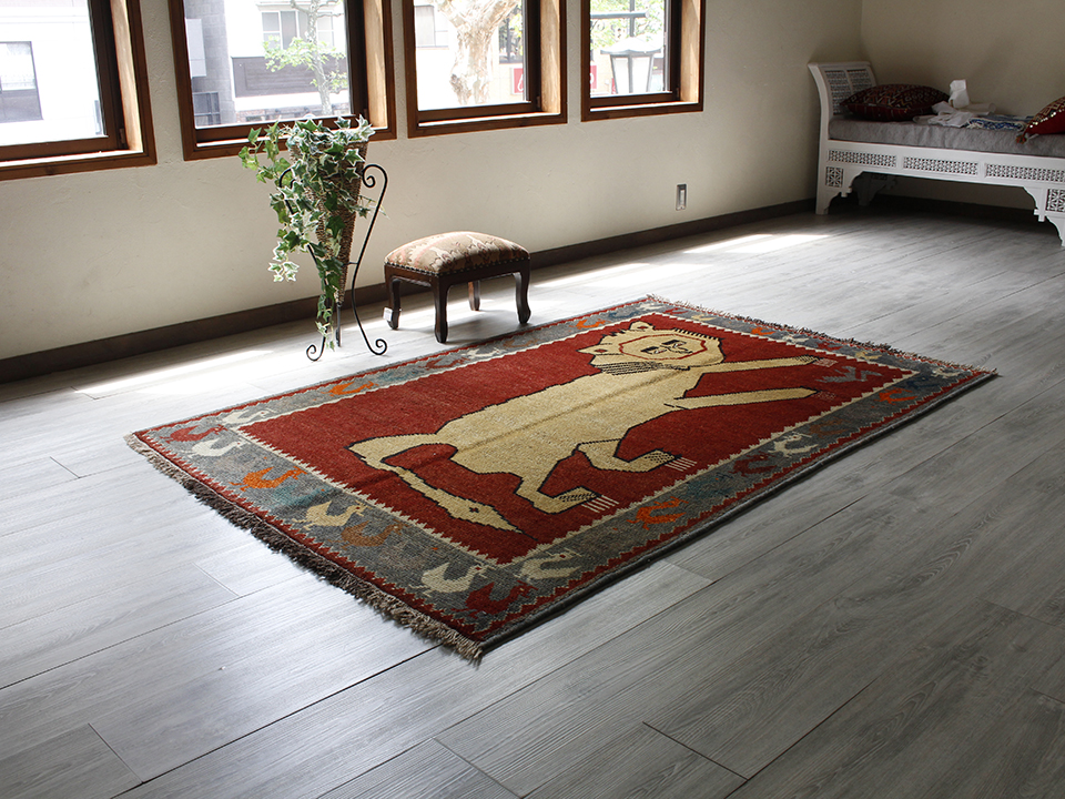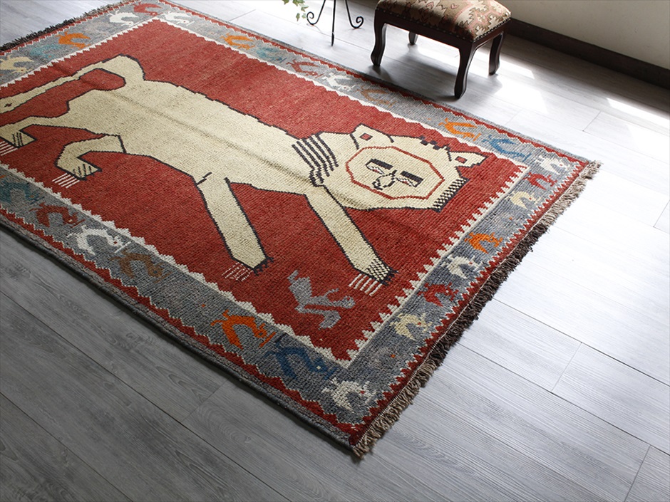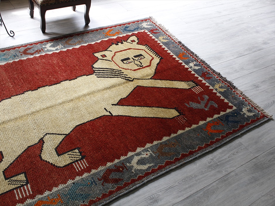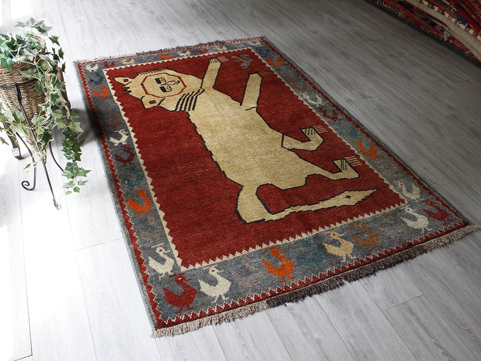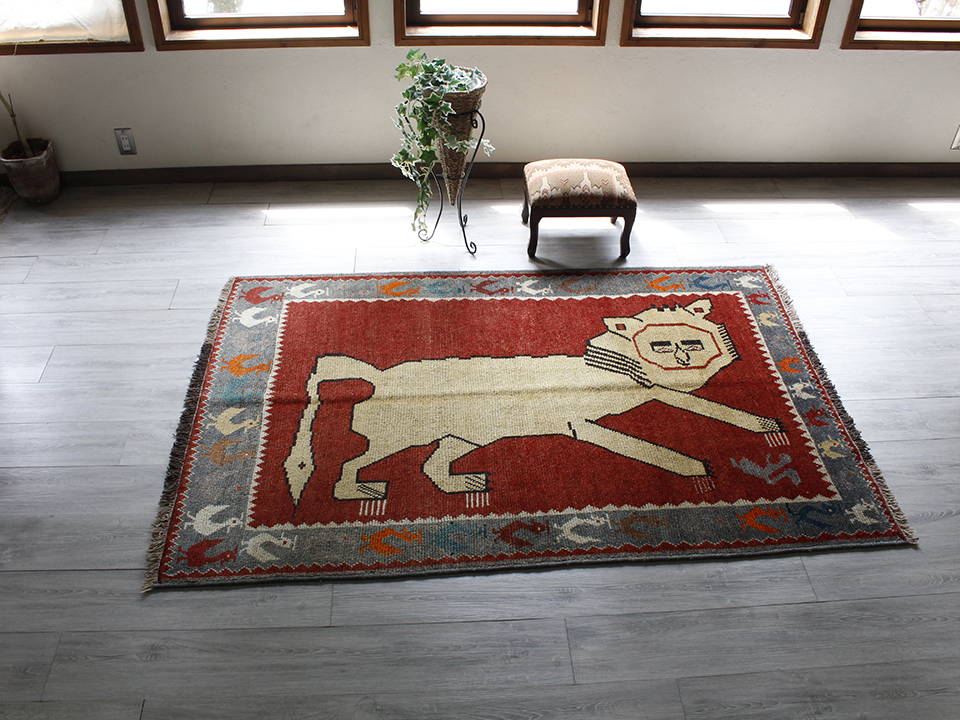 | ニックネームは“眉毛のあるライオン”♪。何かモノ言いたそうな表情や、ピンと立てた耳が、なんとも人間臭い感じのライオンです。じゅうたんの織りを見ると、1970年代以降のギャベと少し違って、芯のないやわらかな織りになっています。パイル(毛足)も短めで、簡単に折り畳んで持ち運びできる質感で、いかにも遊牧民の敷物というつくりです。 |