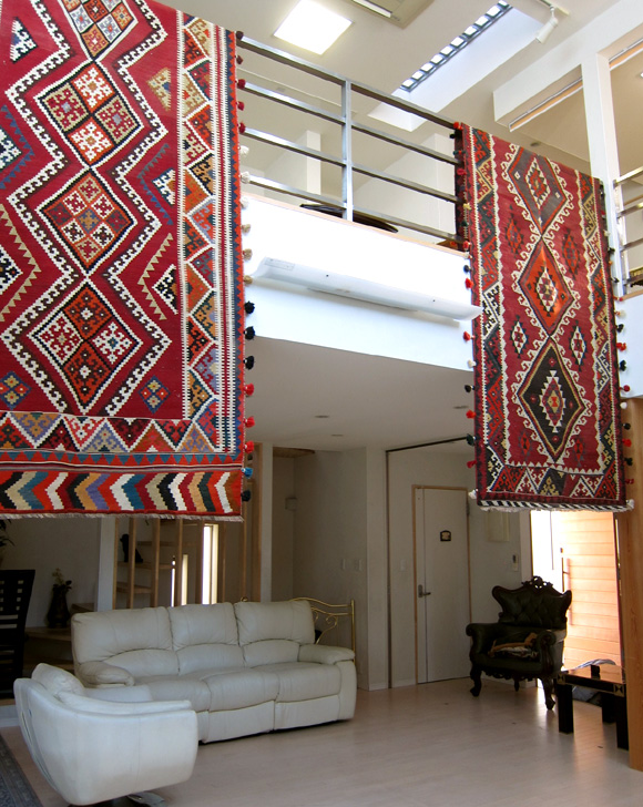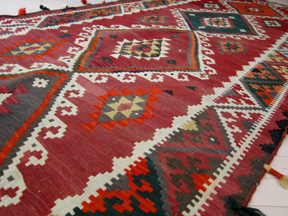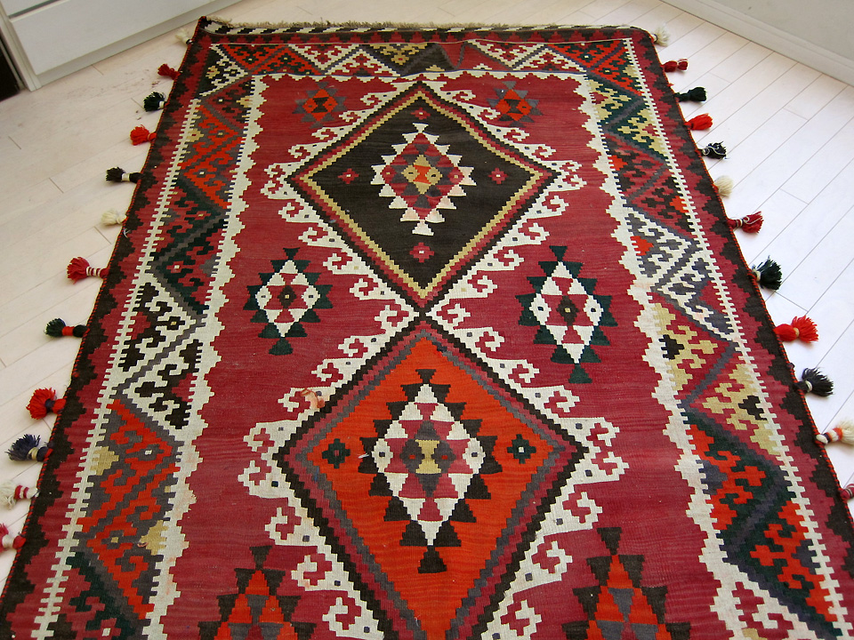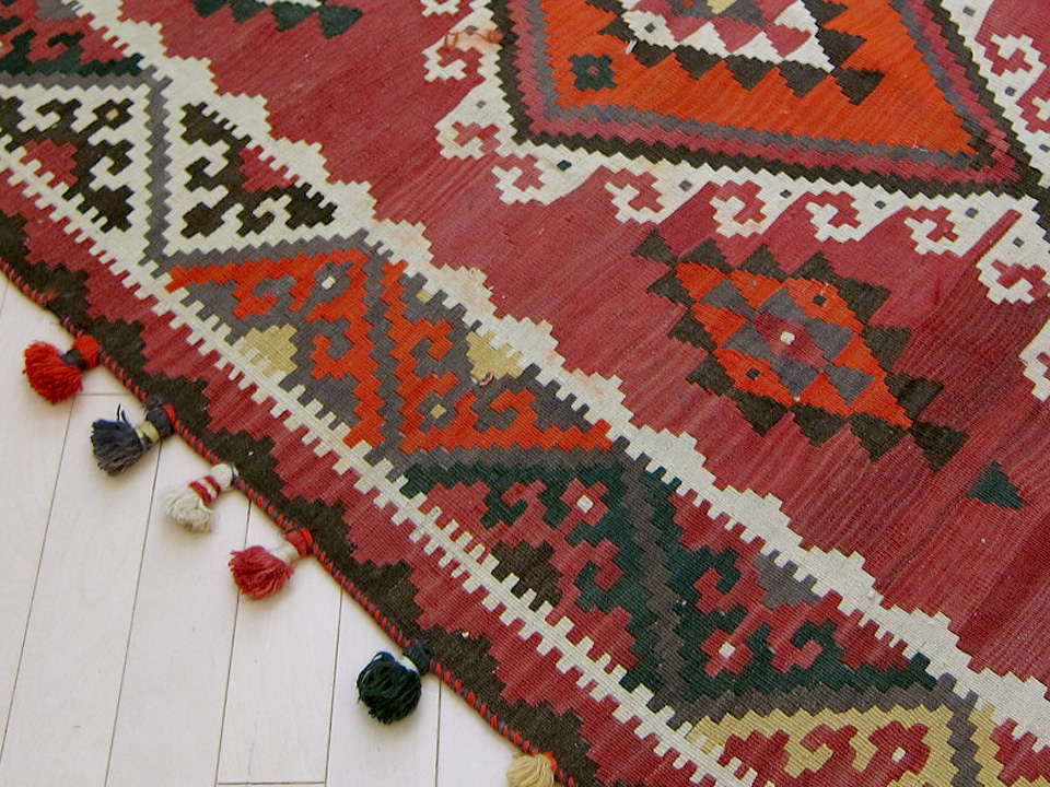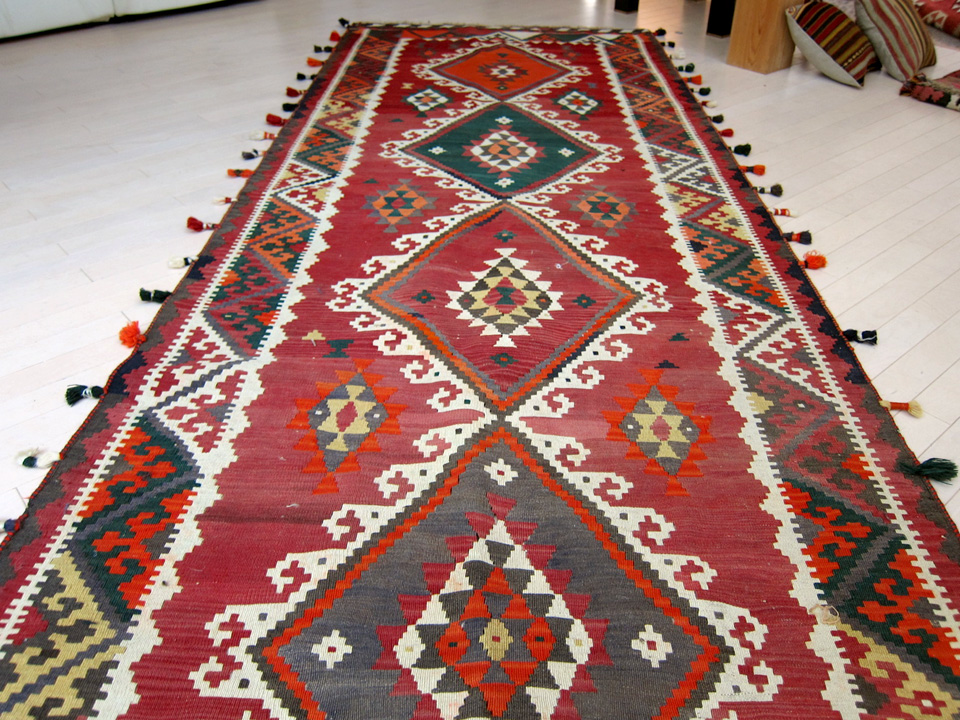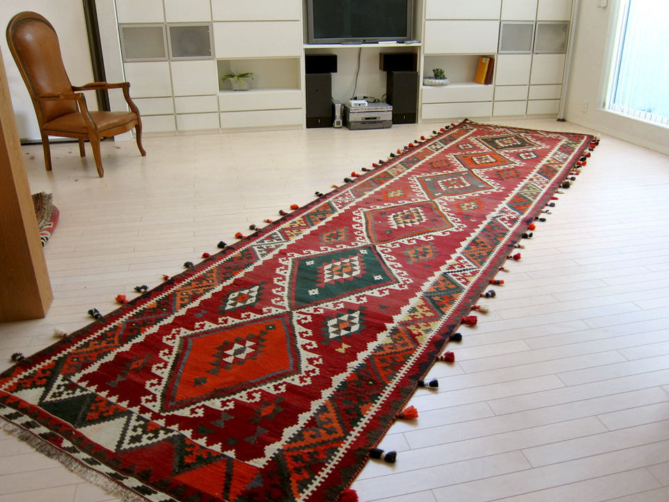 | とにかく長い!!5mを超える特大サイズのビッグランナー。実際には、カシュカイ族のテントの中では、廊下用ではなく、家財道具をカバーして隠すための装飾的に使われたキリムでした。左右両サイドにたくさん取り付けられたポンポンの飾りがとても華やか。年代の測定は定かではないですが、おそらく古い時代に織られて、永い間家族の財産として大切にとってあったものだと思われます。 |