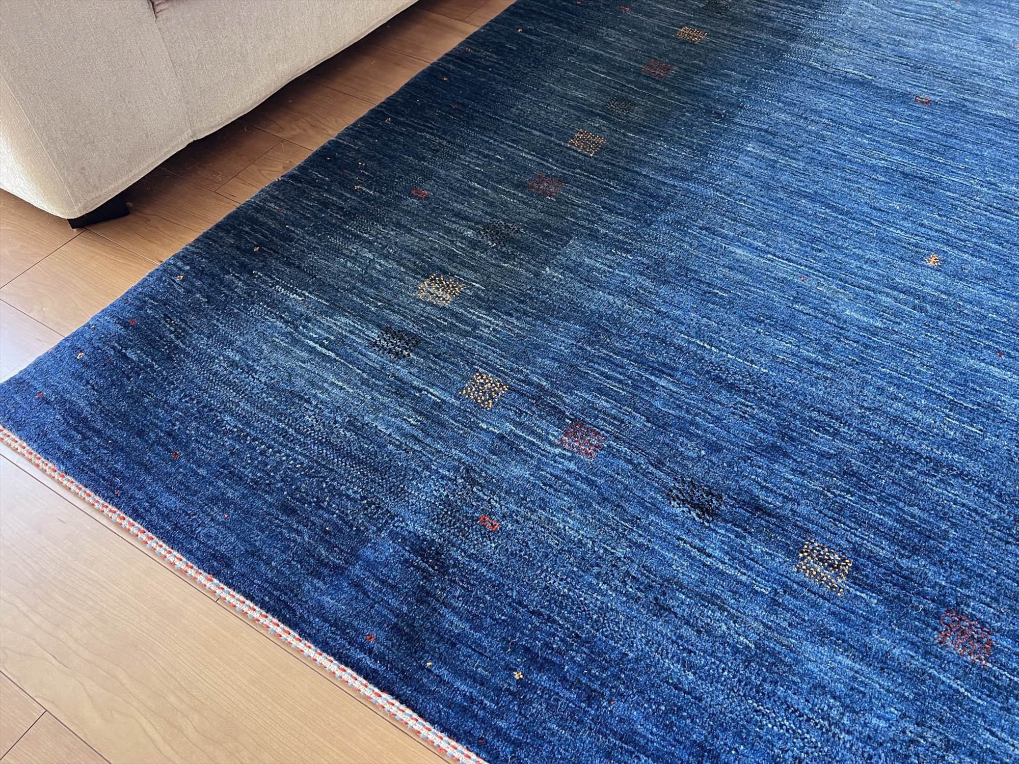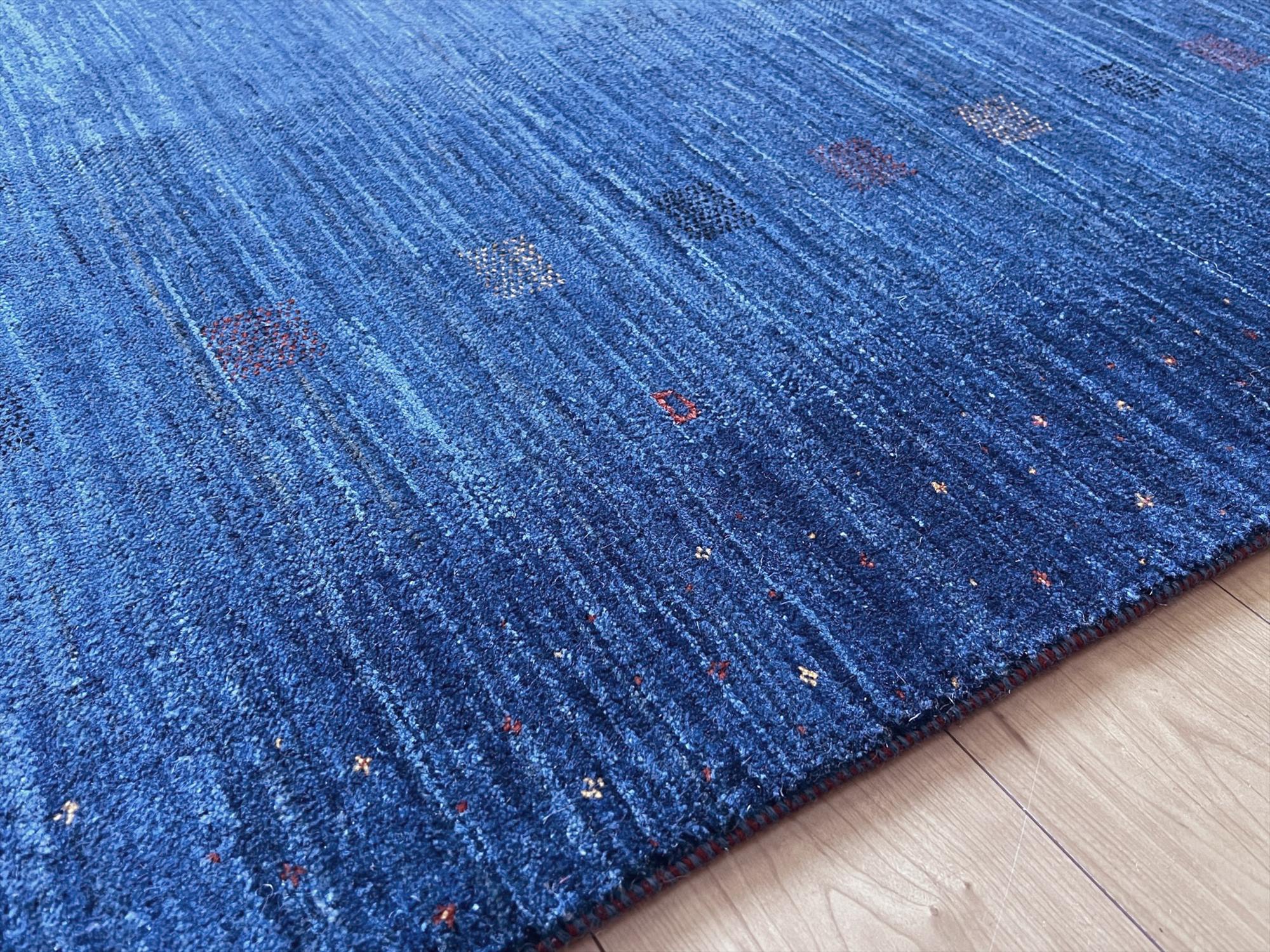 | 落ち着いたブルーの濃淡の色をいかした三重のスクエアを表現したギャッベ。3色のドットでそれぞれ象ったスクエアが周りを囲むように入っています。ブルーの色合いの美しい1ピースです。 |