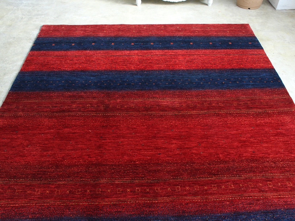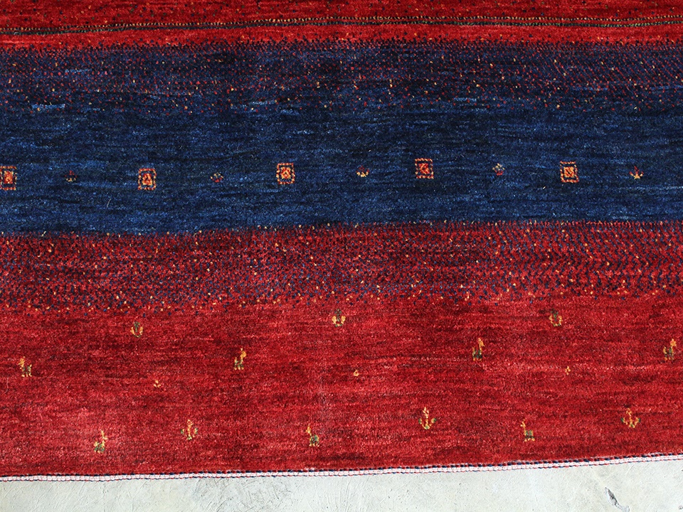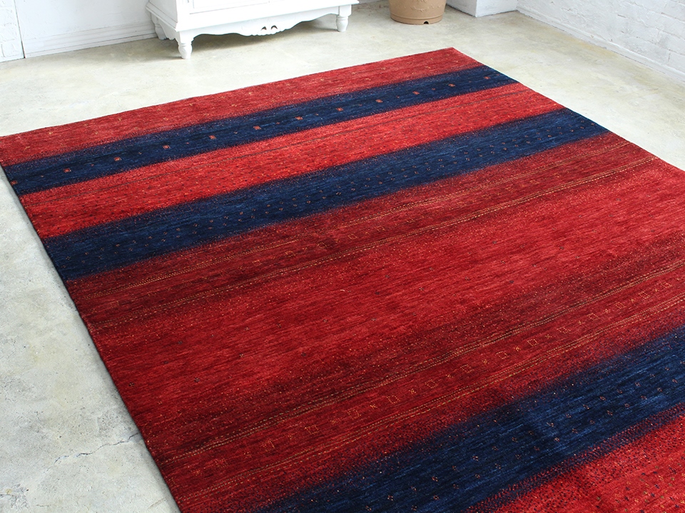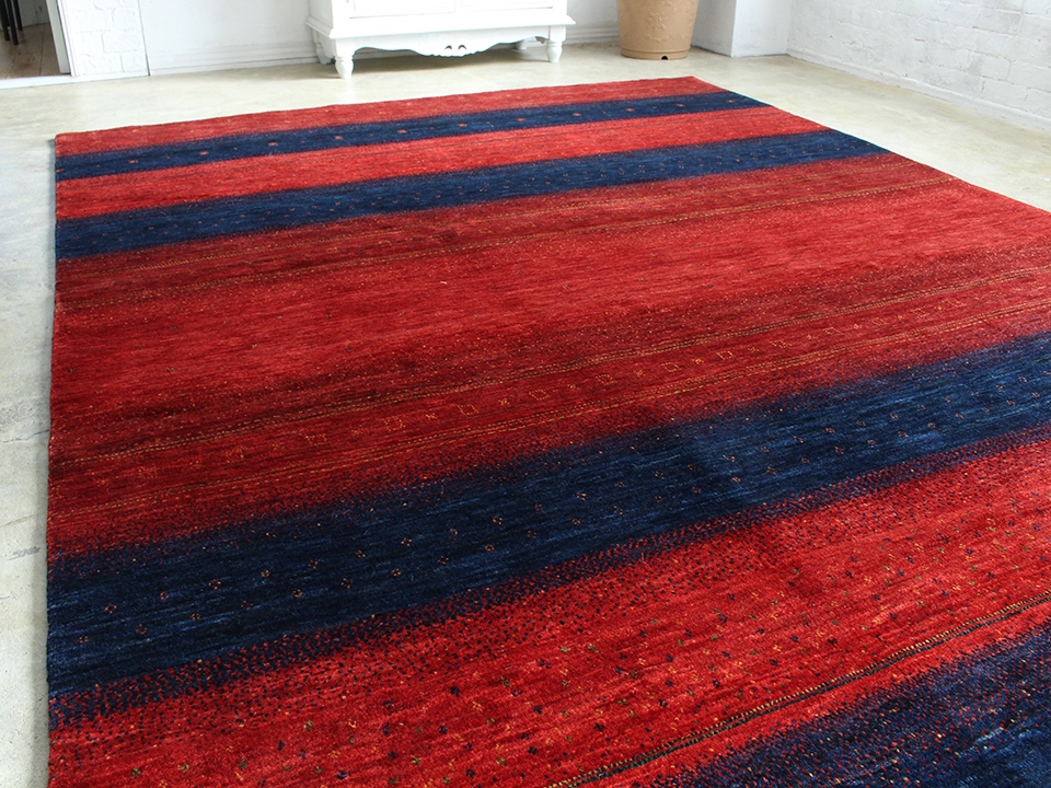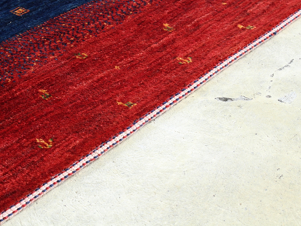 - ギャッベ ギャベ イラン直輸入カシュカイ族手織りラグ・ロリアタシュLoriAtash/大型ルームサイズ レッド/ブルー・2色のボーダーグラデーション・スクエアモチーフ・動物と植物モチーフ