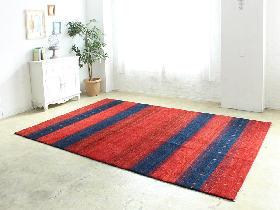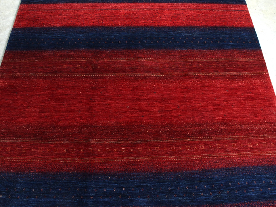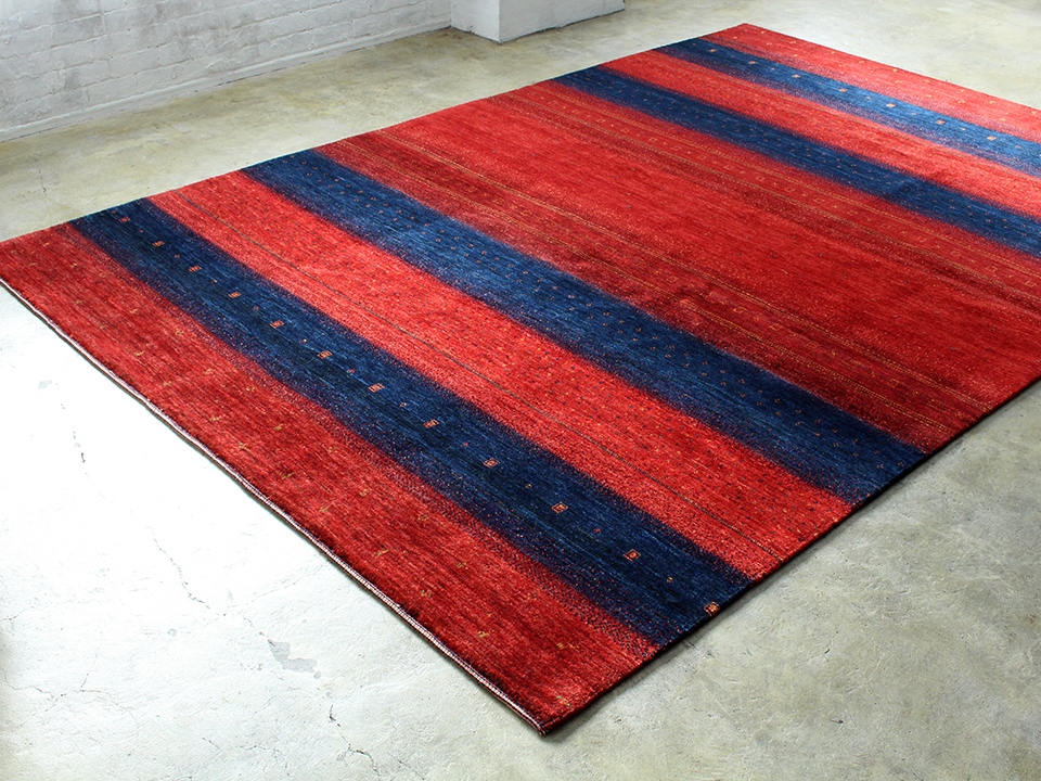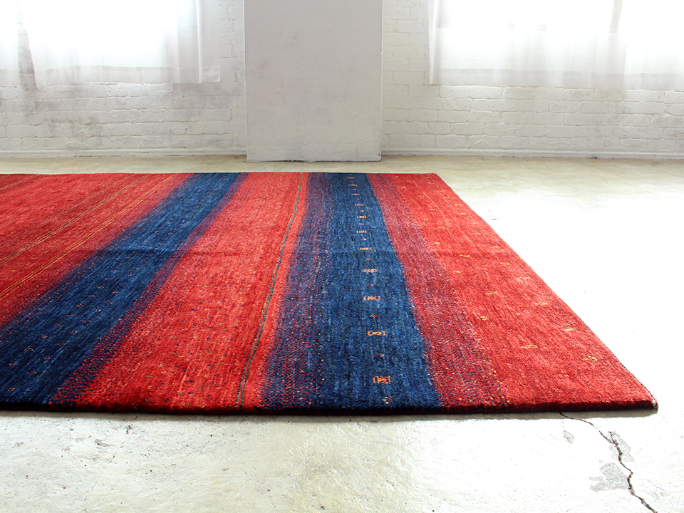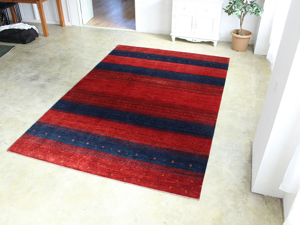 - ギャッベ ギャベ イラン直輸入カシュカイ族手織りラグ・ロリアタシュLoriAtash/大型ルームサイズ レッド/ブルー・2色のボーダーグラデーション・スクエアモチーフ・動物と植物モチーフ