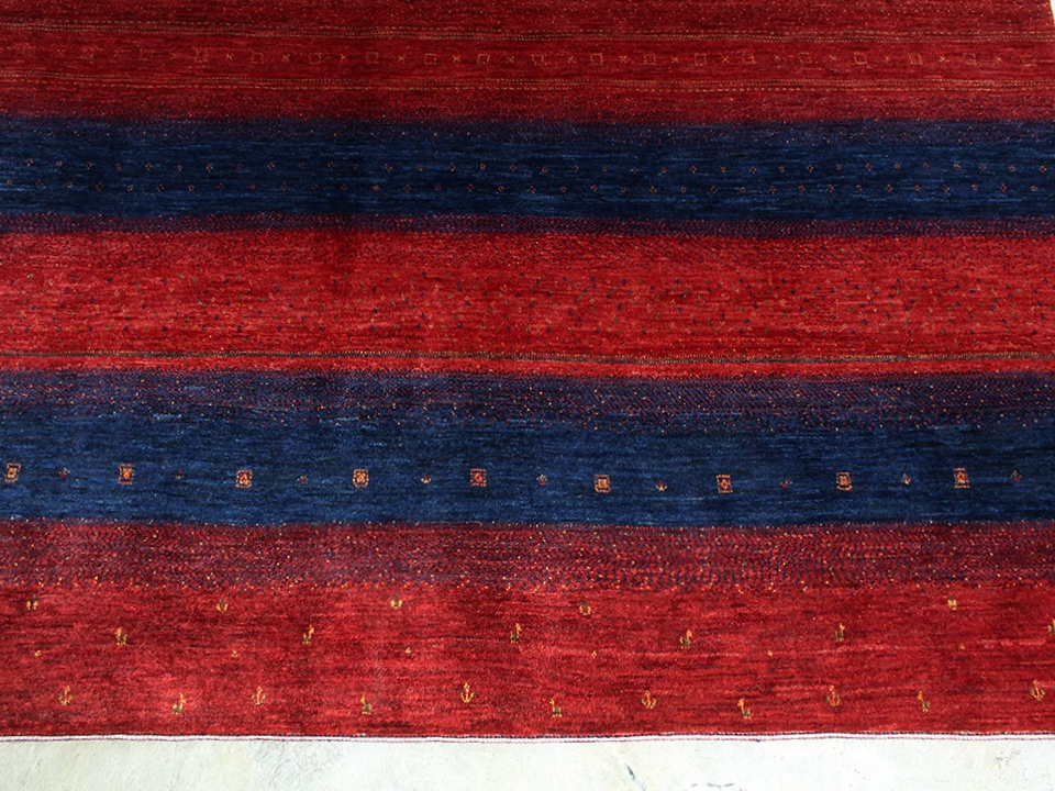 ギャッベ ギャベ イラン直輸入カシュカイ族手織りラグ・ロリアタシュLoriAtash/大型ルームサイズ レッド/ブルー・2色のボーダーグラデーション・スクエアモチーフ・動物と植物モチーフ