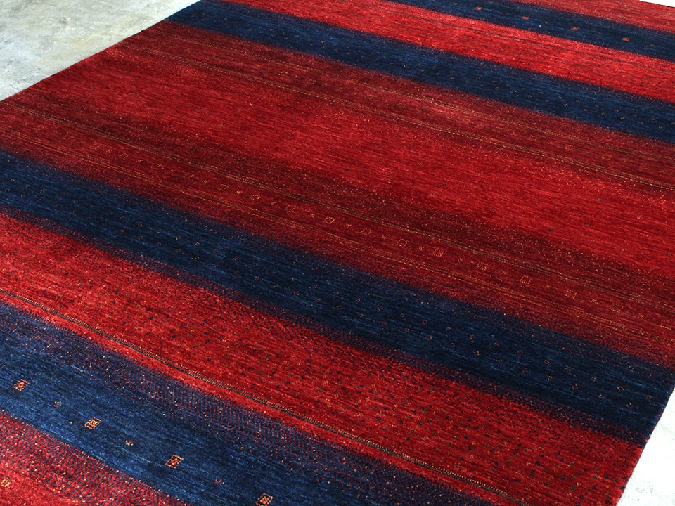 | 深みのあるレッドとネイビーのストライプボーダーのギャッベ。上下には幾何学モチーフや動物と植物モチーフが入っています。 |
