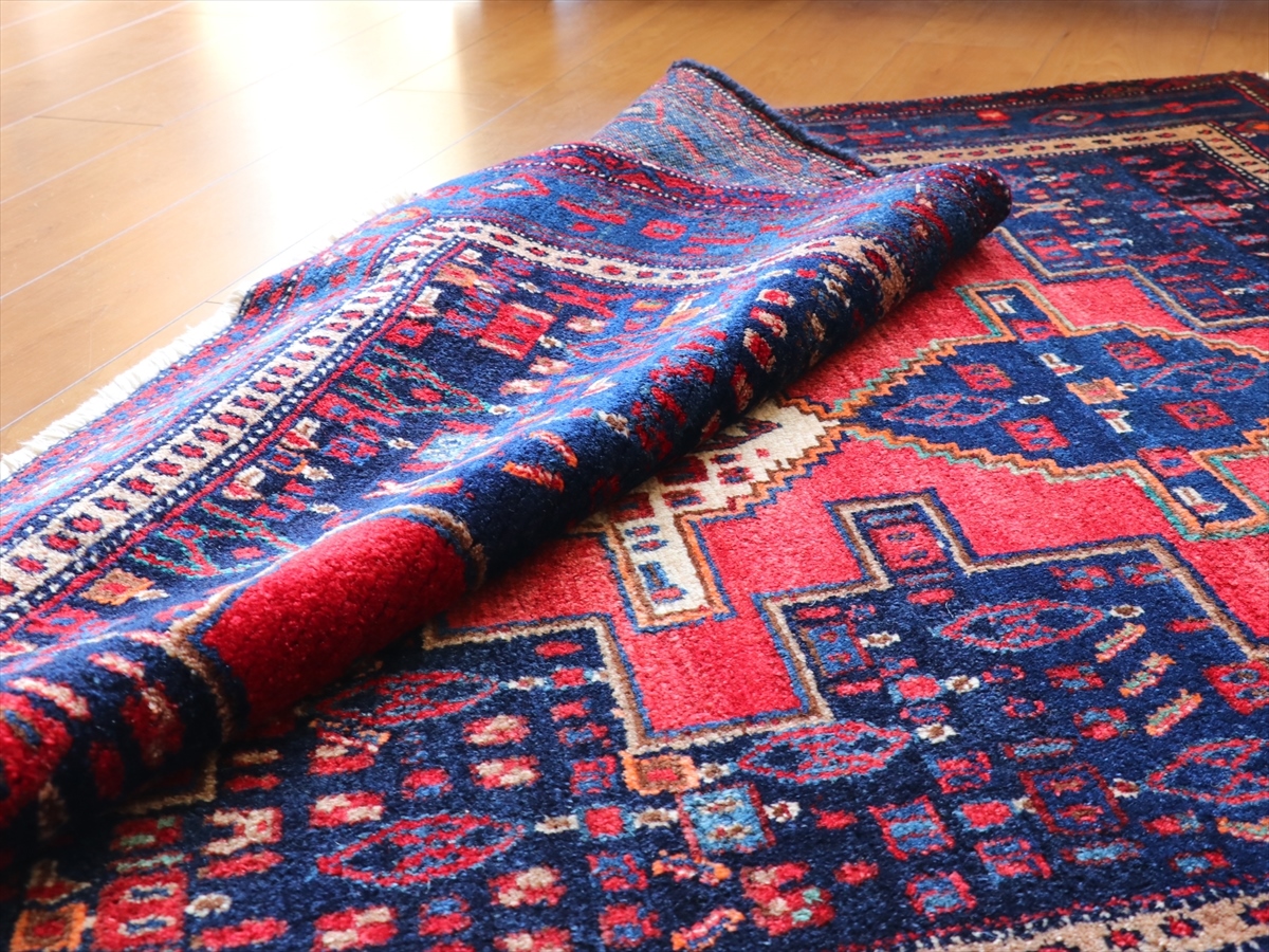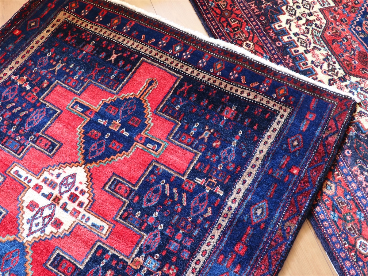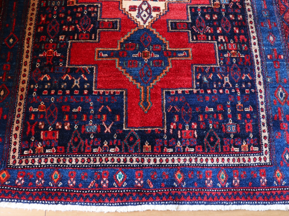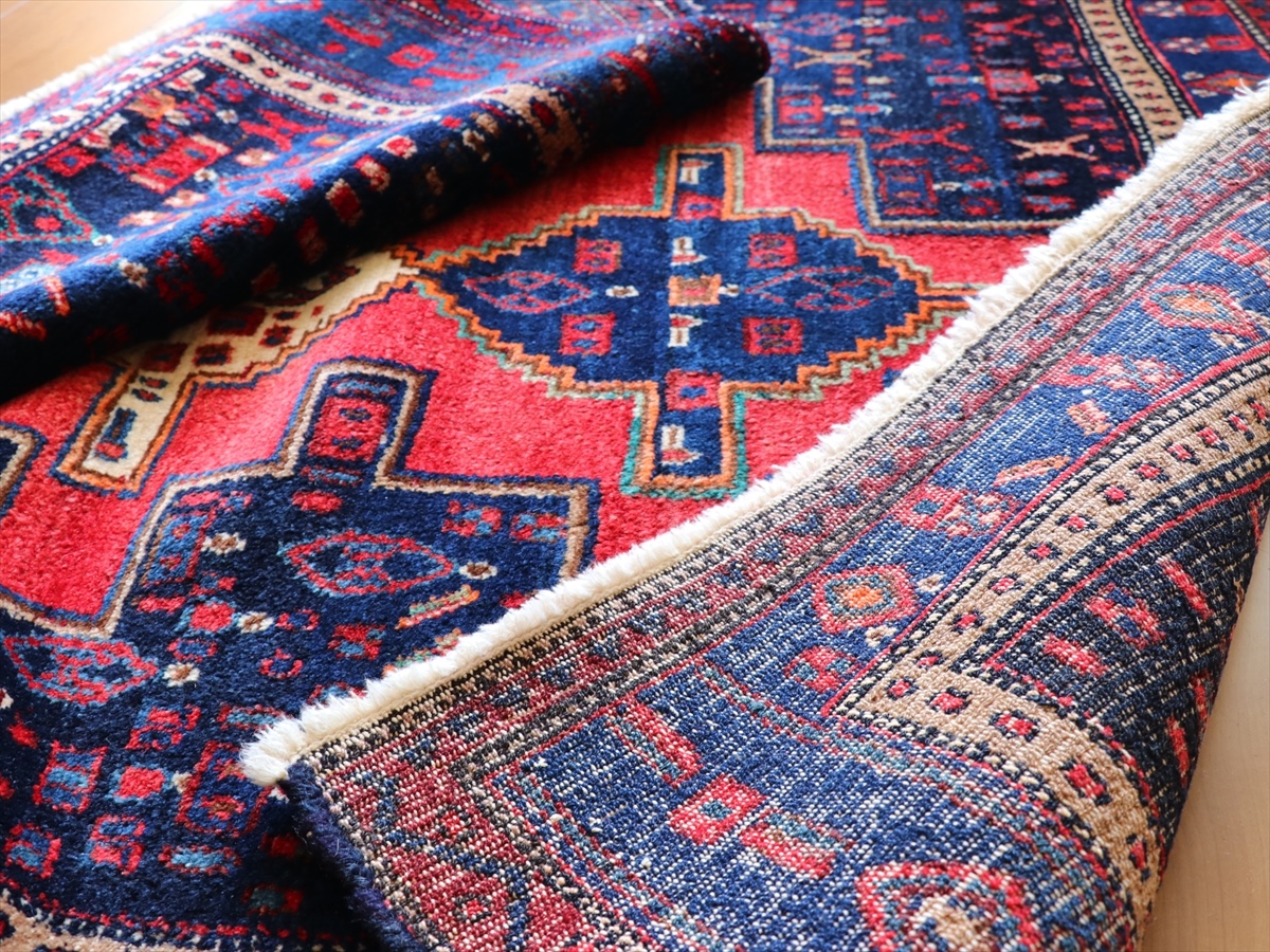 - トライバルラグ・イランの絨毯/セッヂャーデ サナンダージ/連なる赤いダイヤのメダリオン