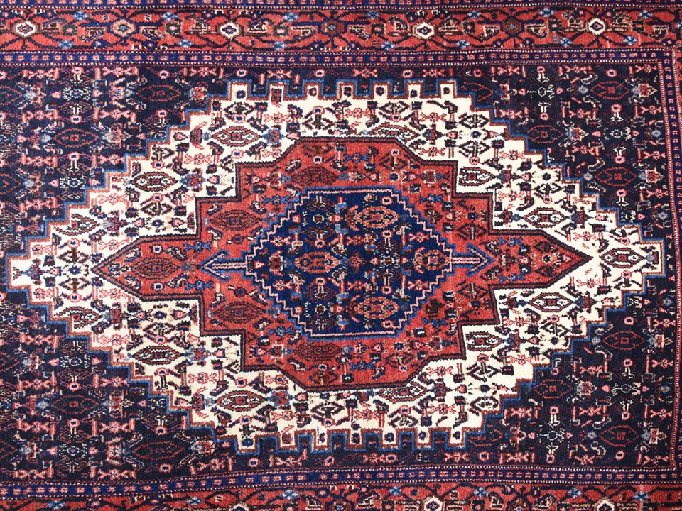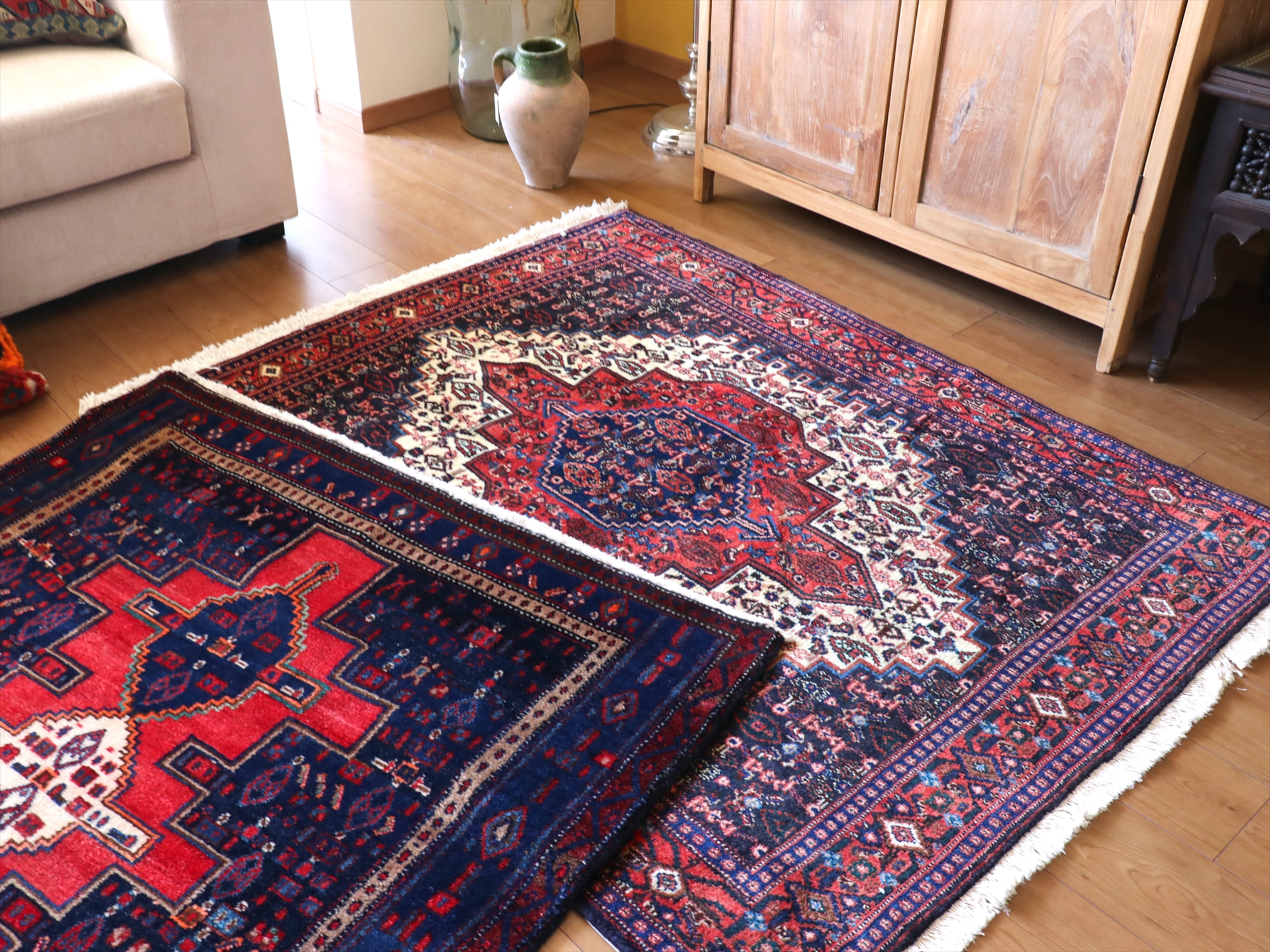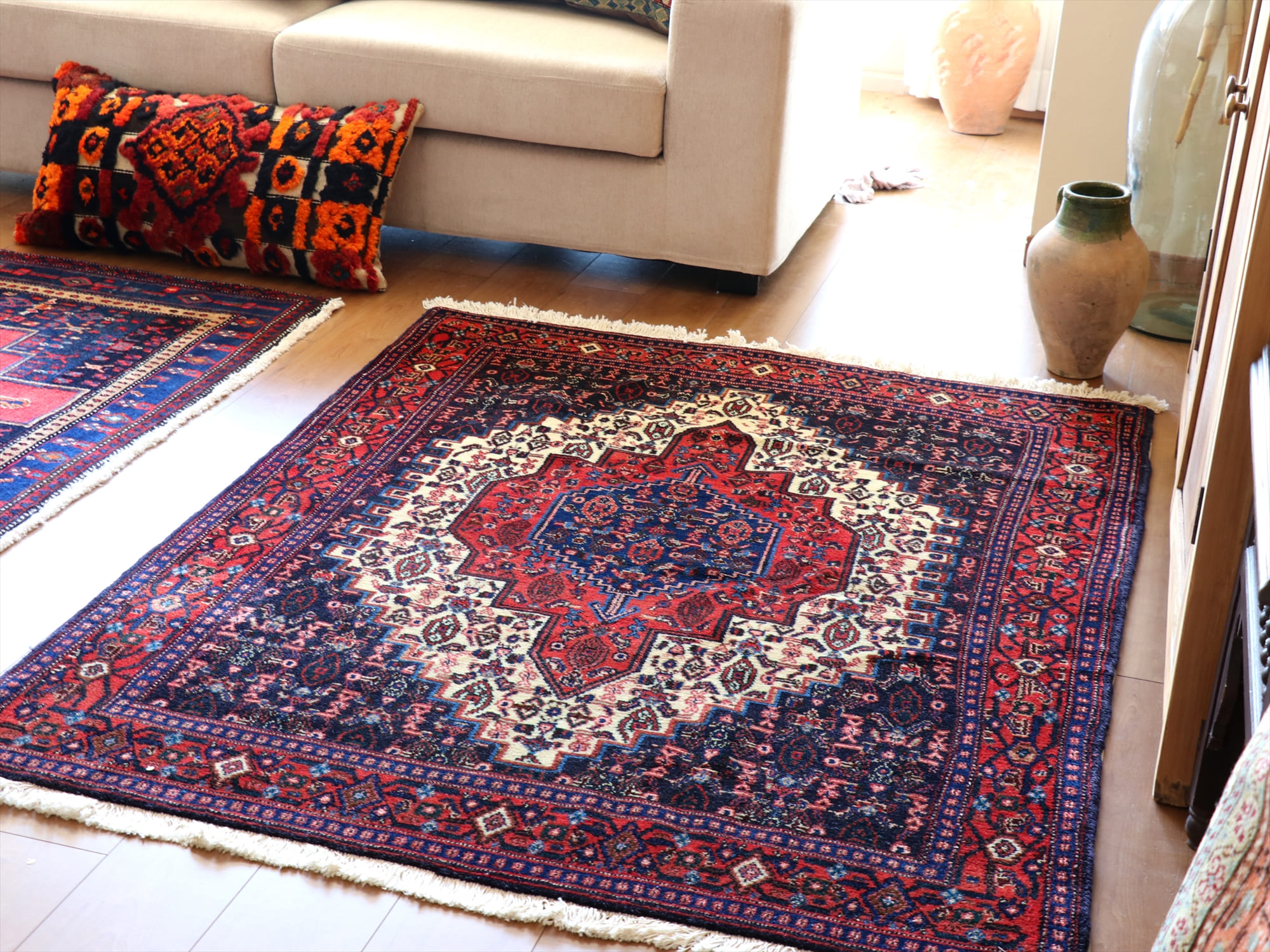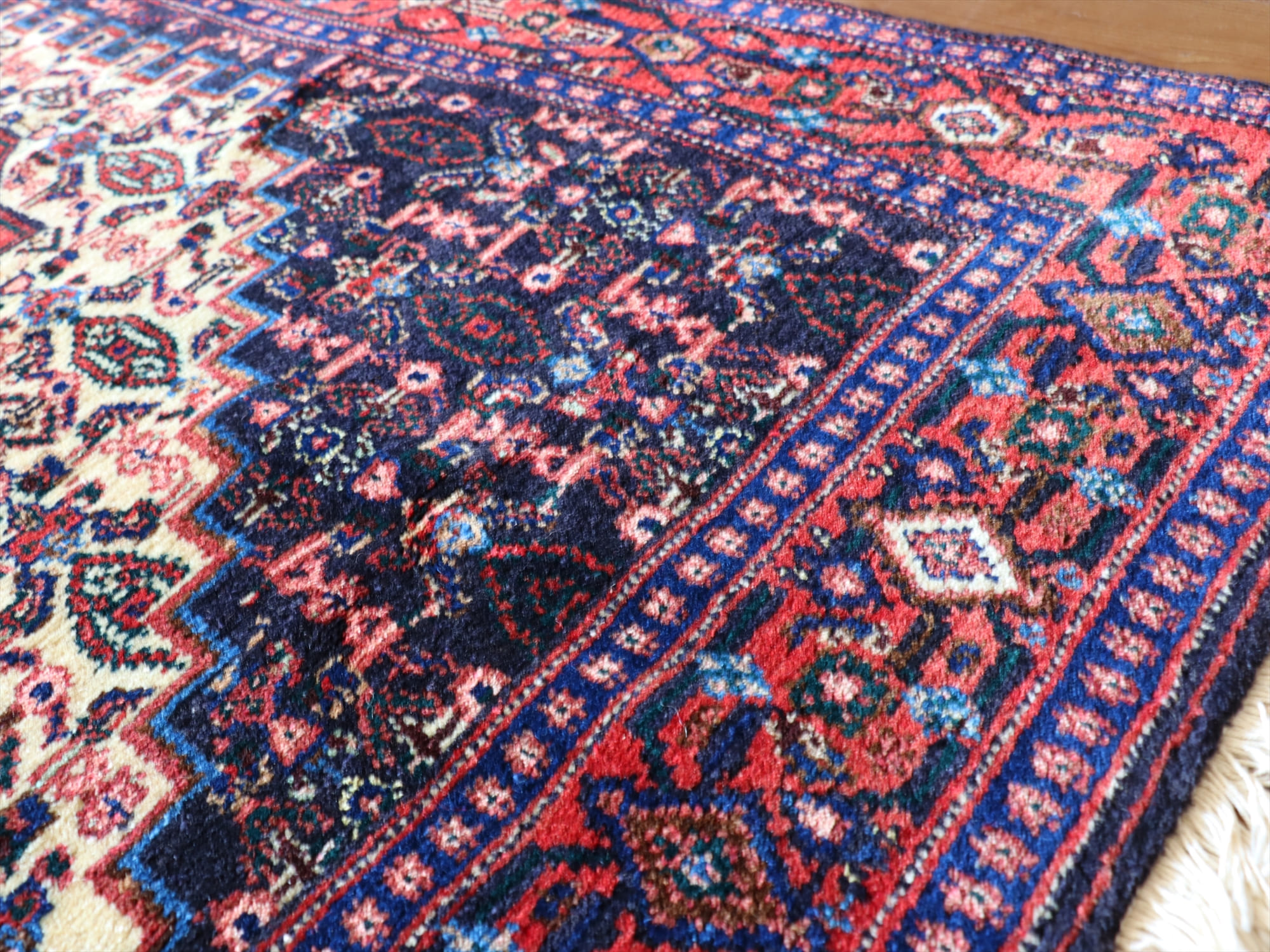 | イラン西部、トルコとの国境に近いエリアのオールドラグ。細かな花のモチーフがならんだアラベスク模様のデザインで、幾何学模様で織られるトルコじゅうたんとは違ったテイストです。 |