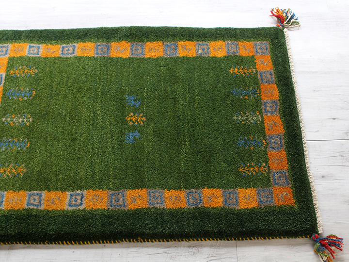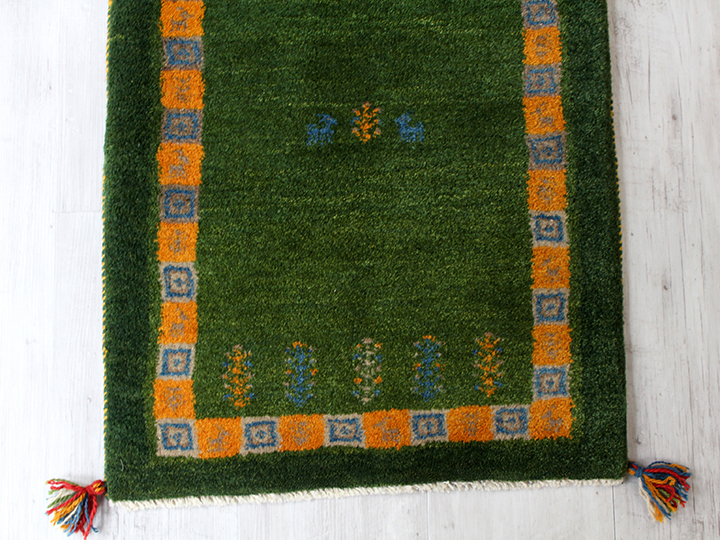 - ギャッベ/玄関マットサイズ スタンダードな織り グリーン&タイルボーダー 動物と植物モチーフ