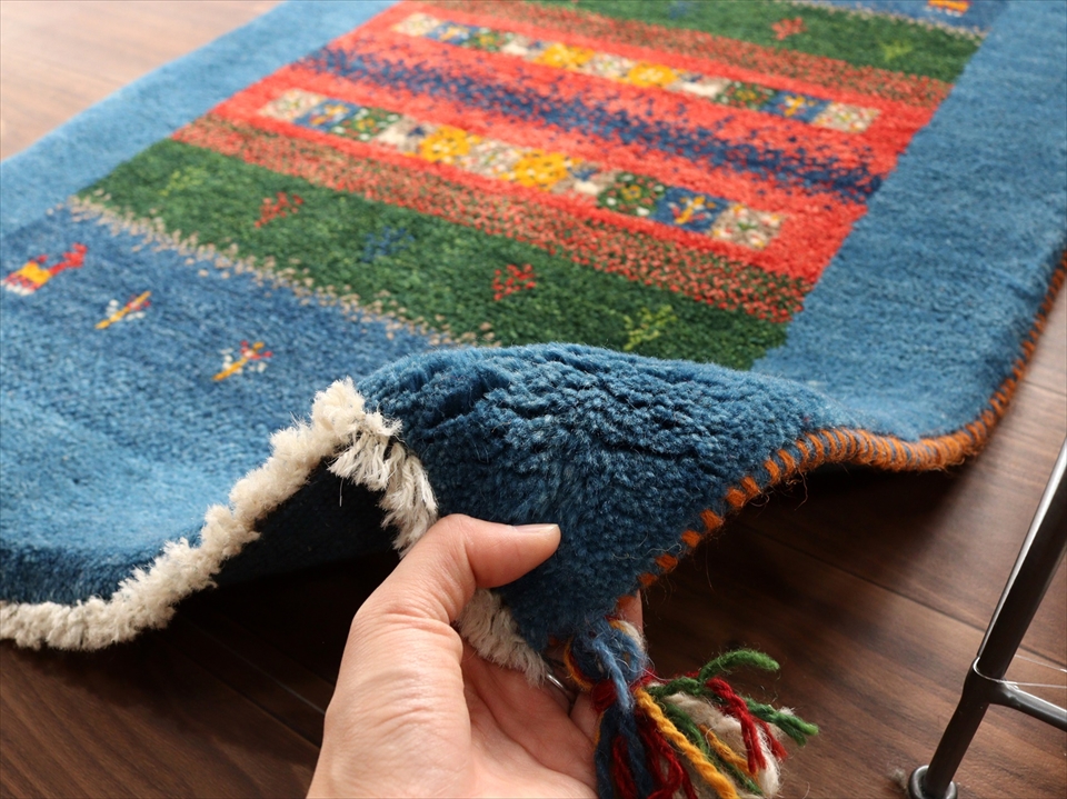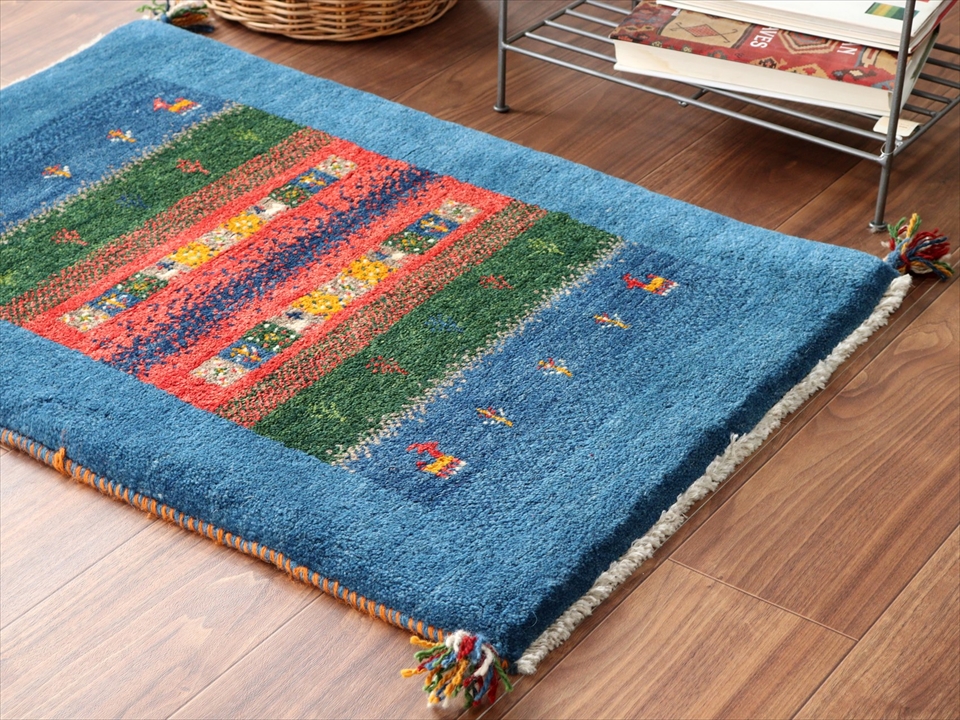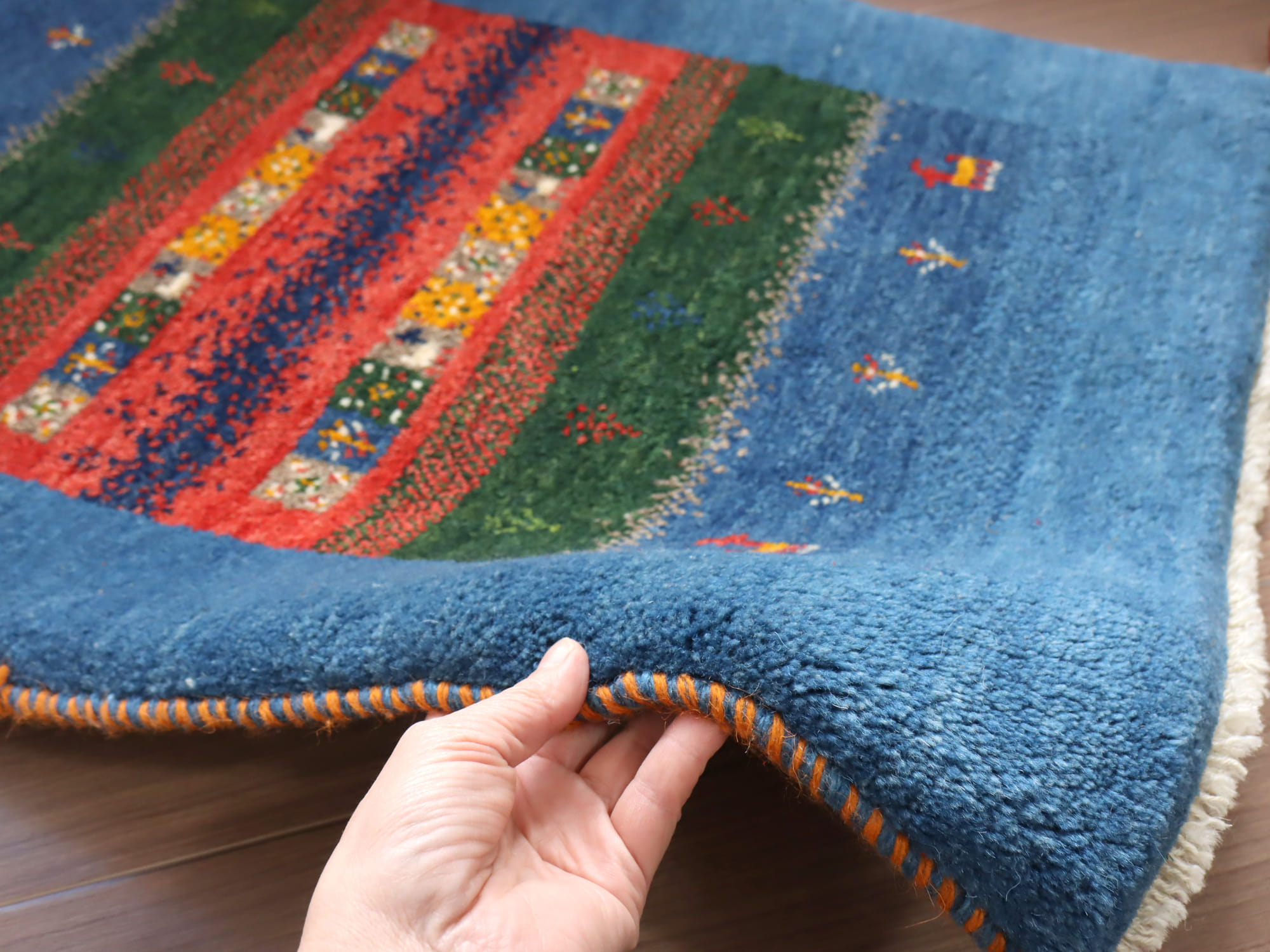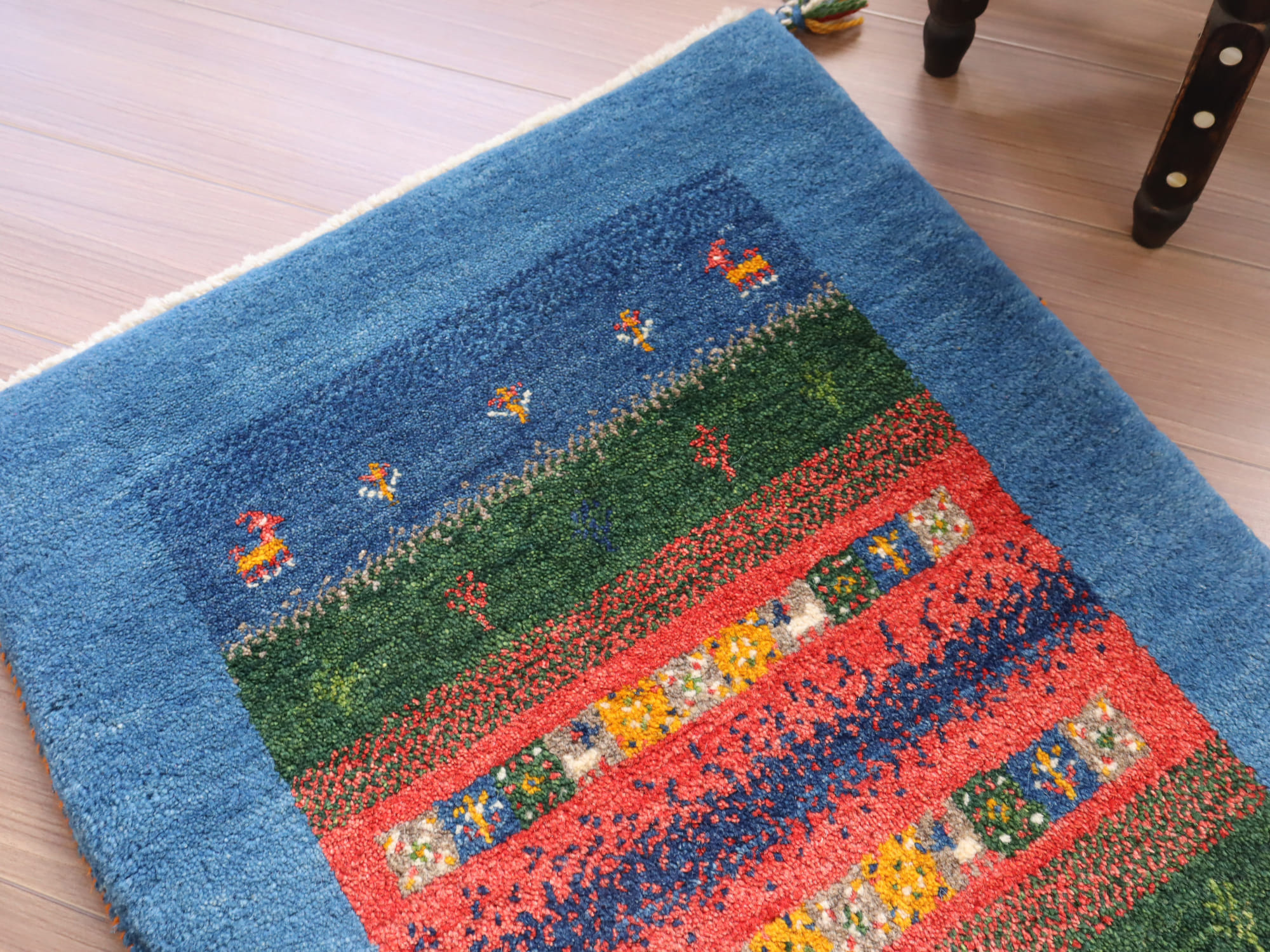 ギャッベ・玄関マットサイズ92×63cmブルー・ミックス ボーダー 動物と植物モチーフ