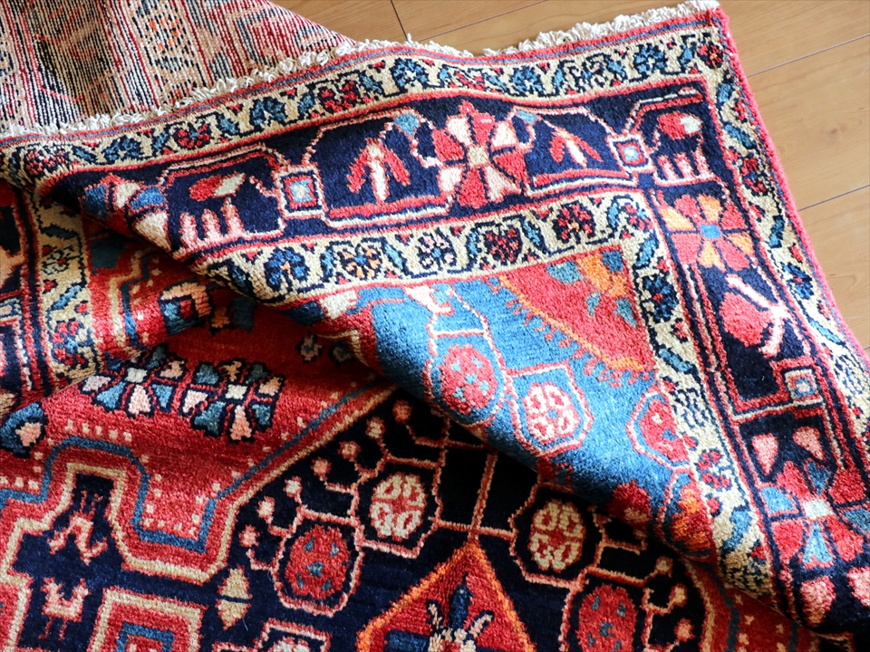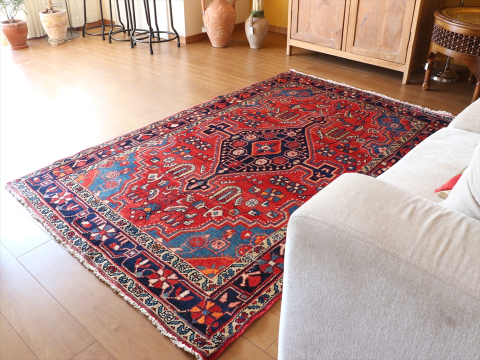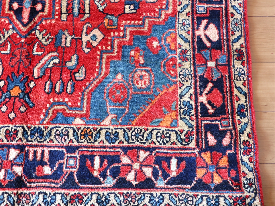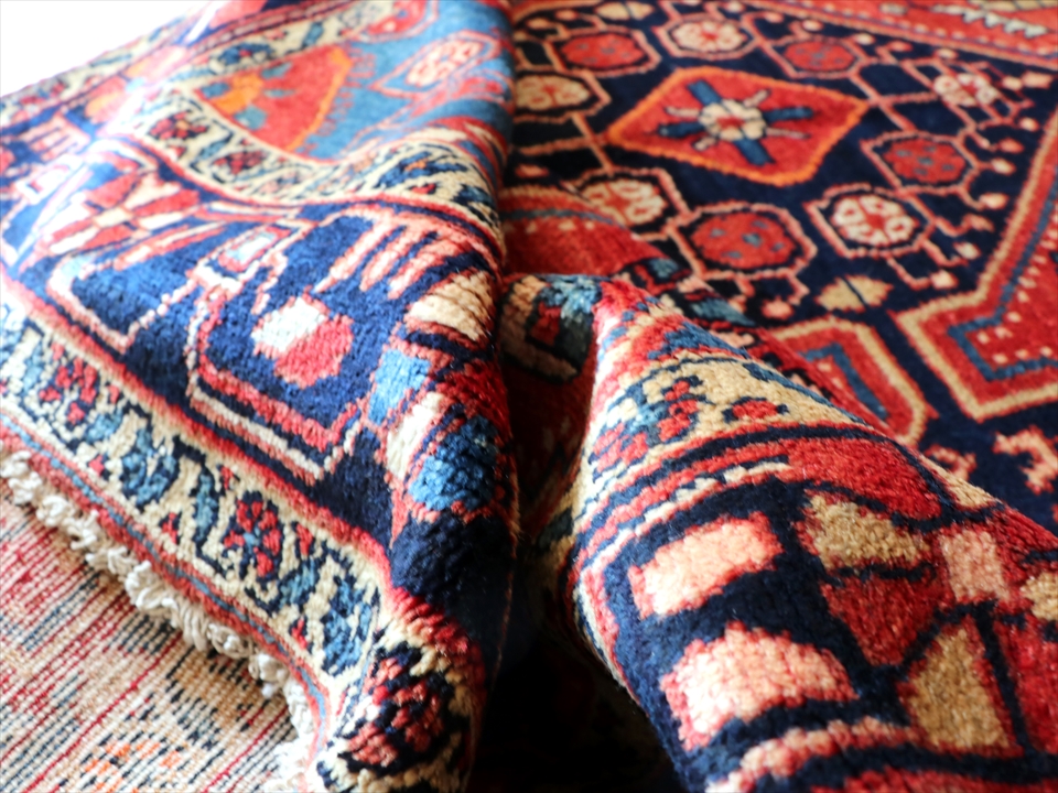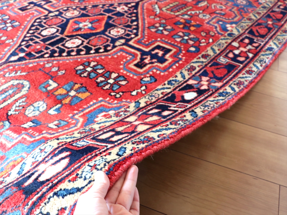 | イラン南部の古都シラーズから南部の地域で暮らす遊牧民の織ったじゅうたんです。一般にハムセ連合(アラブ)と呼ばれ、トルコ語に近い言葉を話すカシュカイ族と区別される、遊牧民のグループです。デザイン的には、カシュカイのじゅうたんととてもよく似ていて、区別がつきづらいのですが、六角形のカタチや赤いフィールドに収められたモチーフを見ると、確かにカシュカイカーペットにはあまり見られないデザインが登場しています。四角の枠部分には淡いブルーの毛糸が使われており、赤い部分との対比が美しい一枚です。 |