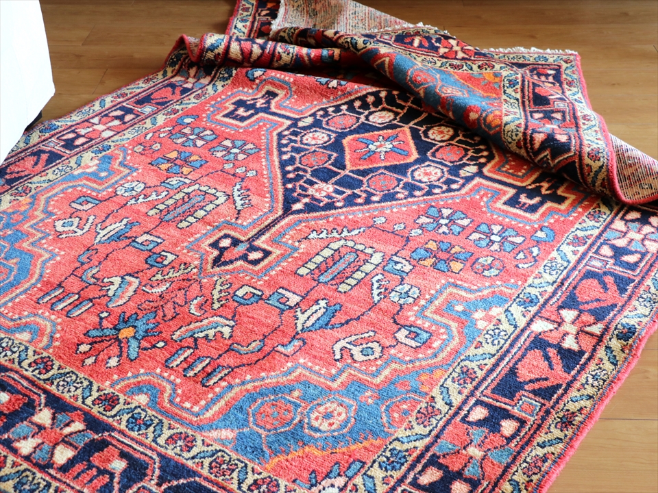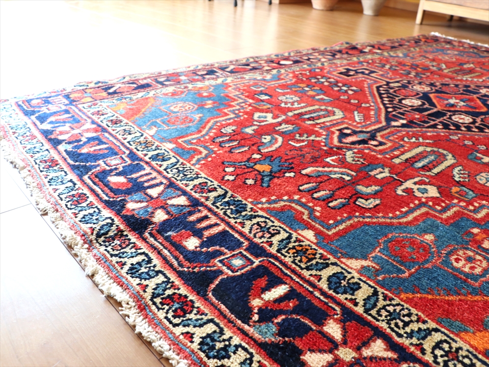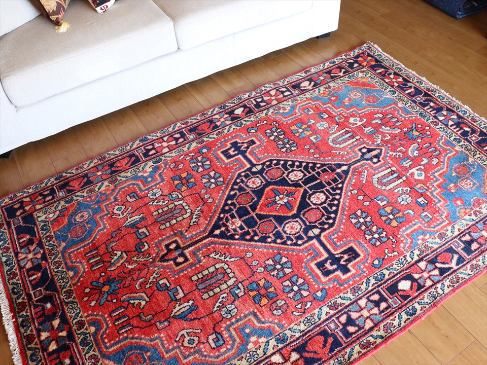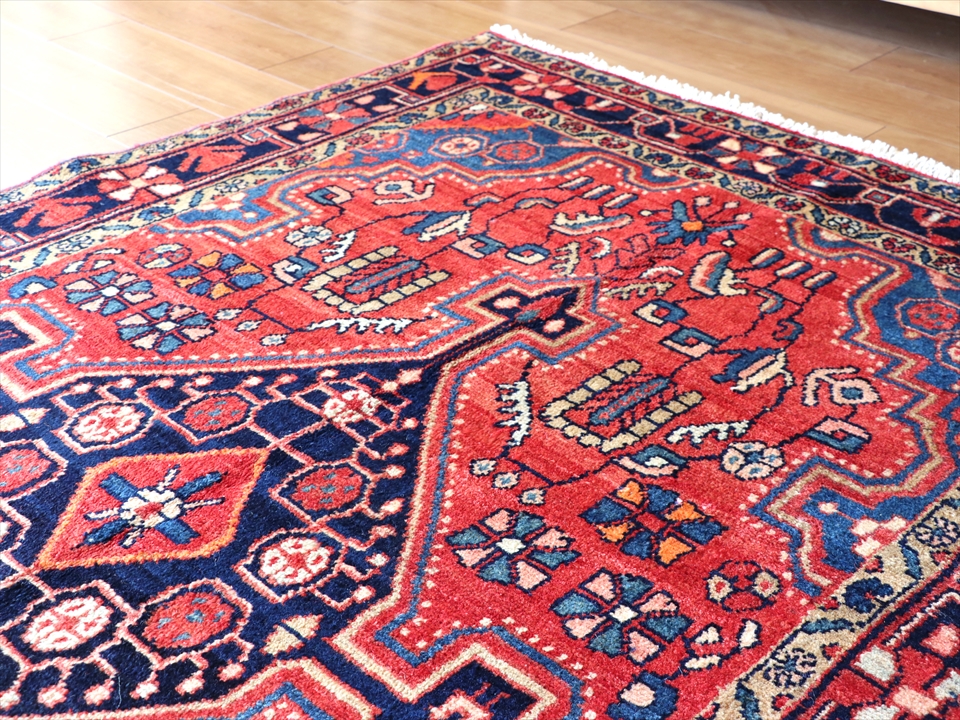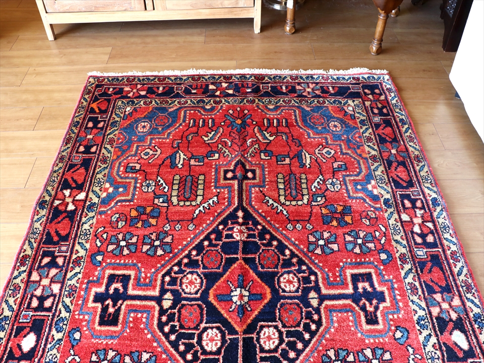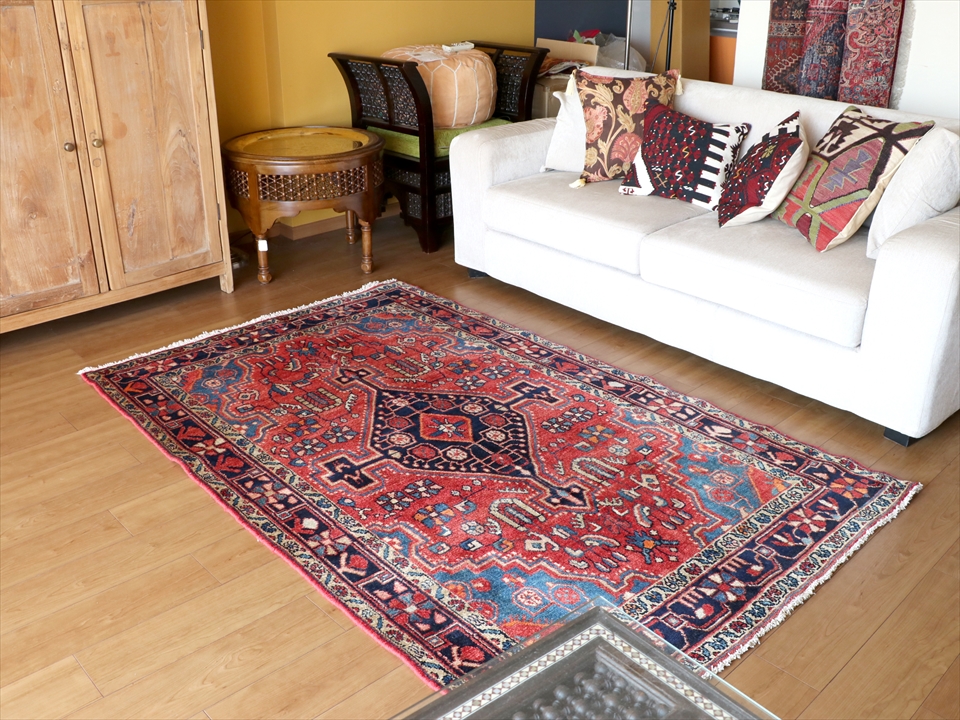 | イラン南部の古都シラーズから南部の地域で暮らす遊牧民の織ったじゅうたんです。一般にハムセ連合(アラブ)と呼ばれ、トルコ語に近い言葉を話すカシュカイ族と区別される、遊牧民のグループです。デザイン的には、カシュカイのじゅうたんととてもよく似ていて、区別がつきづらいのですが、六角形のカタチや赤いフィールドに収められたモチーフを見ると、確かにカシュカイカーペットにはあまり見られないデザインが登場しています。四角の枠部分には淡いブルーの毛糸が使われており、赤い部分との対比が美しい一枚です。 |