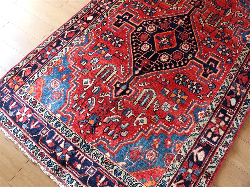 トライバルラグ・オールドカーペット/シラーズ・ハムセ センターラグサイズ レッド/六角形の青いメダリオン