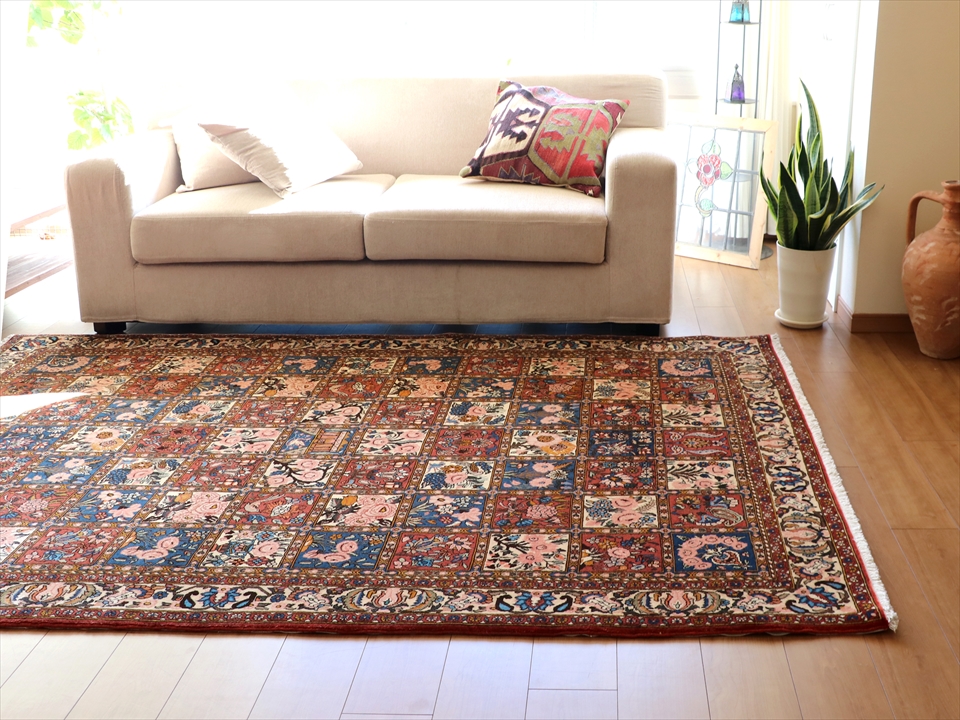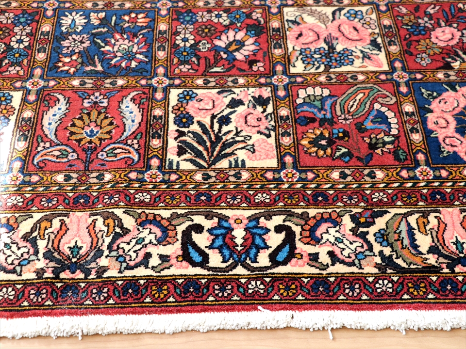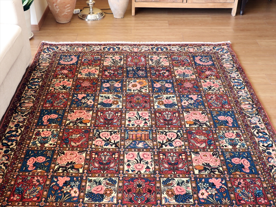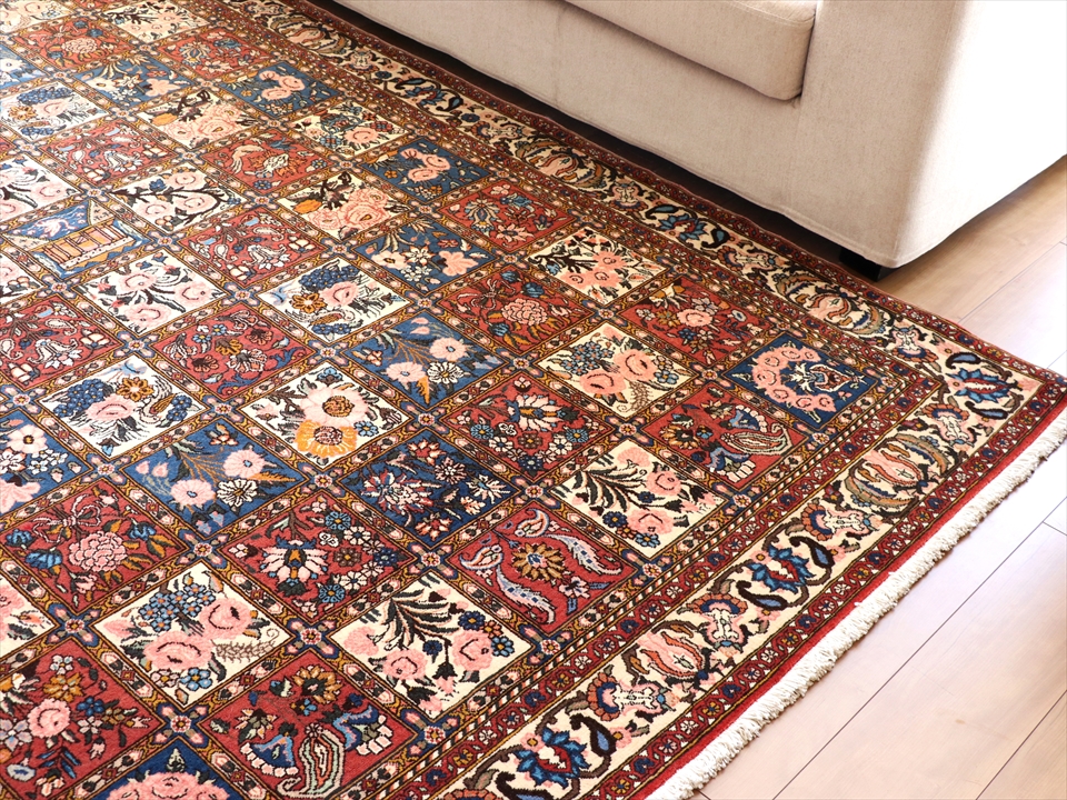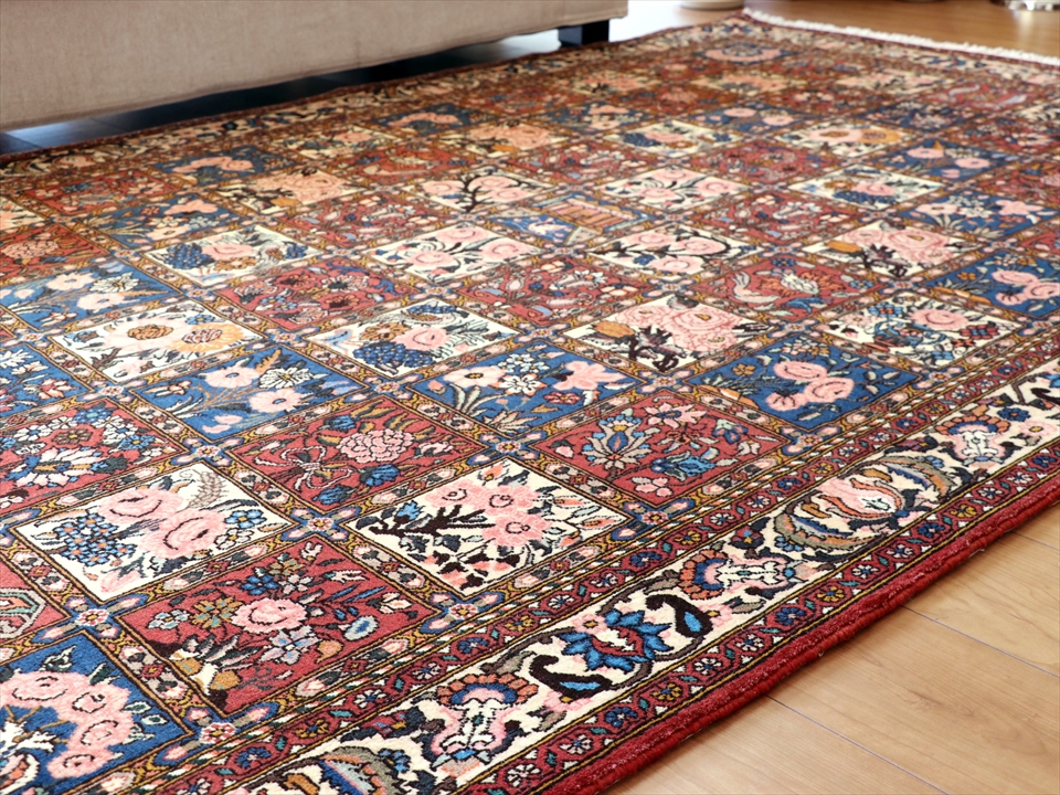 | 鮮やかな色彩が使われたバクティアリ族のカーペット。縦横に小道で区切られて、それぞれの区画にはバラや柳の木が植えられています。ガーデンデザインは、16世紀ごろのカーペットから受け継がれた伝統柄で、アラベスクとは一味違う、クラシカルなペルシャ絨毯です。 |