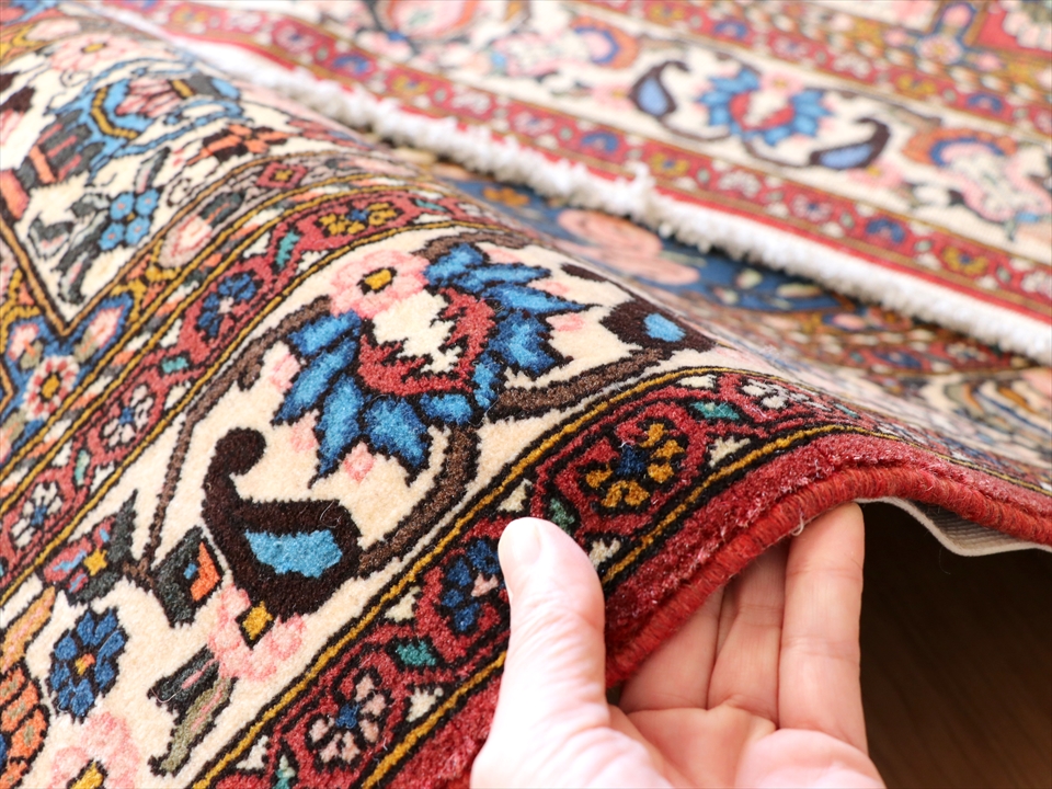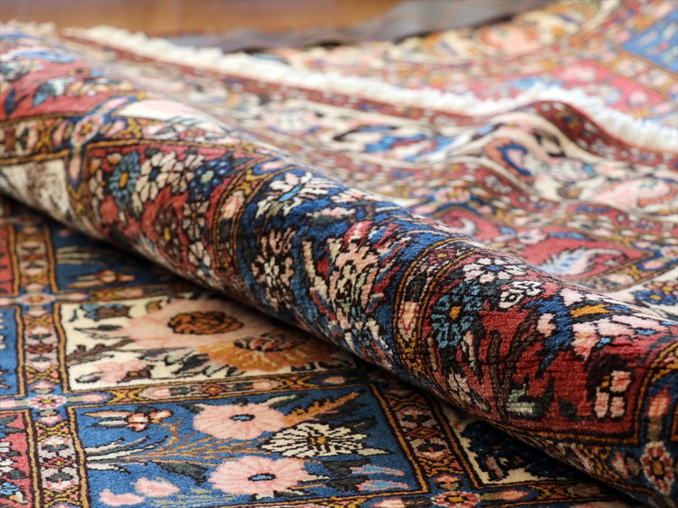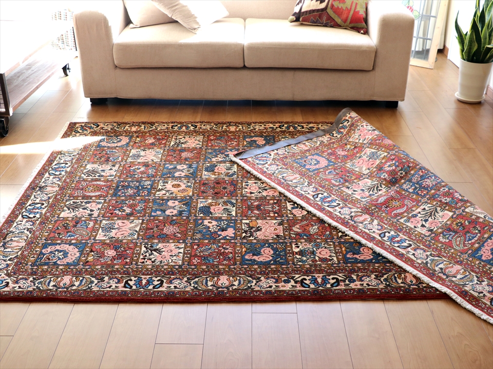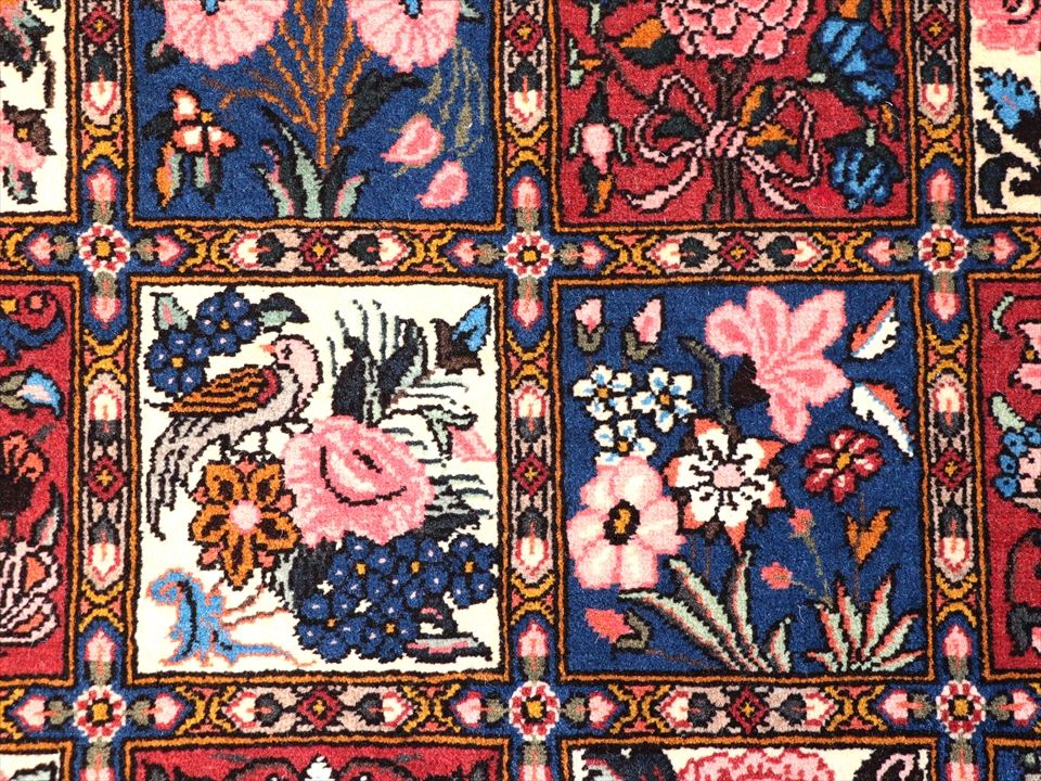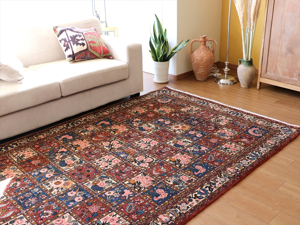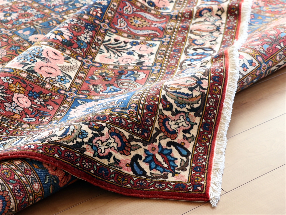| 鮮やかな色彩が使われたバクティアリ族のカーペット。縦横に小道で区切られて、それぞれの区画にはバラや柳の木が植えられています。ガーデンデザインは、16世紀ごろのカーペットから受け継がれた伝統柄で、アラベスクとは一味違う、クラシカルなペルシャ絨毯です。 |