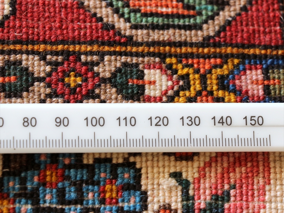 | 目がギュッと詰まって、ふっくらとした厚みがあり、表面は滑らか。およそ1cm程度の厚さで、10センチ当たりに50-55目程度の結び目がある、細かな織りのカーペットです。裏側には保護用ベルトが縫い付けられています。 |