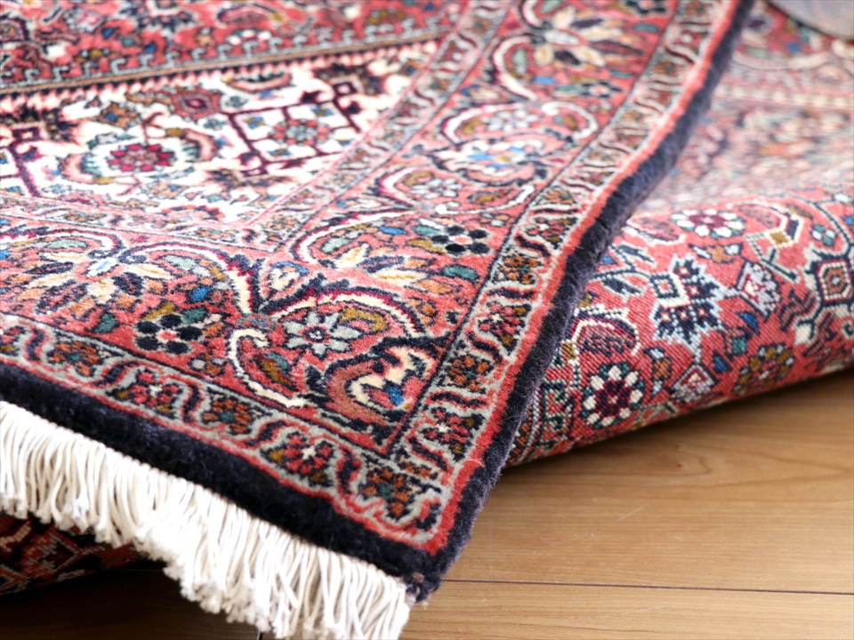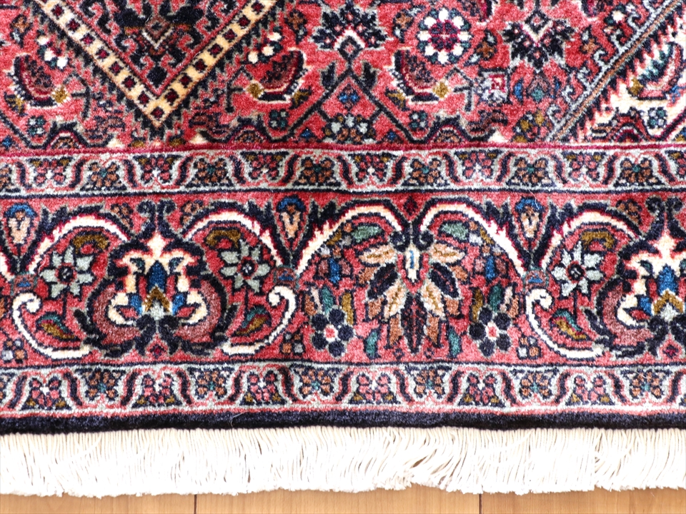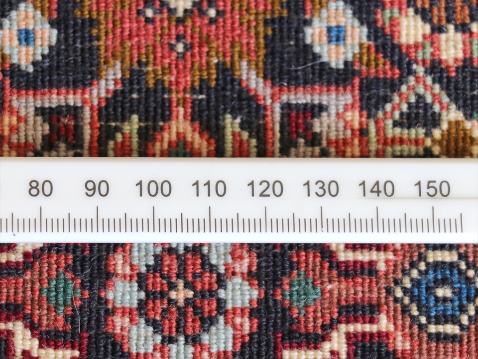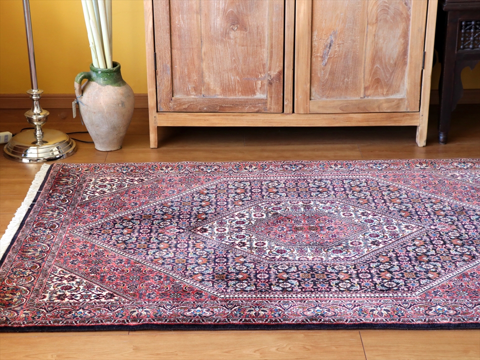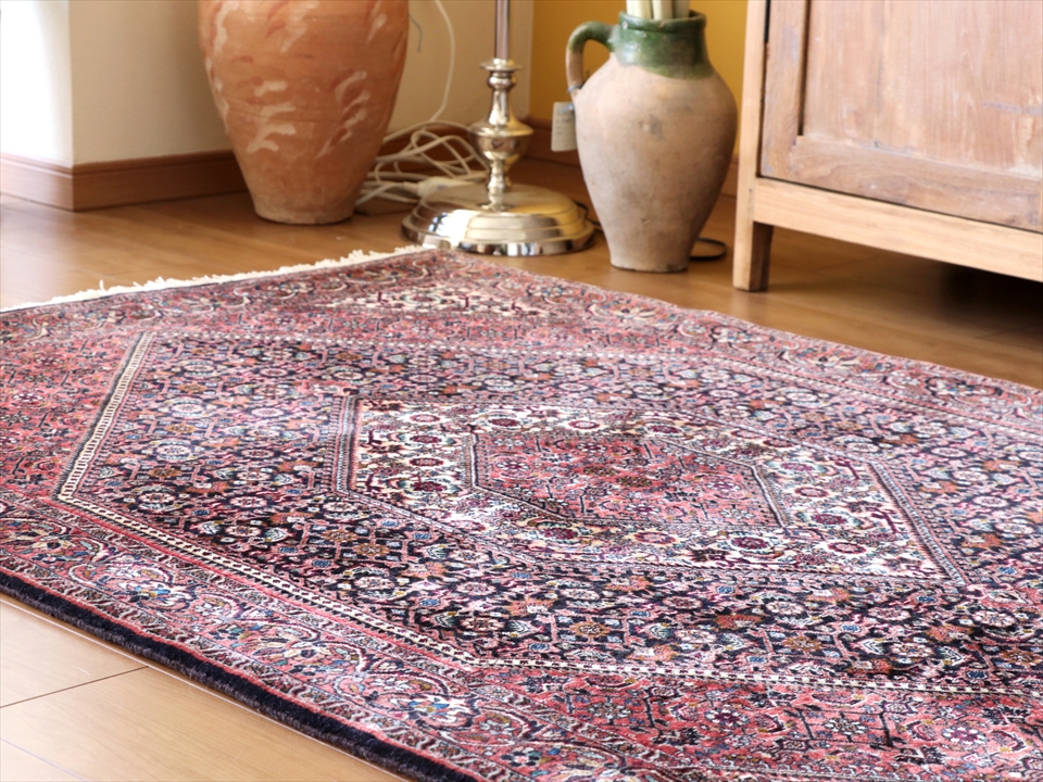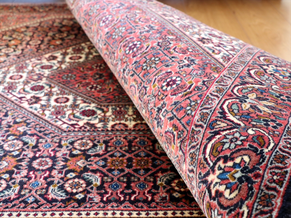 | イラン北西にある都市ビジャールで織られたじゅうたんです。この地域には主にクルド系の民族が住んでおり、絨毯はトルコ結びで作られています。ビジャールのじゅたんは織りの目が詰まっており、砂やほこりが入りにくいため耐久性に優れていると言われています。ビジャールのじゅうたんには多くのデザインがあり、こちらのじゅたんは直線的な六角形のメダリオンが特徴的です。メダリオンはブラックのベースにカラフルな小さな花の模様が散りばめれています。アイボリーの枠と四角がアクセントとなり六角形のデザインを引き立てています。 |