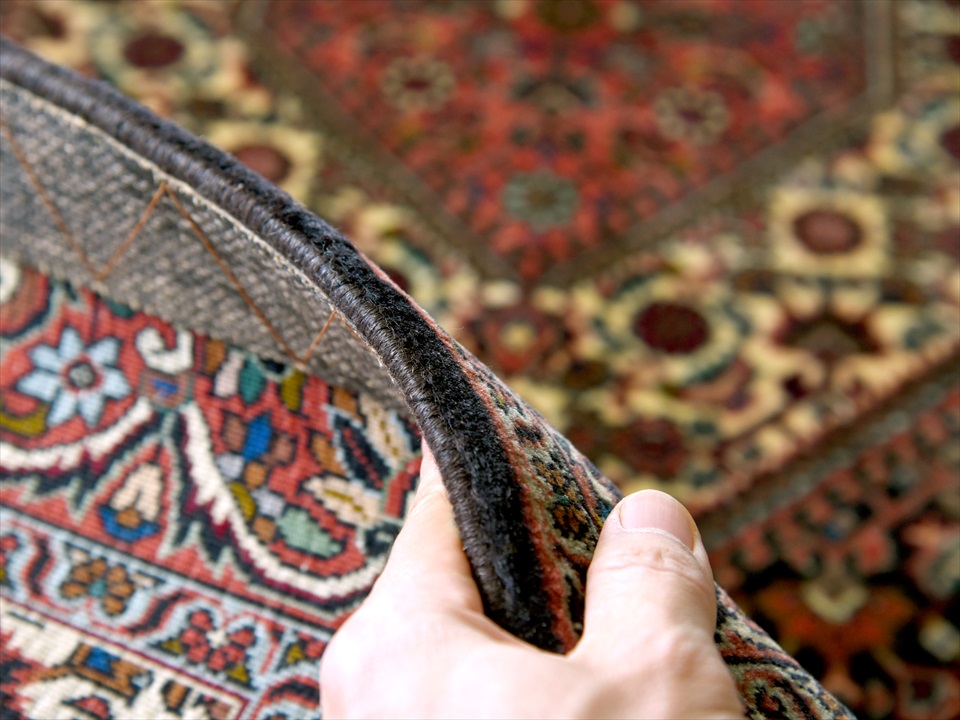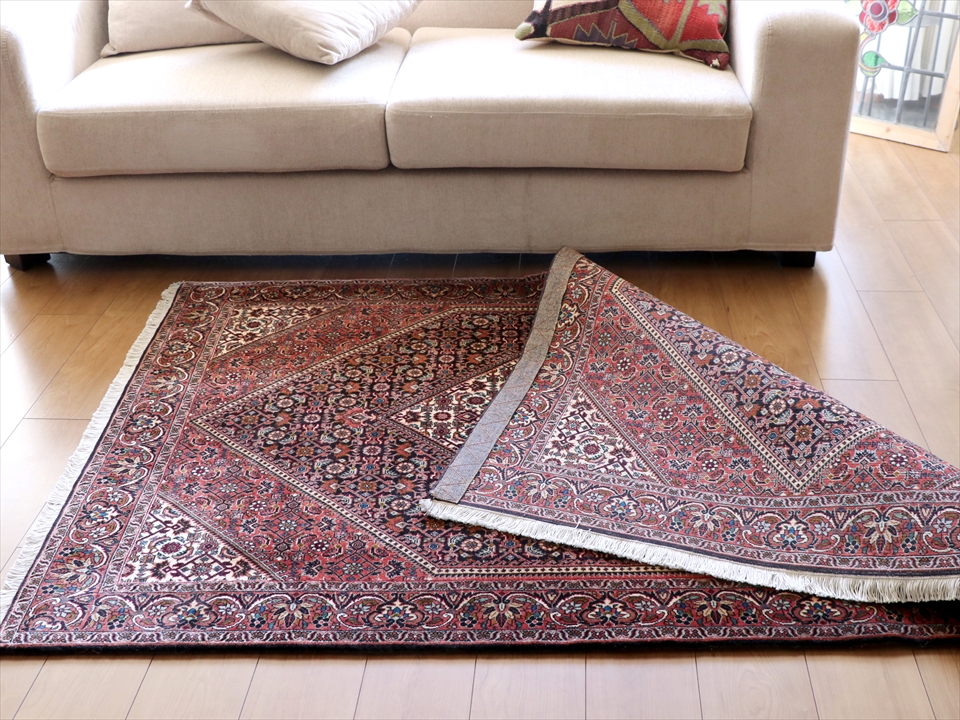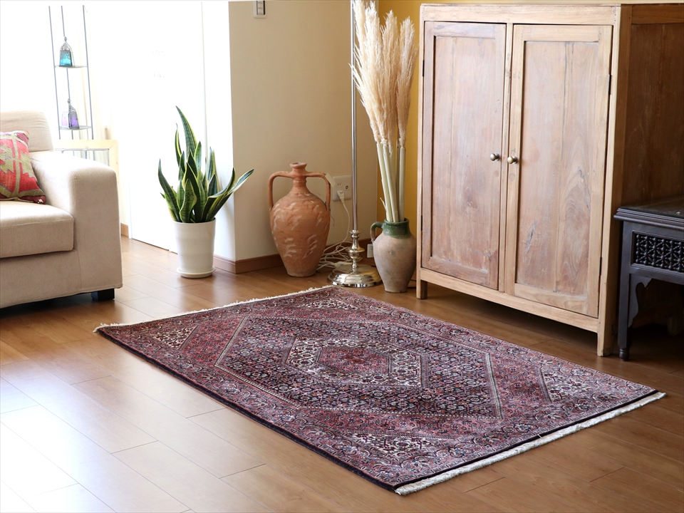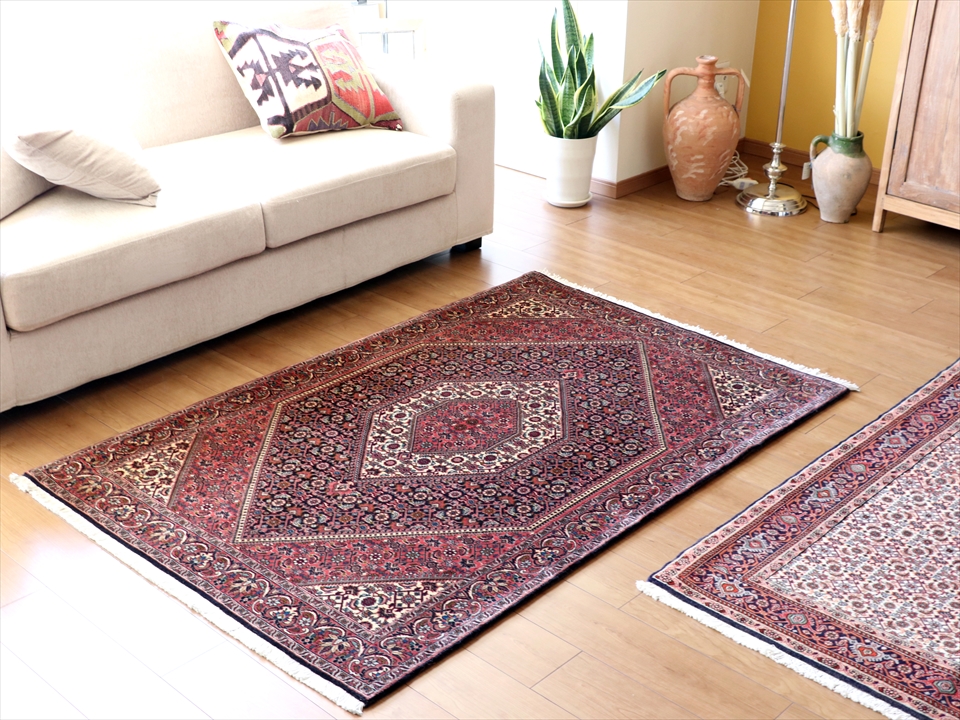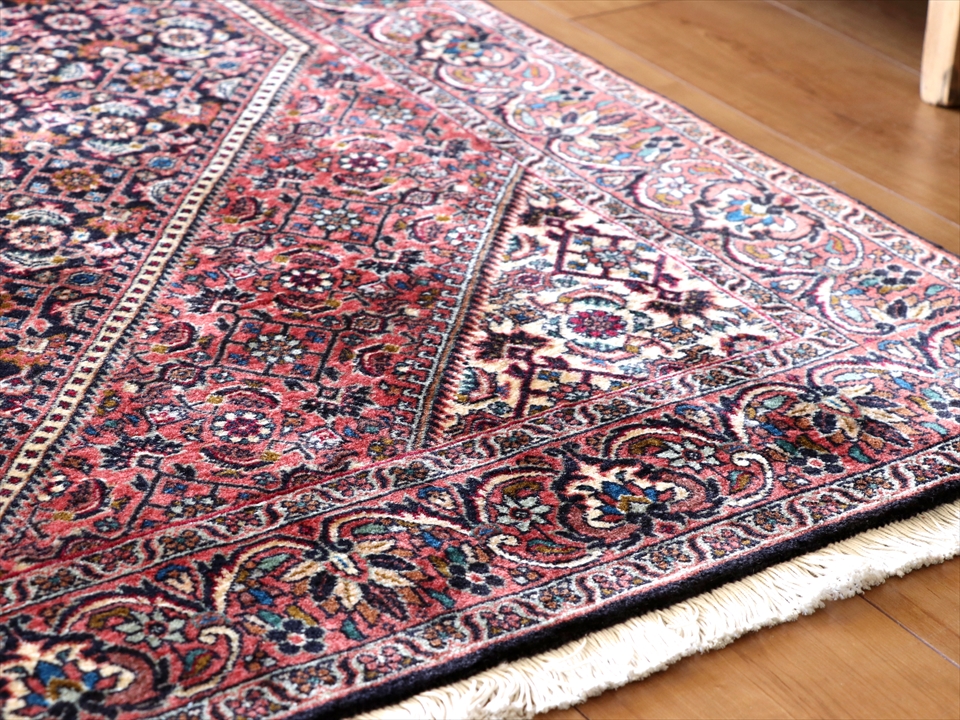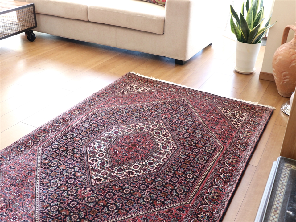 | イラン北西にある都市ビジャールで織られたじゅうたんです。この地域には主にクルド系の民族が住んでおり、絨毯はトルコ結びで作られています。ビジャールのじゅたんは織りの目が詰まっており、砂やほこりが入りにくいため耐久性に優れていると言われています。ビジャールのじゅうたんには多くのデザインがあり、こちらのじゅたんは直線的な六角形のメダリオンが特徴的です。メダリオンはブラックのベースにカラフルな小さな花の模様が散りばめれています。アイボリーの枠と四角がアクセントとなり六角形のデザインを引き立てています。 |