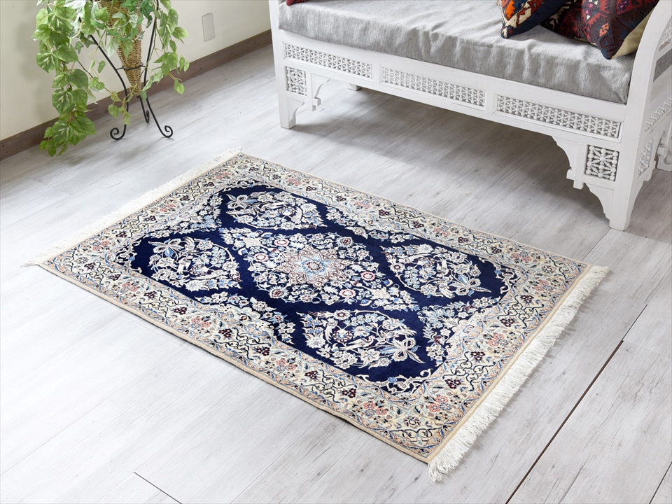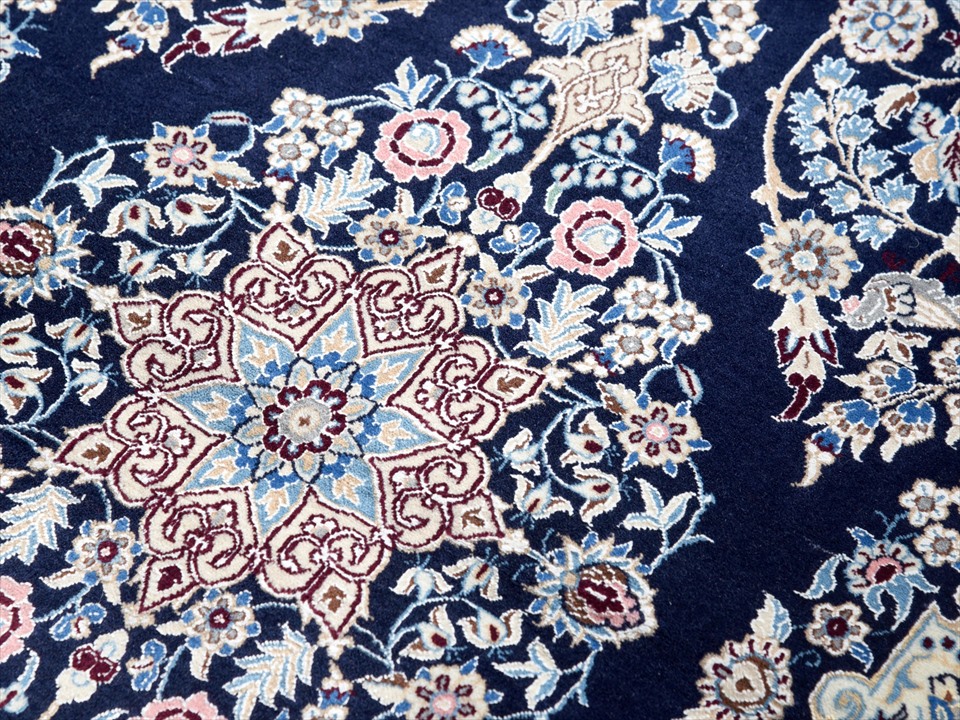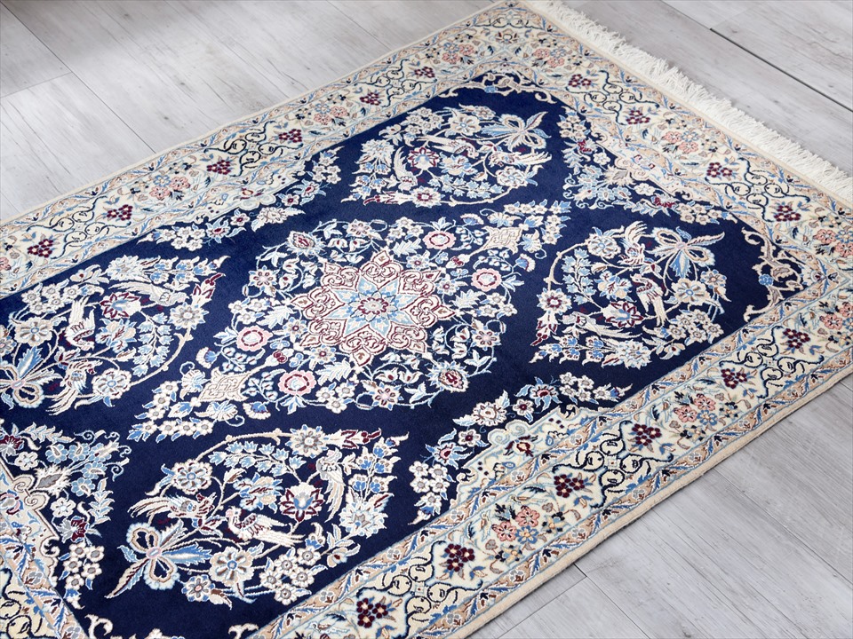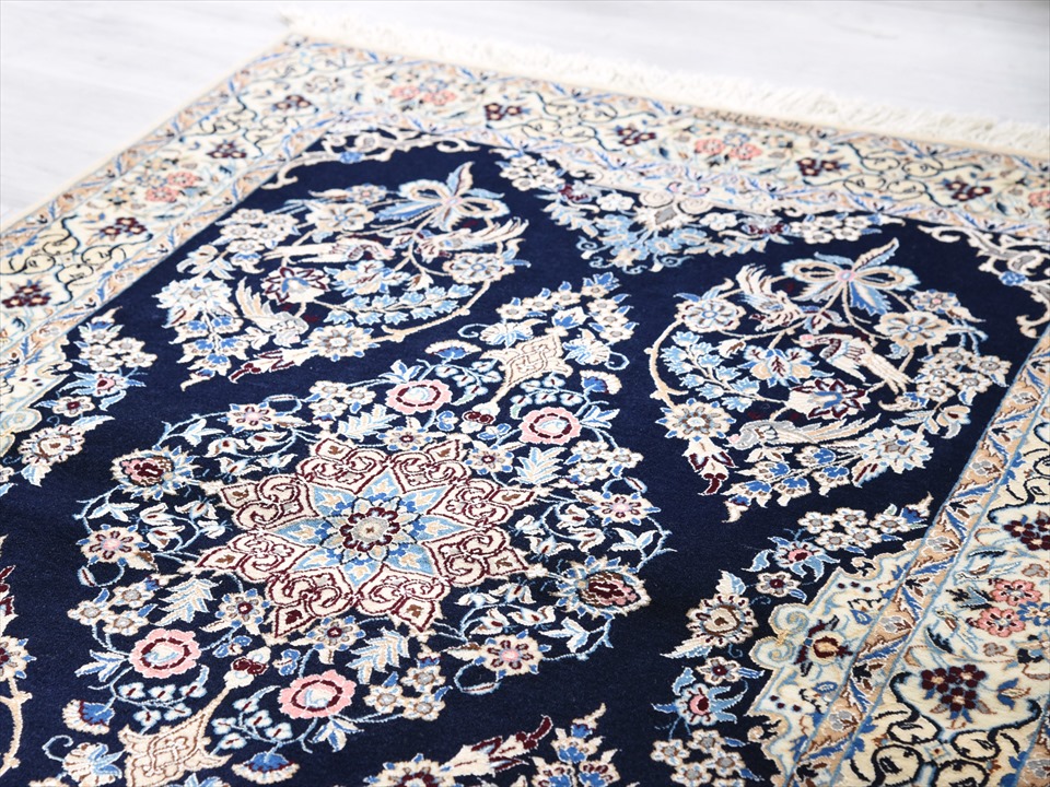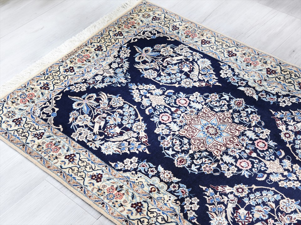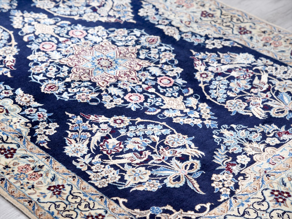 ペルシャ絨毯 ナイン産 ハビビアン工房 アクセントラグサイズ ネイビー/5つのフラワーメダリオン
