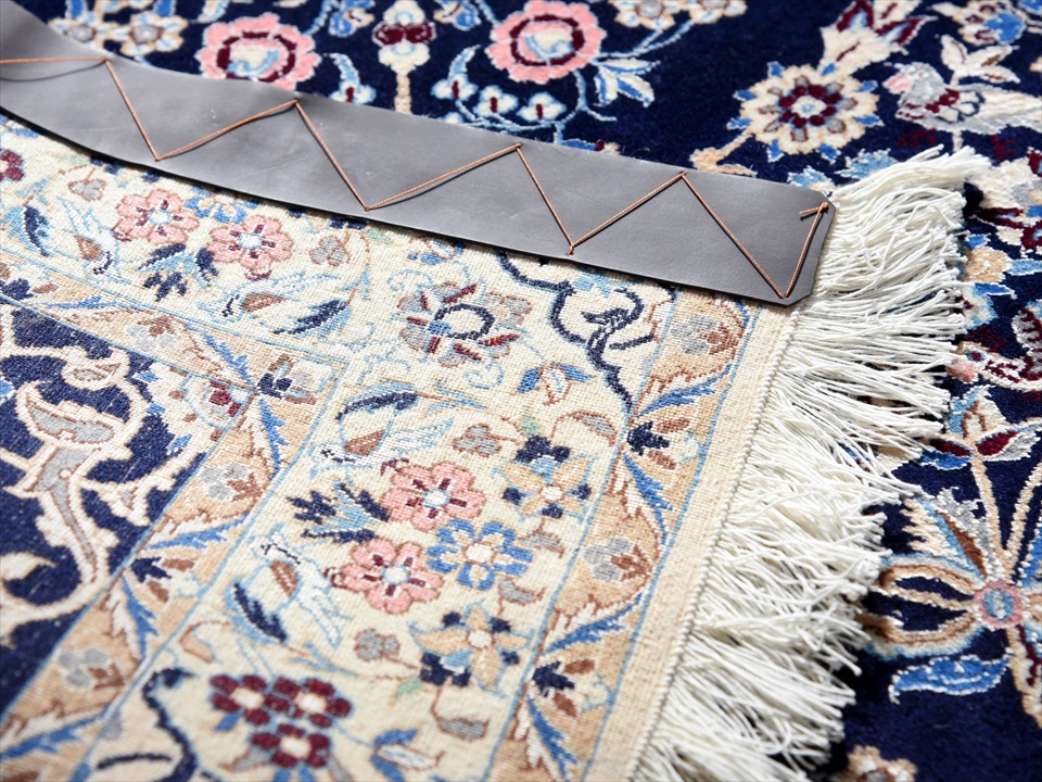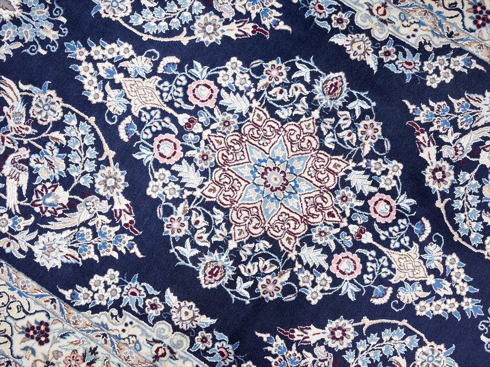 表面はツヤがあり滑らかな肌触り。10cmに80?90目ほどの細かな織りで引き締まった薄手のじゅうたんです、裏にはベルトが縫い付けられています。 【6La】ナインのじゅうたんにはペルシア語で「層」を意味するLaというグレードが存在します。9La、6La、4Laなど数字が細かくなるほど織も細かくなります。6Laは縦糸が6本で縒り合されているという意味です。 【ナイン Naein・Naien・Naeen】 地理的にイランのほぼ中央に位置し、エスファハーンの東へ150Km、東カヴィール砂漠の南端に位置するナインは周辺を砂漠に囲まれた小さなオアシス都市。エスファハーンの指導で始められ法衣制作をしていたハビビアンが、イスラーム建築の巨匠アルチャングのデザインを絨毯に織り込み、やがて、その品質が西欧で高い評価を受けるようになって、ナインは世界に知られる絨毯産地となりました。 |