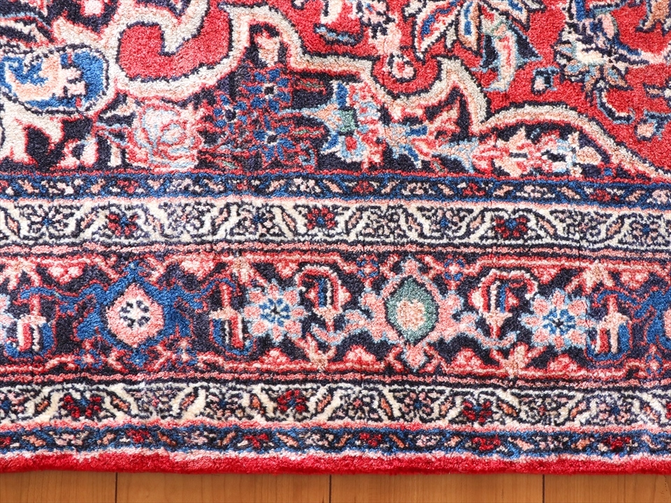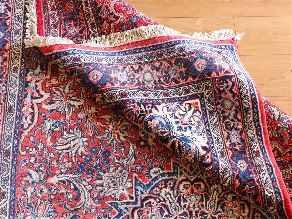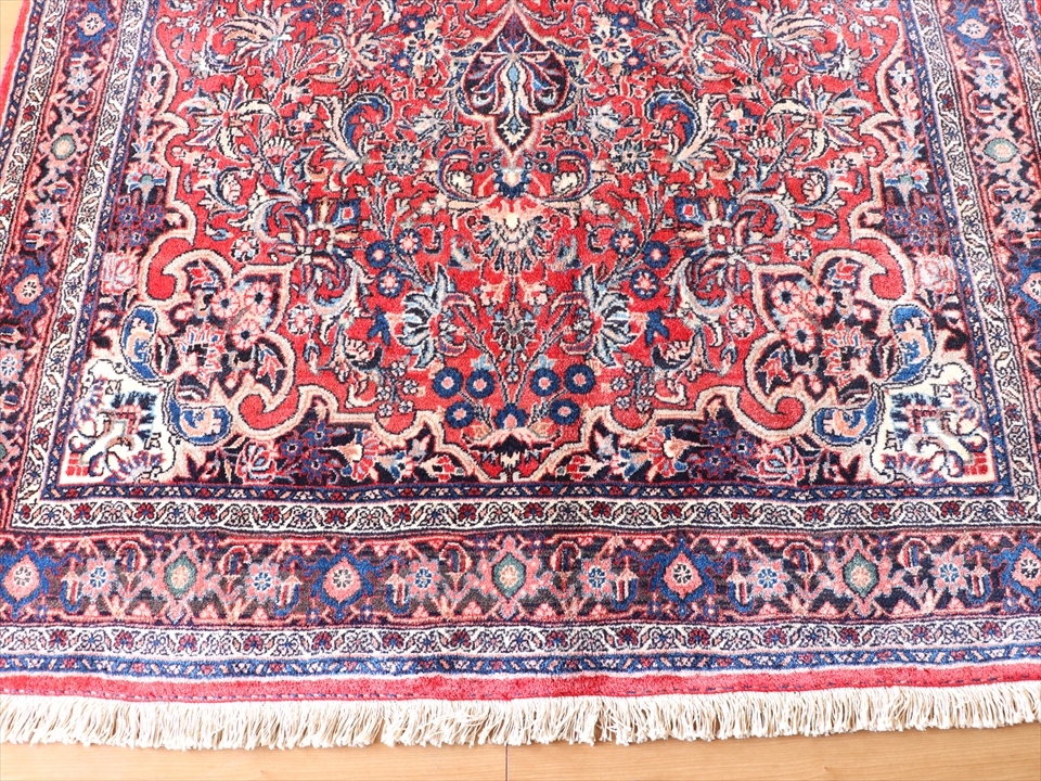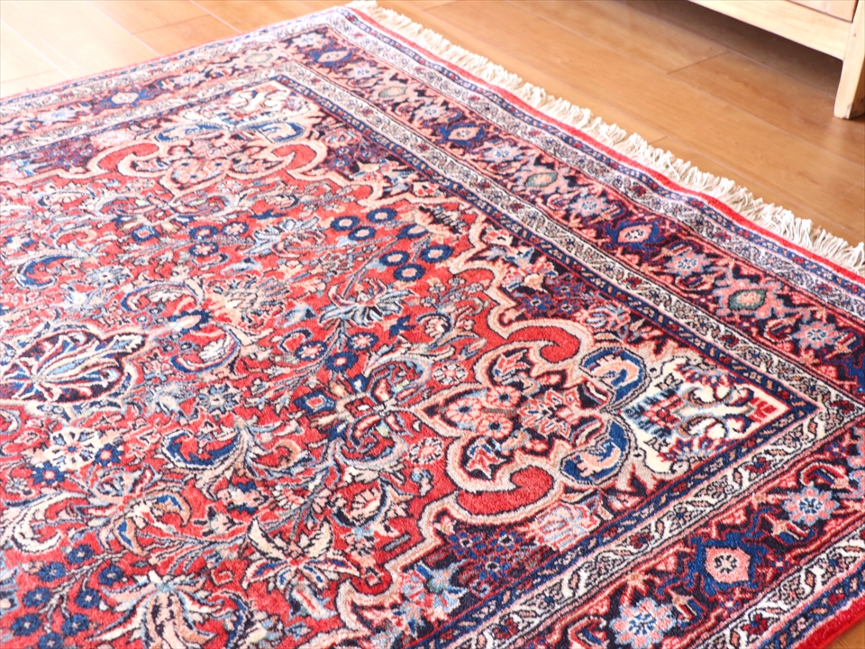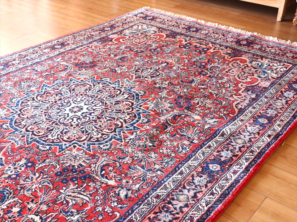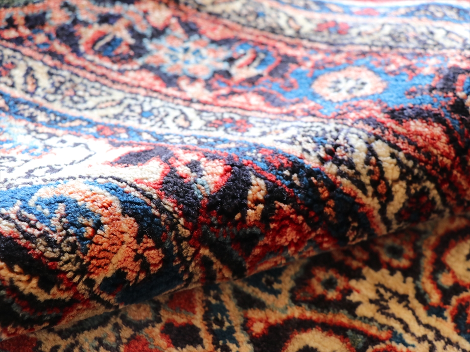 | イラン北西にある都市ビジャールで織られたじゅうたんです。この地域には主にクルド系の民族が住んでおり、絨毯はトルコ結びで作られています。ビジャールのじゅたんは織りの目が詰まっており、砂やほこりが入りにくいため耐久性に優れていると言われています。レッド・ブルーとカラフルな色使いです。中央の大きなモスクの天井を模したゴンバッティーメダリオンが特徴的です。 |