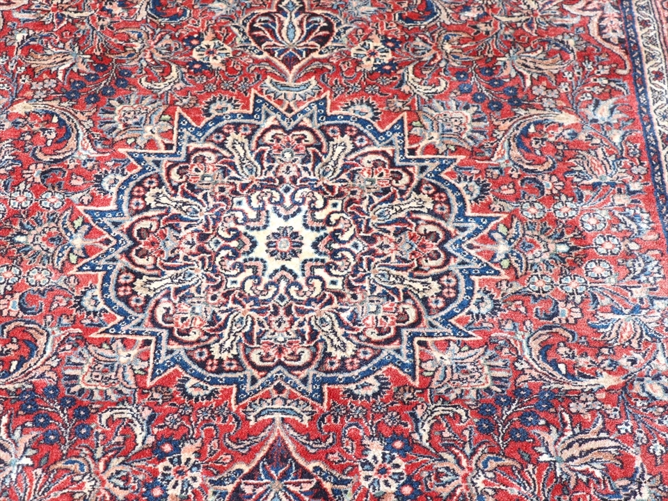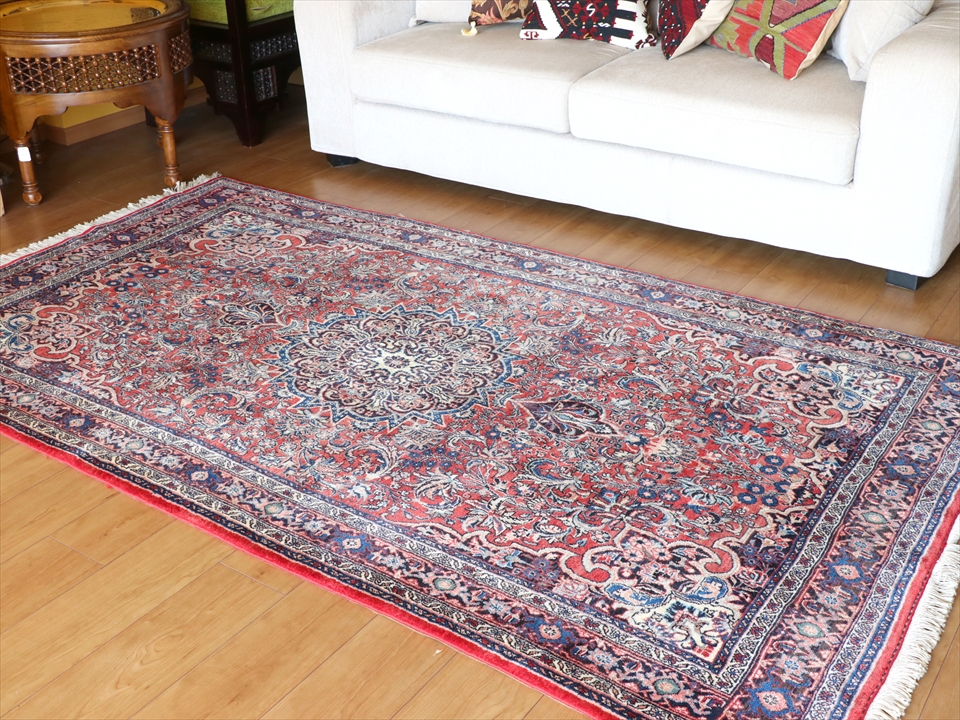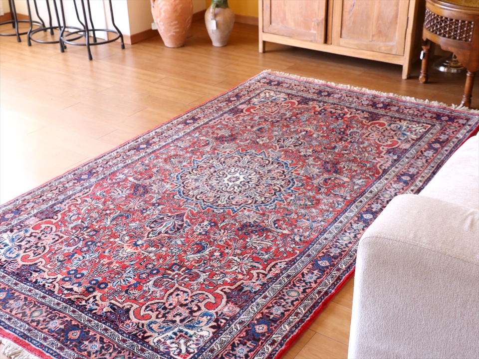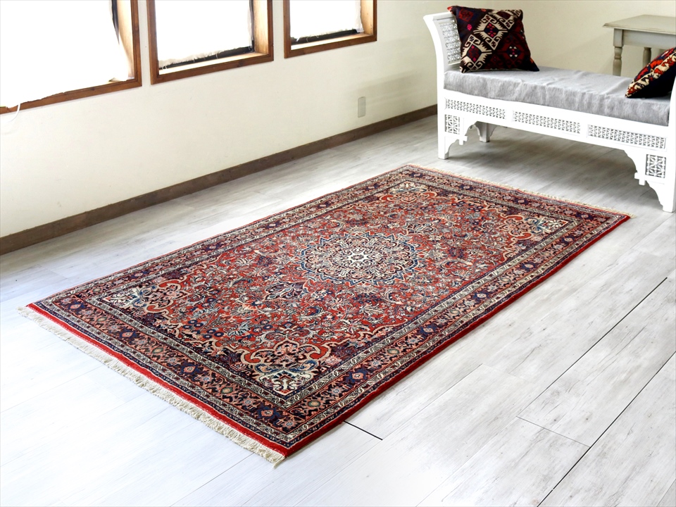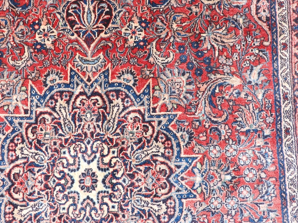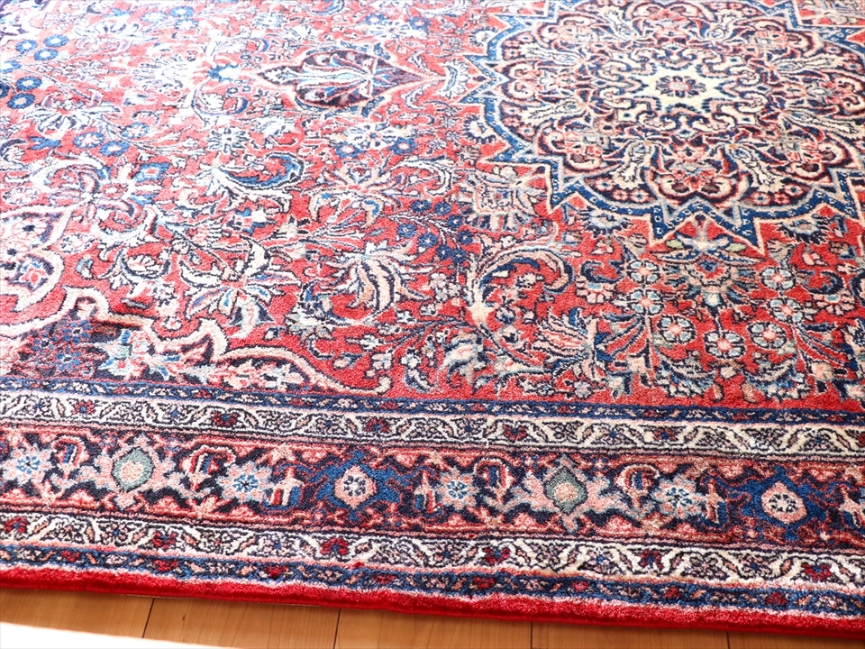 | イラン北西にある都市ビジャールで織られたじゅうたんです。この地域には主にクルド系の民族が住んでおり、絨毯はトルコ結びで作られています。ビジャールのじゅたんは織りの目が詰まっており、砂やほこりが入りにくいため耐久性に優れていると言われています。レッド・ブルーとカラフルな色使いです。中央の大きなモスクの天井を模したゴンバッティーメダリオンが特徴的です。 |
