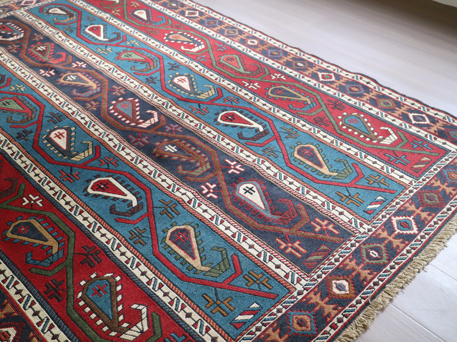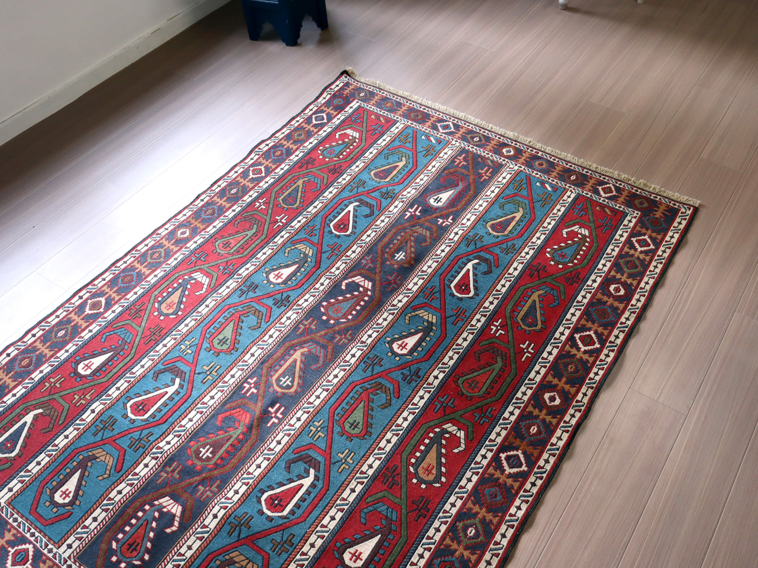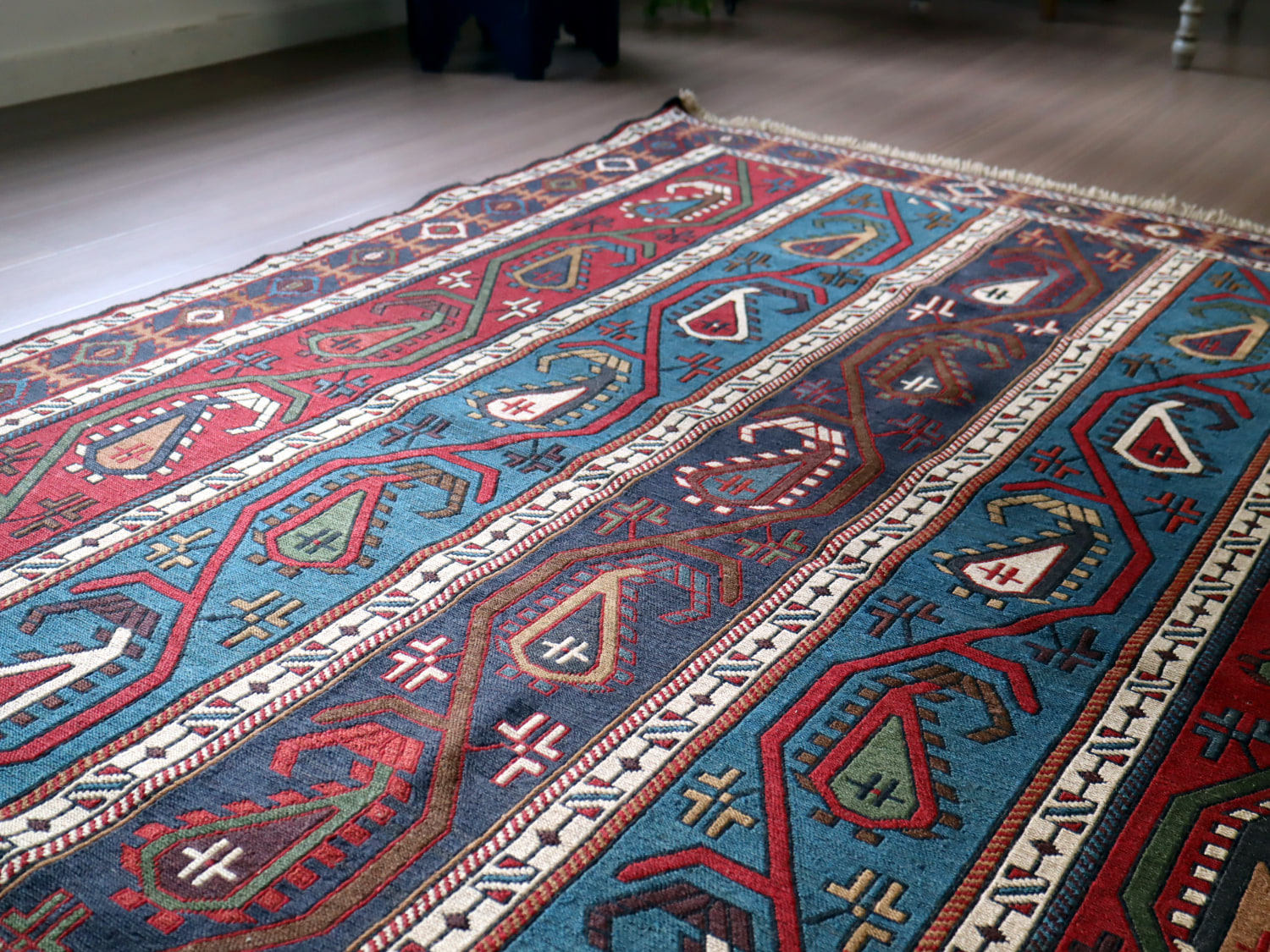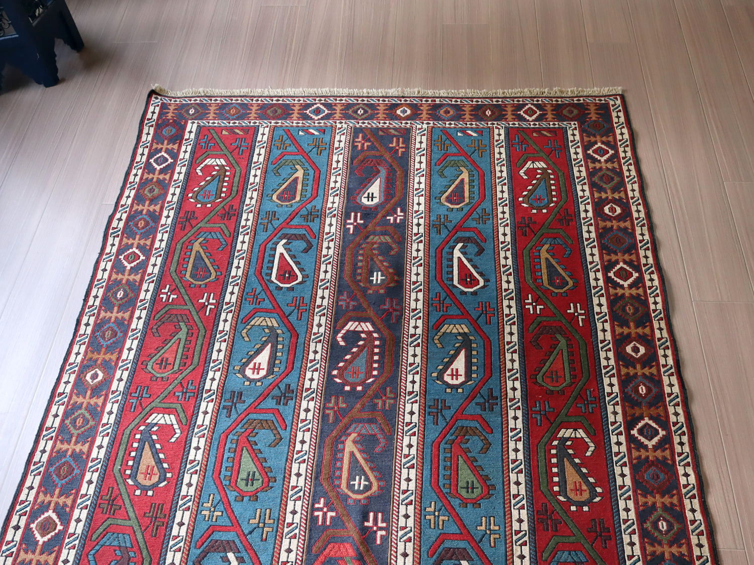 | 表面は刺繍のように見えますが、これは後から刺したものではなく、キリムを織るときに、縦糸と横糸のほかにもう一本飾り糸を前後しながら絡めて織ってゆくスマックという技法です。もちろん、通常のキリムよりも織る手間がかかりますから、それだけ高価なものということになりますが、実物をごらんになれば、お値段以上に価値あるものと満足していただけることと思います。 |