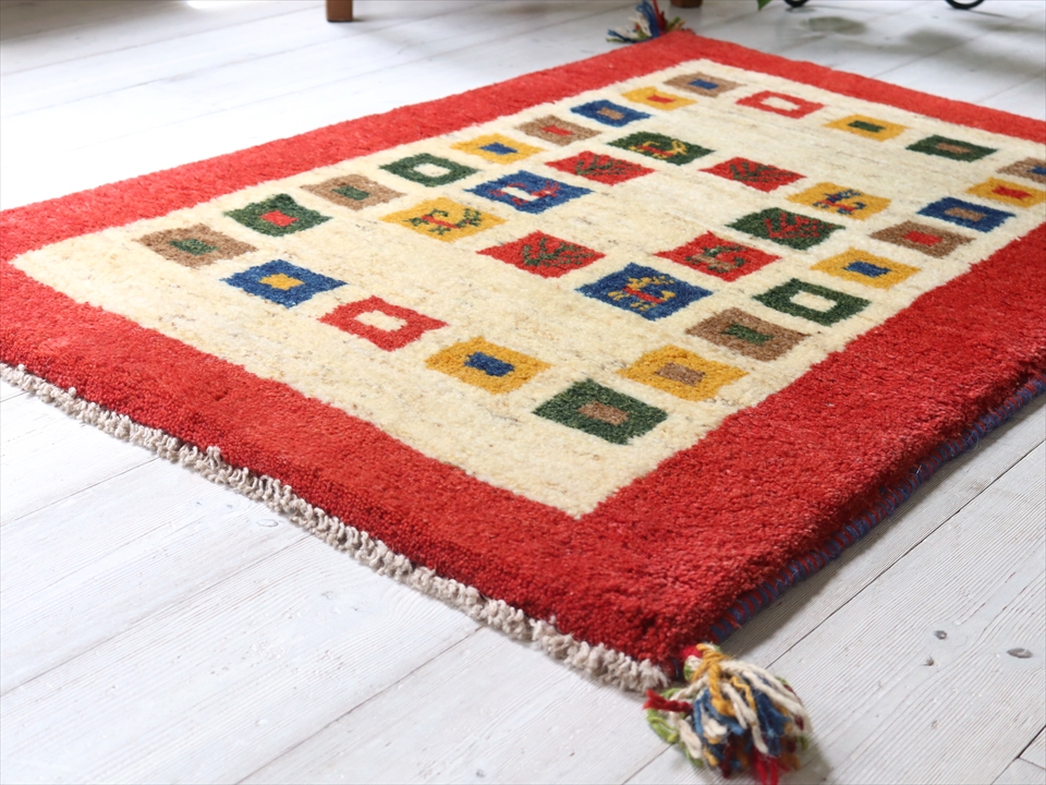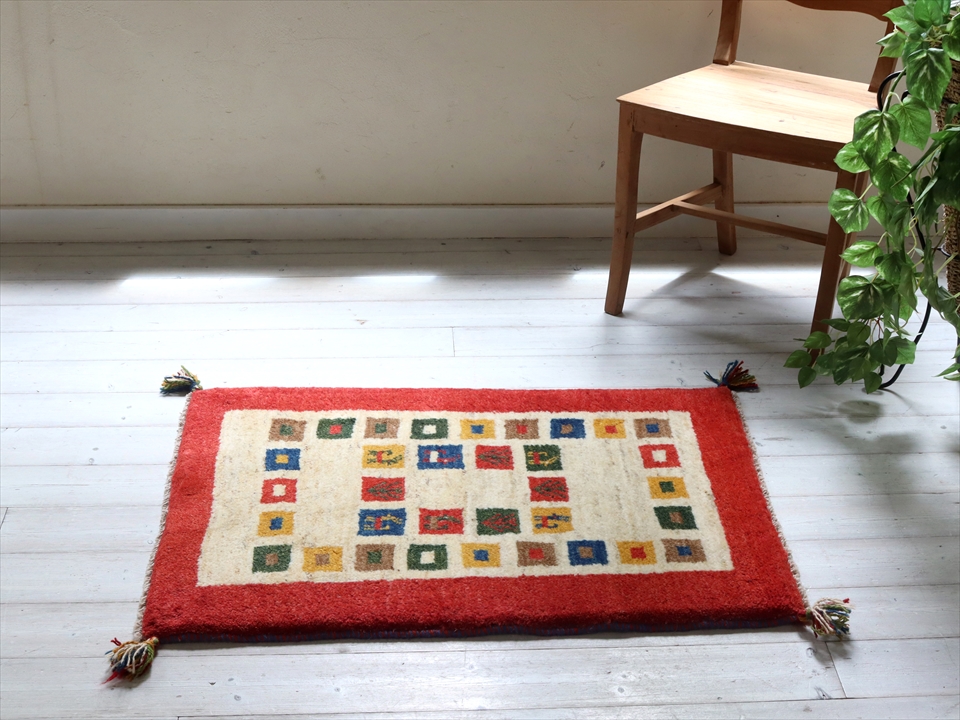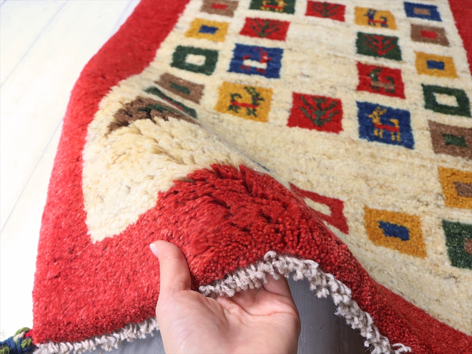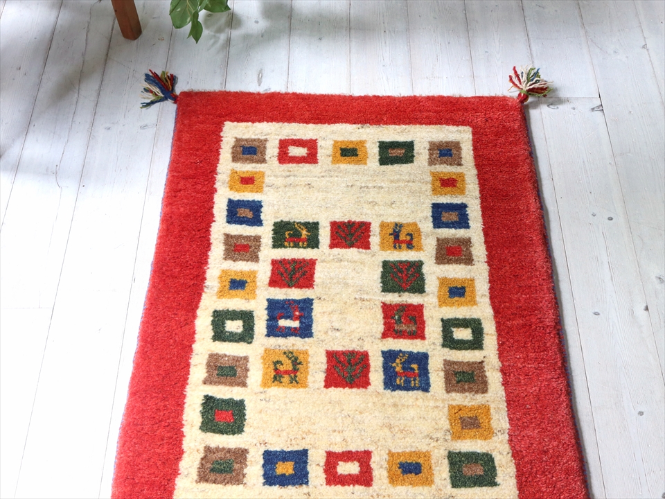 ギャッベ ふかふかの織り 玄関マットサイズ92×63cm イラン・カシュカイ族/ナチュラル&レッド