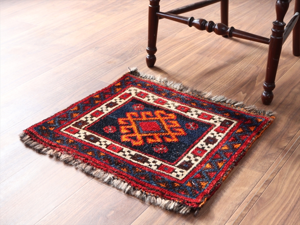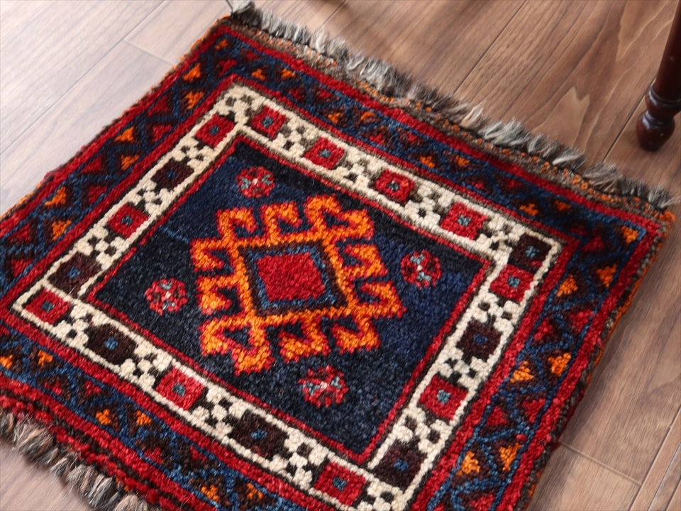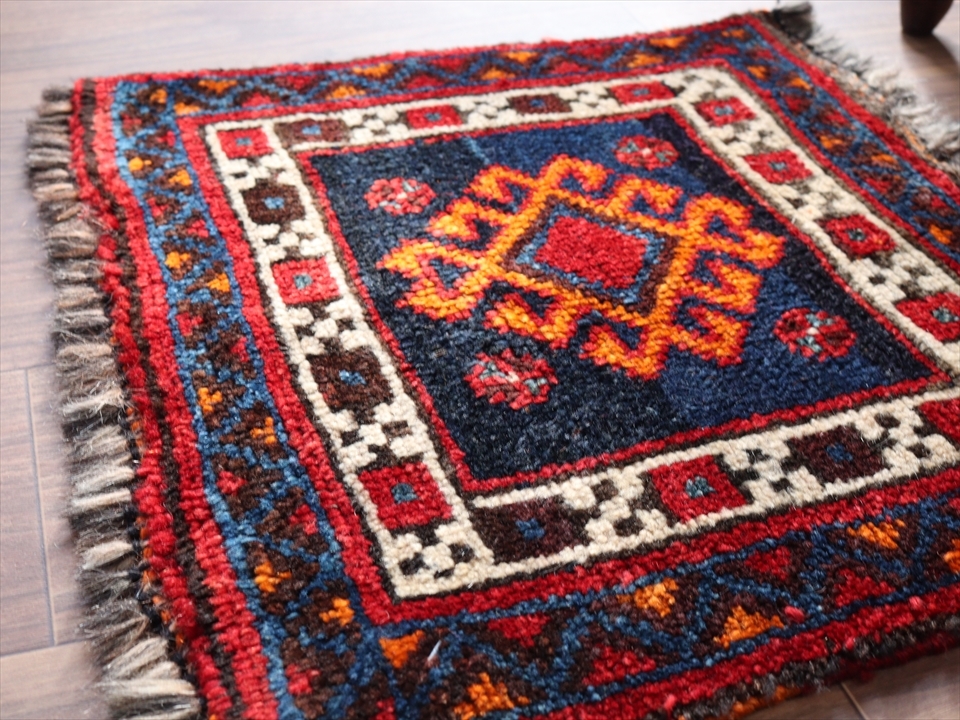ベシック(マフラシュ)のサイド・ミニカーペット43×48cm スクエア正方形・ネイビーブルー・オレンジ/サソリのモチーフ