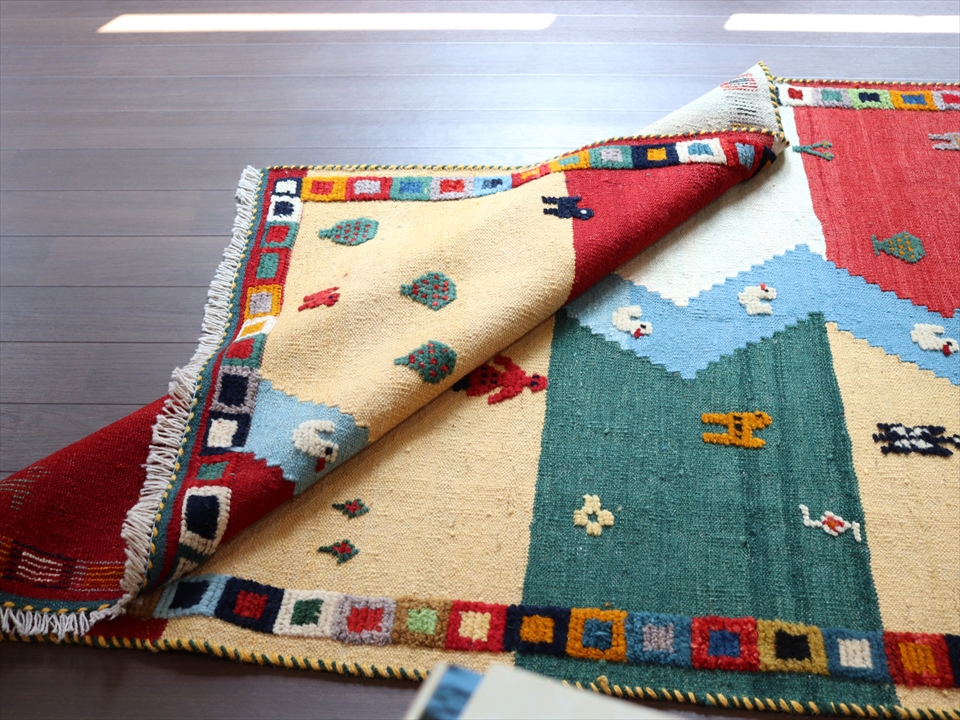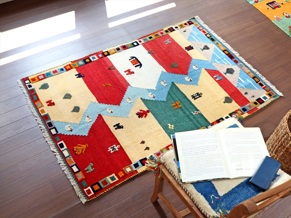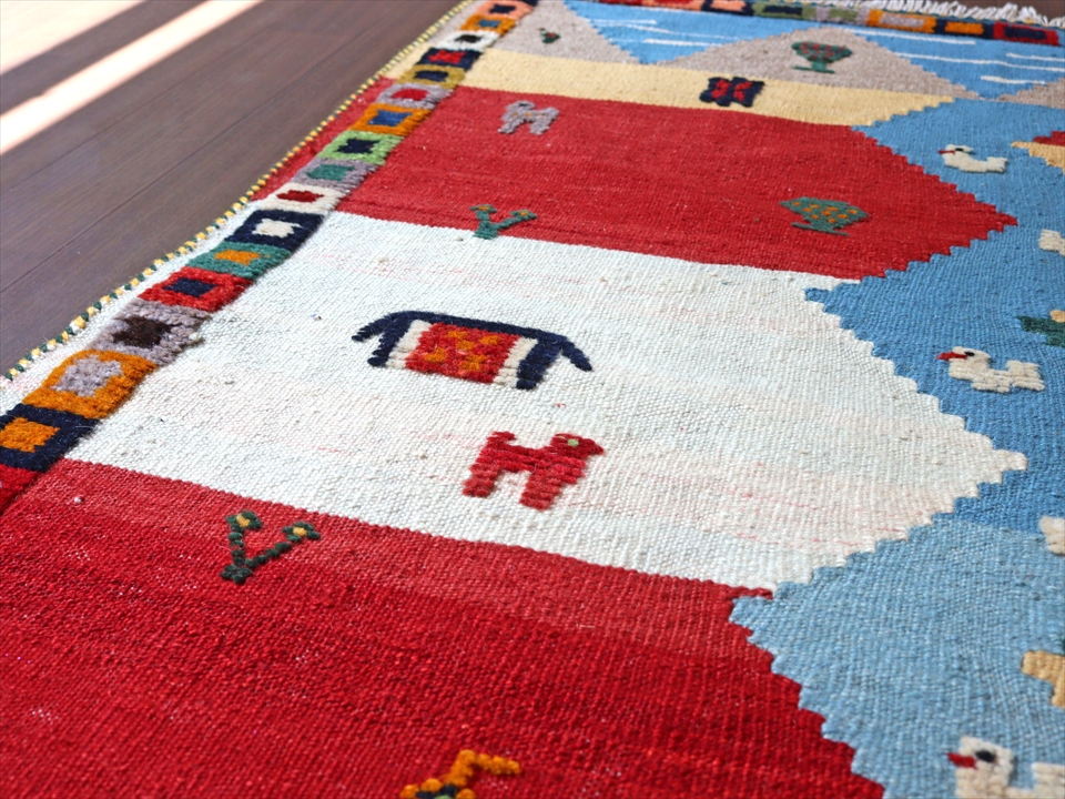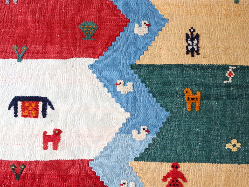 | イラン南西部、ザクロス山脈の麓に暮らすカシュカイ族の楽しいキリム。現在でも遊牧生活を続けているカシュカイ族の生活の様子とのどかな風景が描かれています。 キリムのデザインに登場するのは、動物や鳥、華やかに着飾った女の子たち、そして、大家族が暮らす大きなテント。それぞれのモチーフと縁取りのタイルは、平織りのキリムの中に、パイル(毛足)のある立体的なカーペット織りで織り込まれ立体的になっていて、今にも動き出しそうに生き生きと描かれています。敷物として使うほか、タペストリーとして飾ってもユニークです。 |