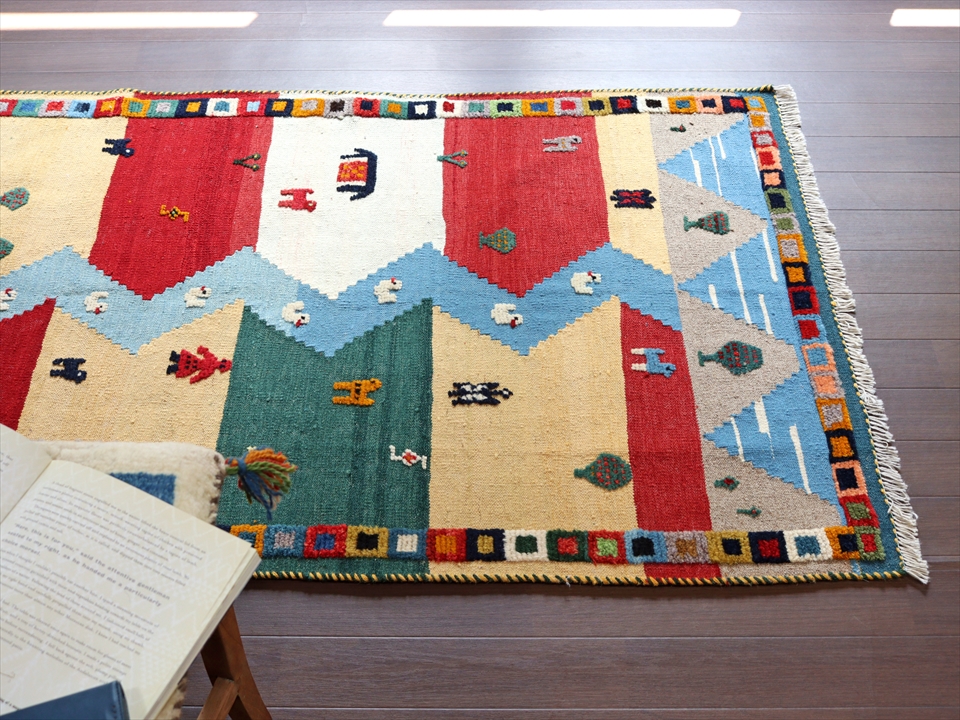 ギャッベキリム 遊牧民の織る風景のラグ147×97cm 水鳥のいる川